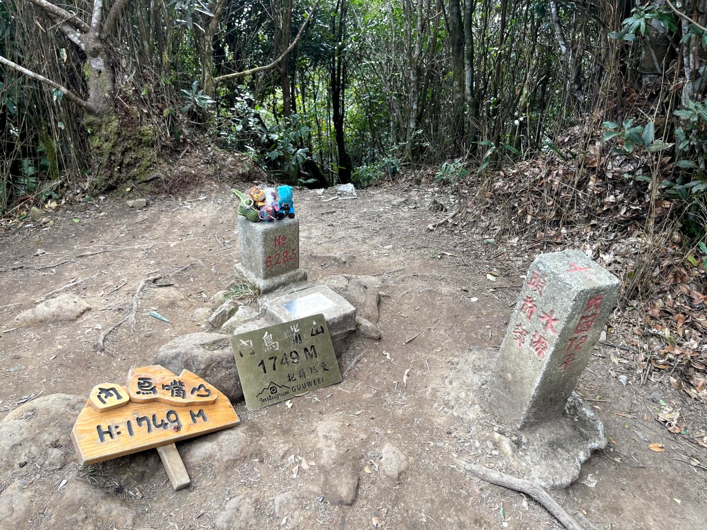 內鳥嘴山三角點,展望不開只有局部。休息後,往回走,先經過等高線圖的E點、D點、C點、過F點,貴妃山岔的G點,而來到三岔路口,其實這一天整天的氣溫很低,來到三岔路口我(Gosen)突然覺得體力耗盡,很想要進食,因此決定走到那結山再吃。
