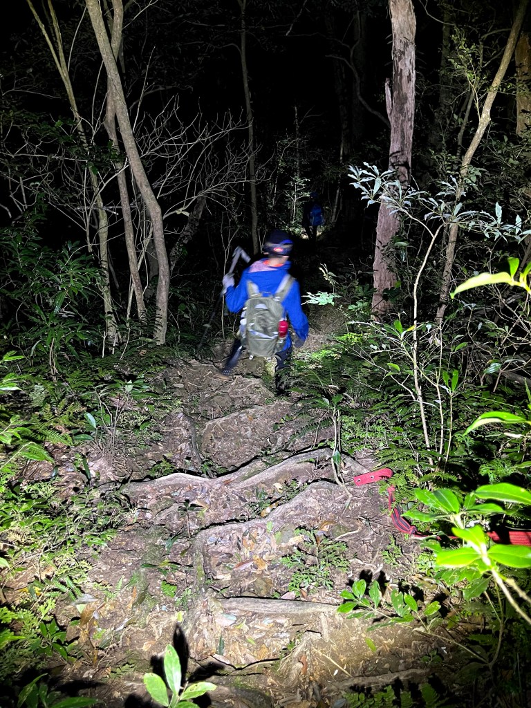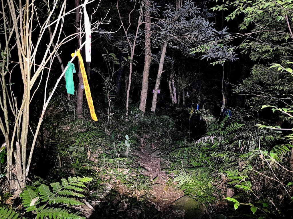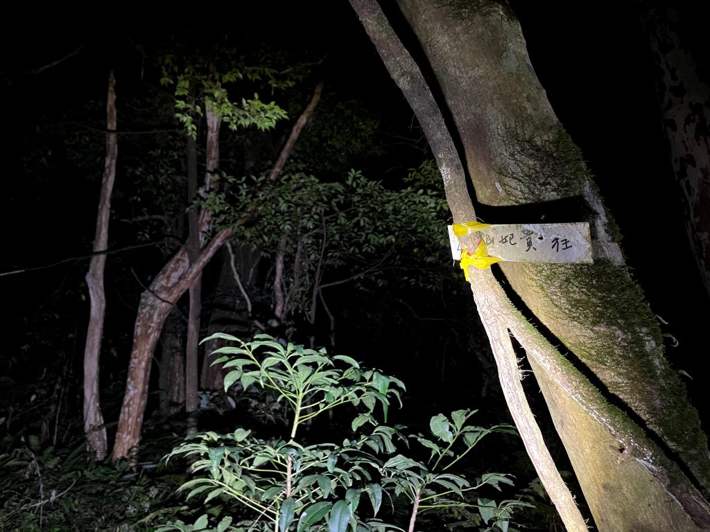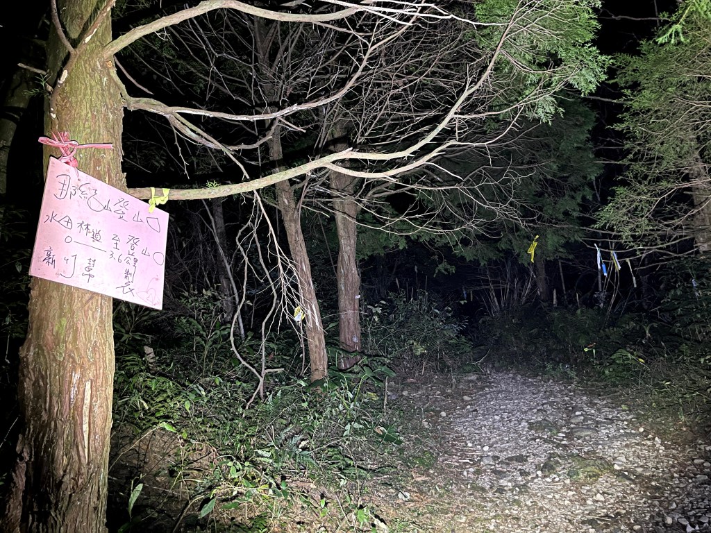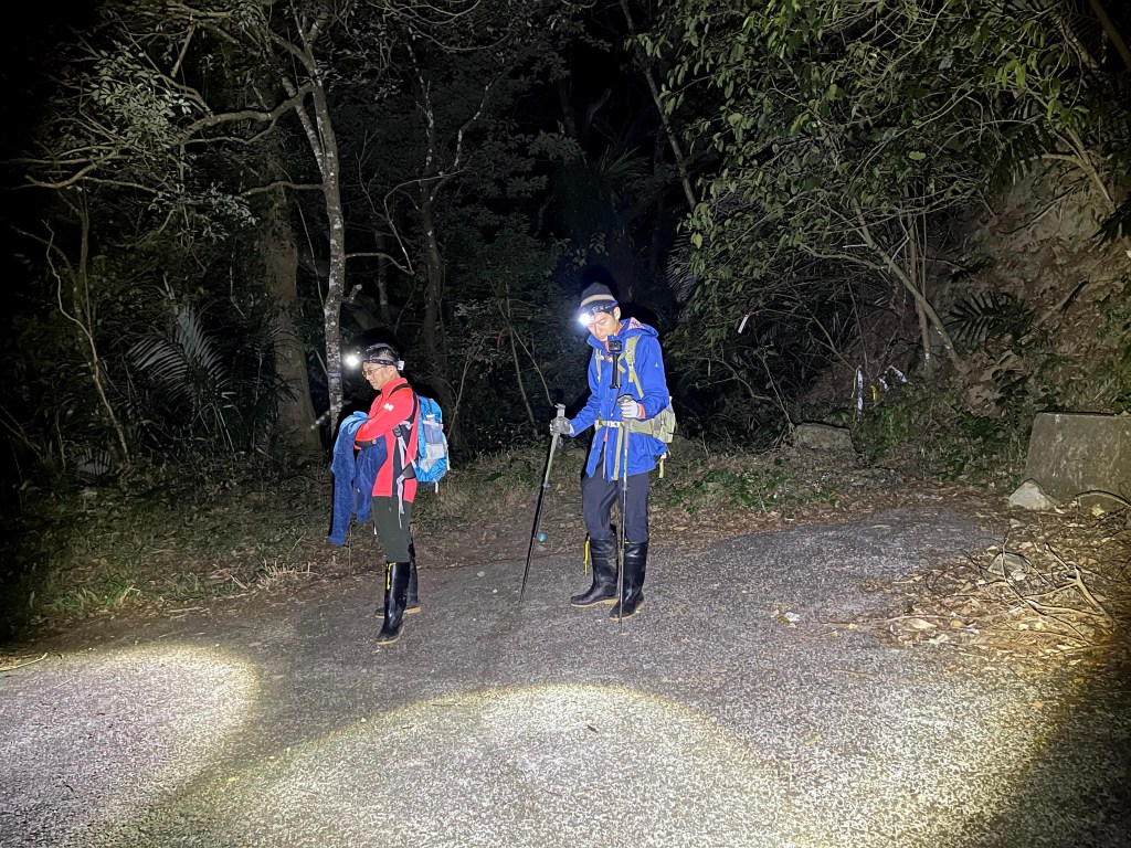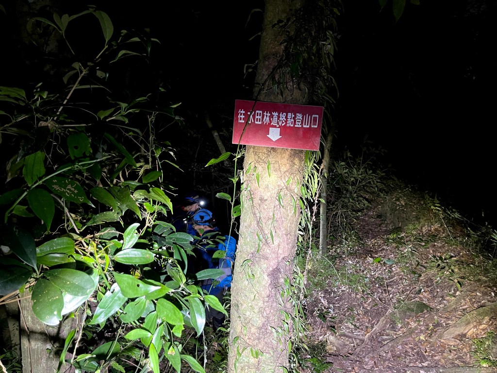 由那結山回程,再走一次倒N路徑回到三岔路口,各人取回各自的背包,繼續往下接上外鳥嘴山與林道岔,也就是等高線圖中的外鳥嘴岔,這時天色已黑,因此就放棄往外鳥嘴山走,直接往水田林道方向,再次經過貴妃山岔、九芎奇樹,而接上水田林道盡頭的3.6K,再沿著水田林道走3.6K約一小時後回到停車場。