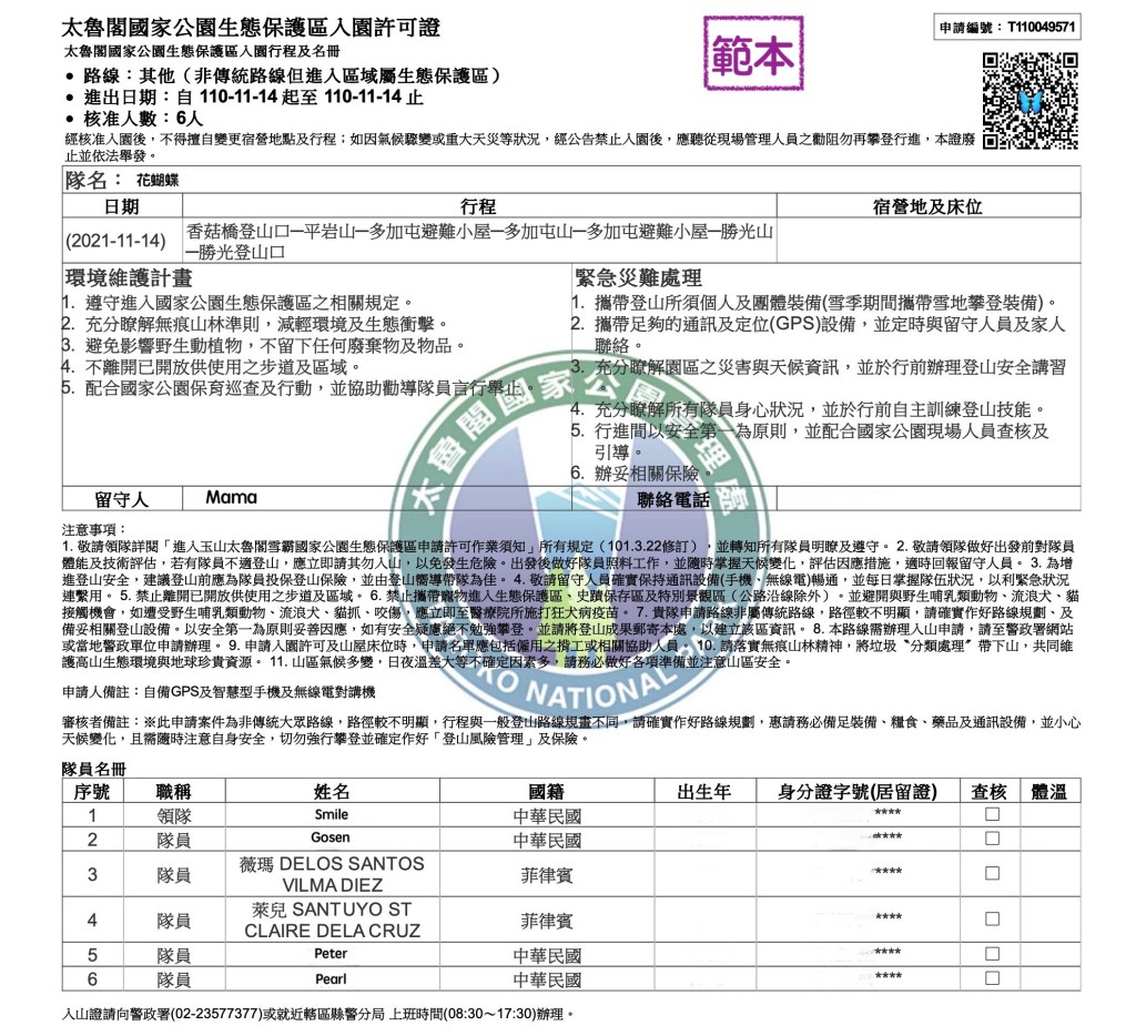 入園證的部份,則需由台灣國家公園入園入山線上申請服務網,向太魯閣國家公園申請「其他」項目,且依序填入您的資料及路線(可參考我們入園證的路線)即可。