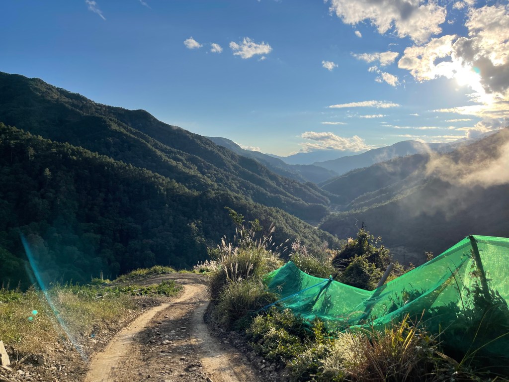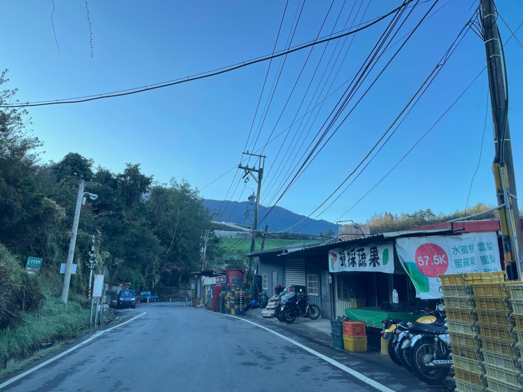 我們有兩台車,一台放置在勝光登山口(台7甲50K),再搭另一台車,開至台7甲57.6K處後左轉進入往青葉農場,開1.7K的產業道路過青葉農場後續開0.5K,經一小段狹窄果園產道,抵達產道底左側有空地可停車,在停車處會看到有一高聳的基地台,約可停3台車左右。完登後,再由勝光登山口開車回來取車,或可另安排接駁車來接駁,當然,神腿級的朋友,也可以沿台7甲多走7.6K的公路,再加上2.2K靑葉農場的產業道路形成O型。嗯!聽起來不錯,不過,我們還是乖乖地縱走就好。