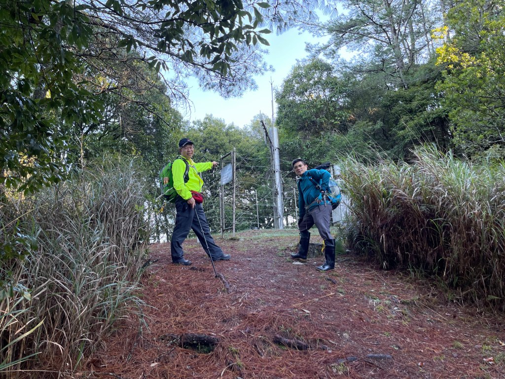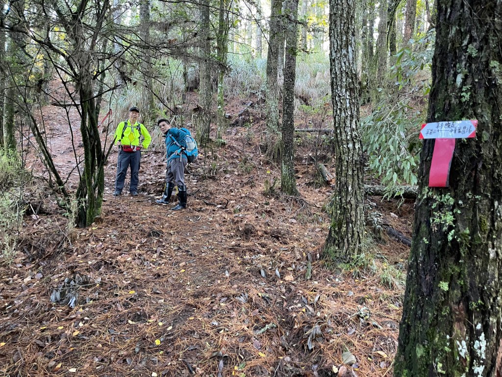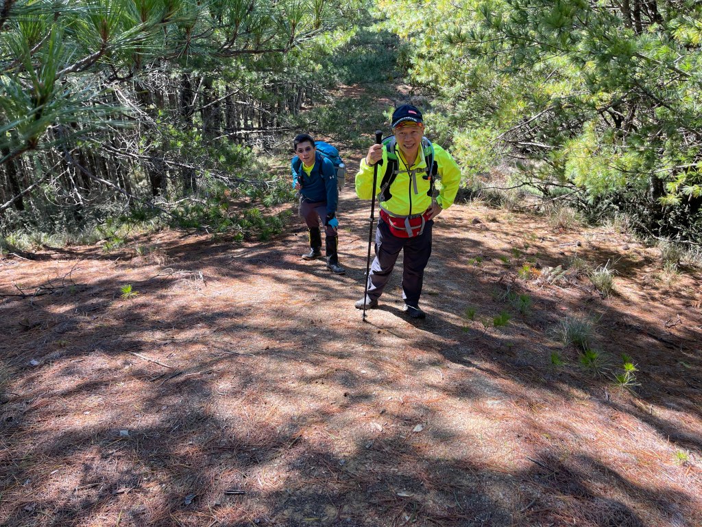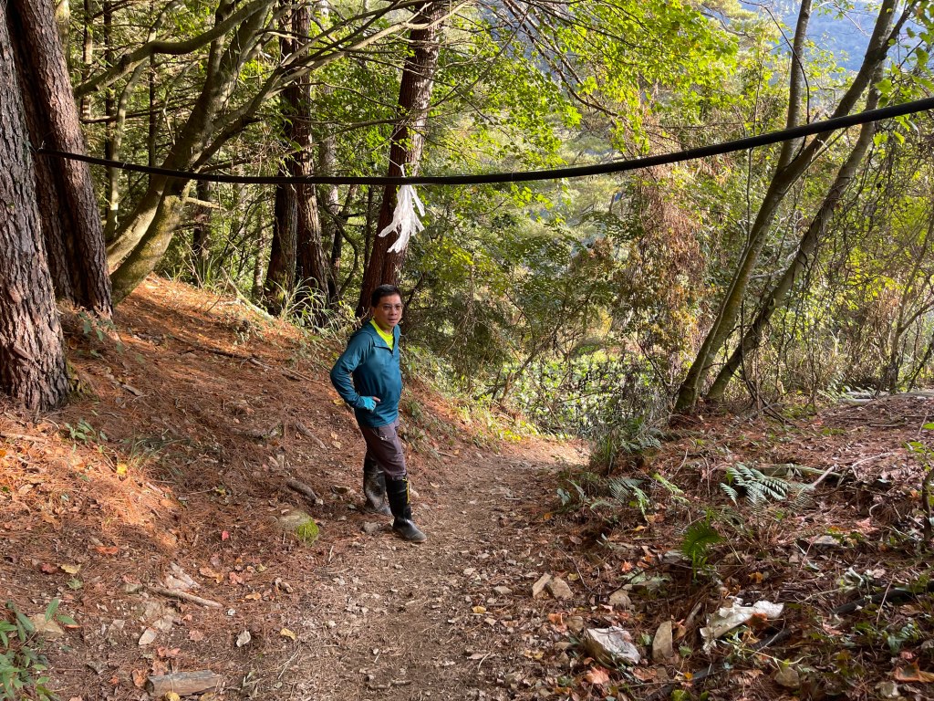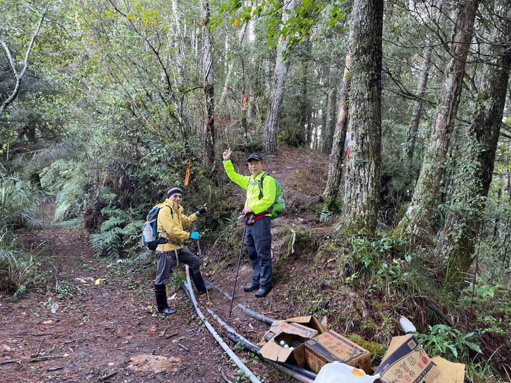 走到勝光山/710林道岔,不要右轉林道,直接陡上,200m的距離即可到勝光山,發現勝光山的三角點已經遺失⚠️,我們三人稍事休息一下即續行,再走約400m即抵防火巷岔,但防火巷已用繩索圍住,因此就在此左轉沿著陡下步道路徑而走,陡下500m的里程會看到藍色帆布大水池,就表示菜園產業道路終點到了!這裡距離勝光登山口還有1.2K,Smile愈走愈快,我也不想輸她,跟著走快!Peter說他慢慢走,不要跟著我們忽快忽慢!Smile與我倆人在16:13回到勝光登山口,Peter在10分鐘後也回到登山口與我們會合。