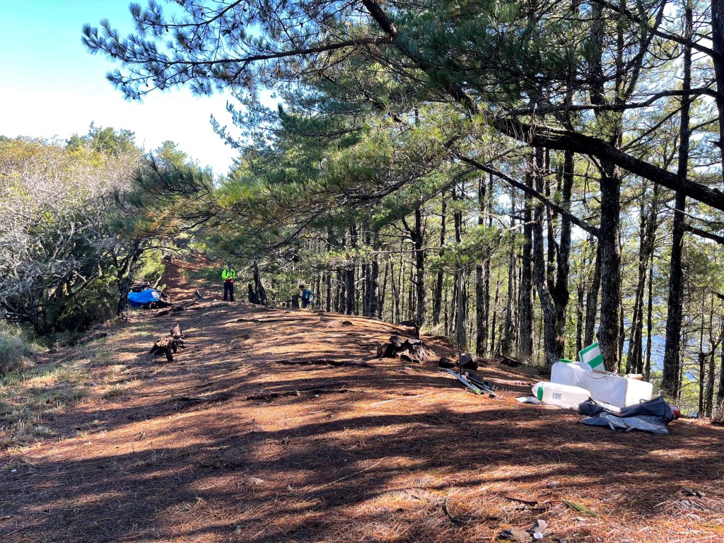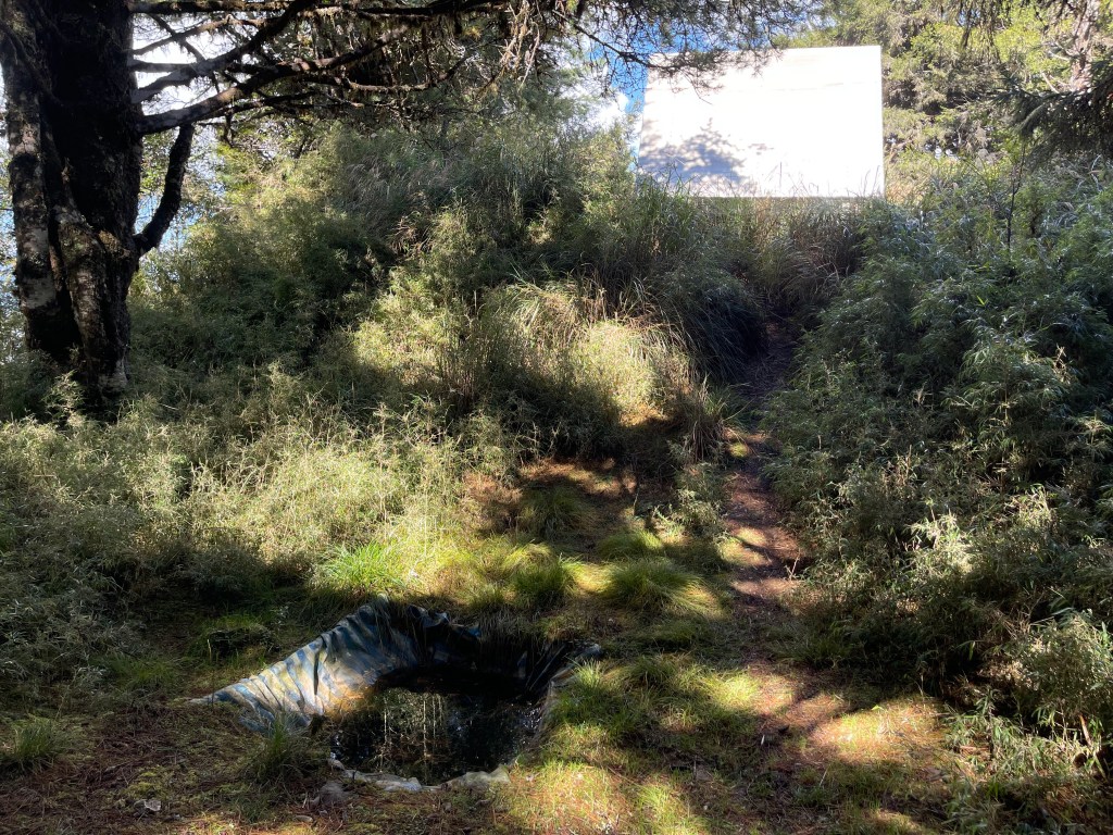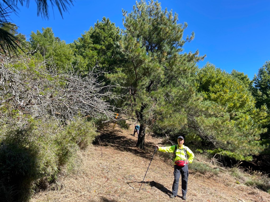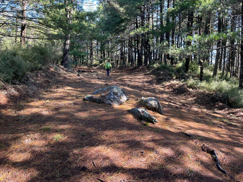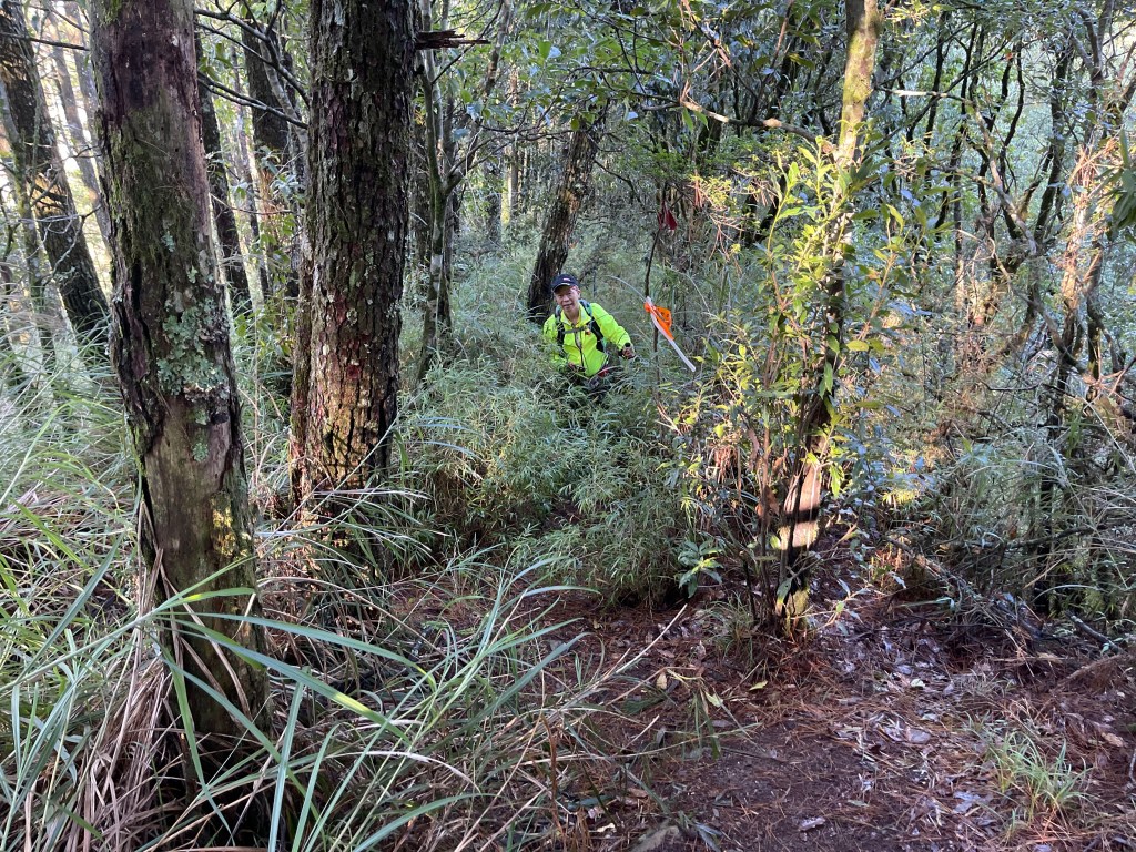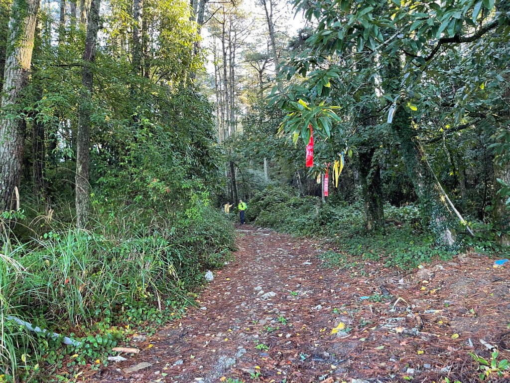 走到勝光山/710林道岔,不要右轉林道,直接陡上,200m的距離即可到勝光山,發現勝光山的三角點已經遺失⚠️,我們三人稍事休息一下即續行,再走約400m即抵防火巷岔,但防火巷已用繩索圍住,因此就在此左轉沿著陡下步道路徑而走,陡下500m的里程會看到藍色帆布大水池,就表示菜園產業道路終點到了!這裡距離勝光登山口還有1.2K,Smile愈走愈快,我也不想輸她,跟著走快!Peter說他慢慢走,不要跟著我們忽快忽慢!Smile與我倆人在16:13回到勝光登山口,Peter在10分鐘後也回到登山口與我們會合。