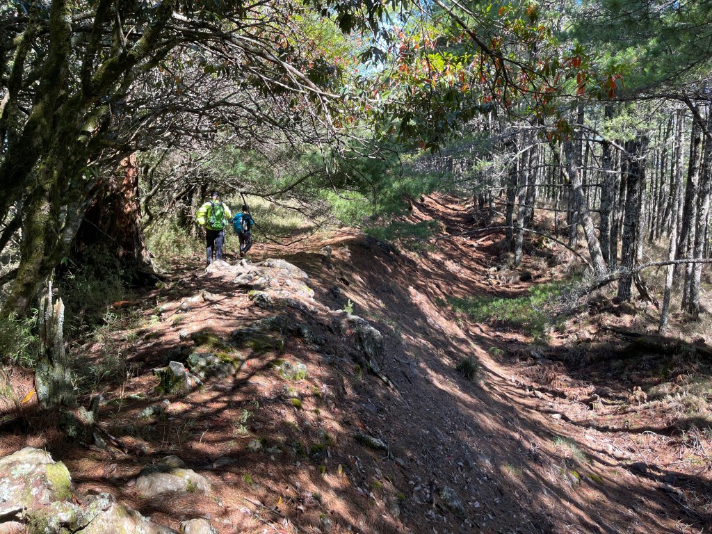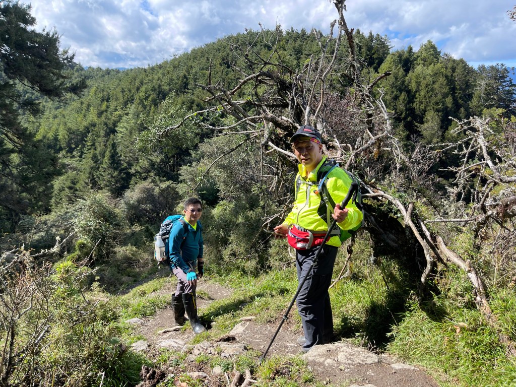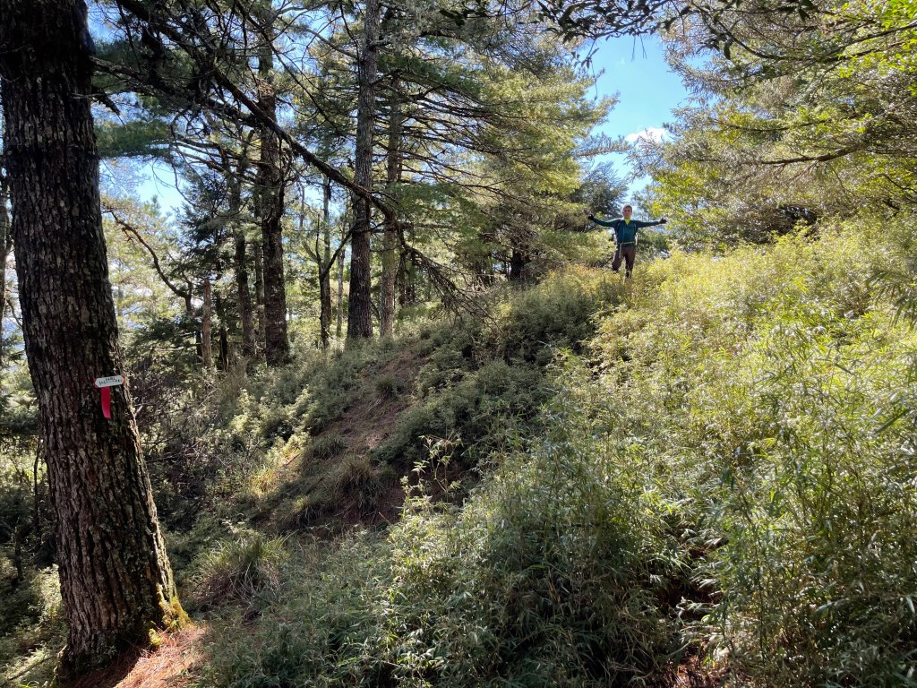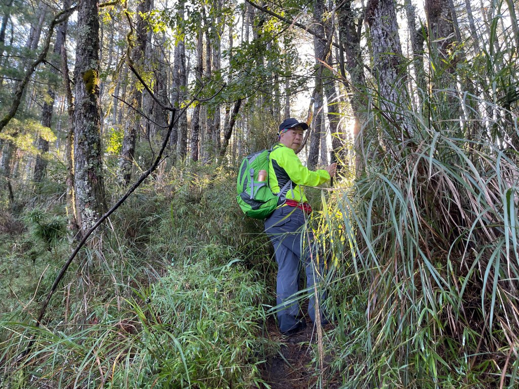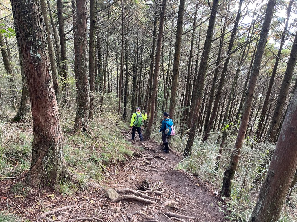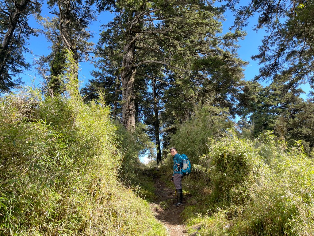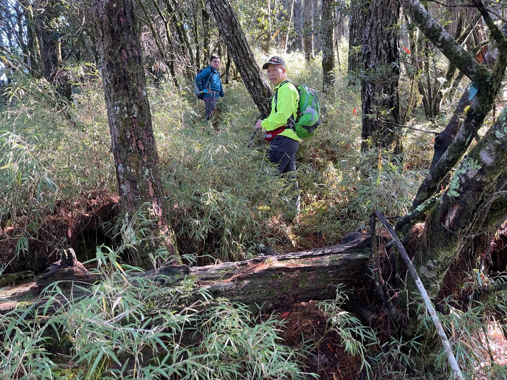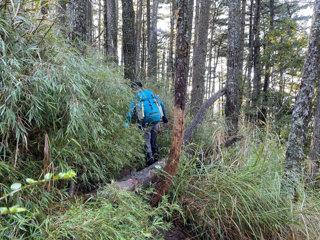 接著在箭竹林中陡上穿梭,跨越不少倒木,過平岩池不久後,接上寬大防火巷的稜線,在此康莊大道上,Peter又開始他登山多年的經驗步伐,不疾不徐的速度,但整體走起來算得上頗快,Smile在這種像天梯的路徑上,遠遠一看到要略為陡上還是會唉嚎一下。往右側看去,中央尖山不時露臉,由此到平岩山前都是優美的路徑。