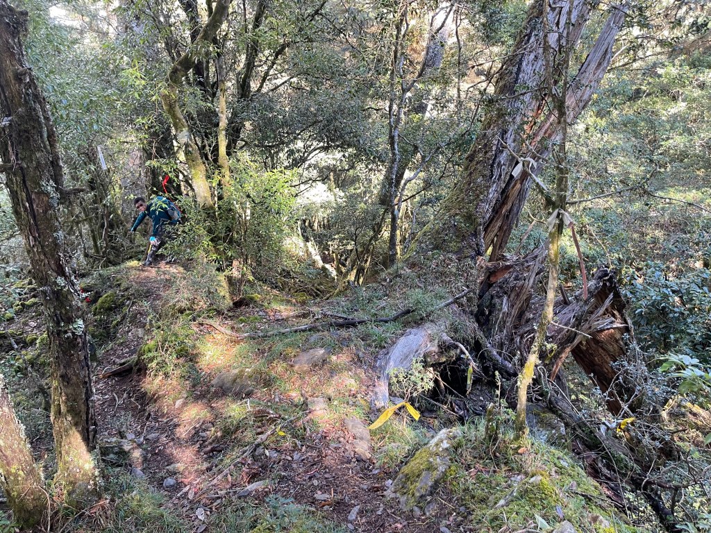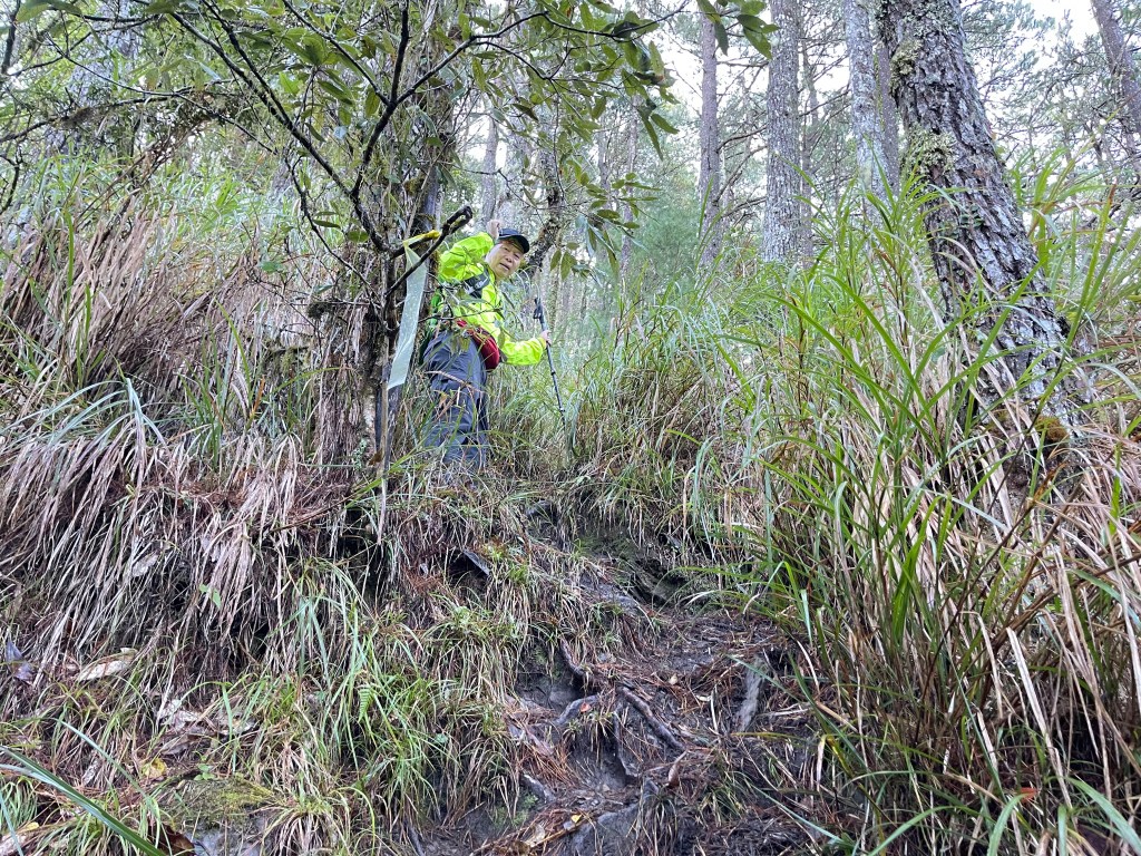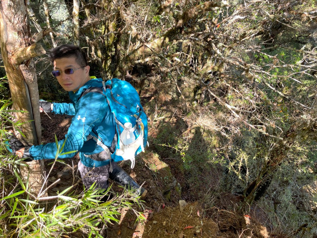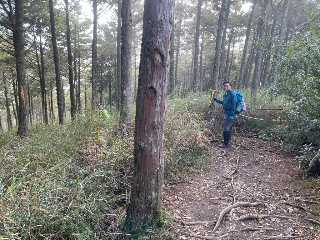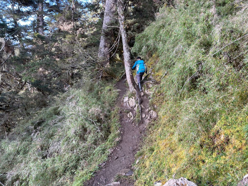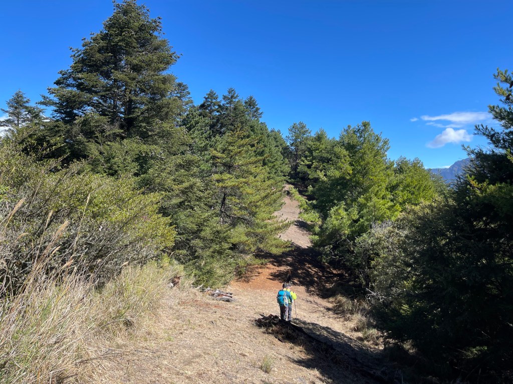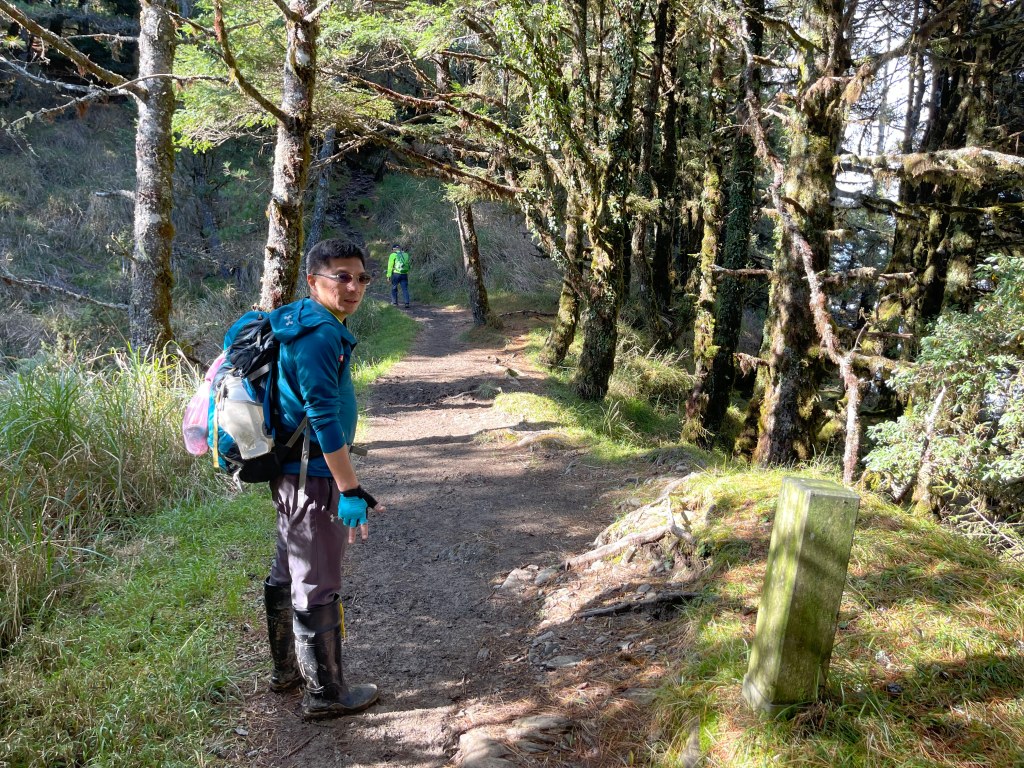 接著在箭竹林中陡上穿梭,跨越不少倒木,過平岩池不久後,接上寬大防火巷的稜線,在此康莊大道上,Peter又開始他登山多年的經驗步伐,不疾不徐的速度,但整體走起來算得上頗快,Smile在這種像天梯的路徑上,遠遠一看到要略為陡上還是會唉嚎一下。往右側看去,中央尖山不時露臉,由此到平岩山前都是優美的路徑。