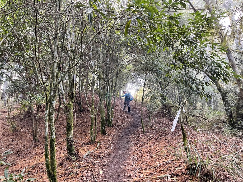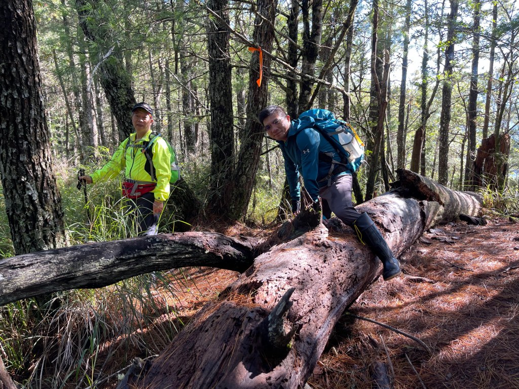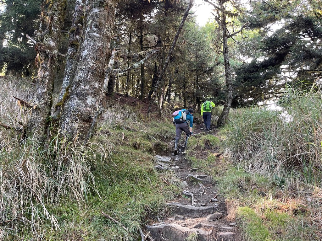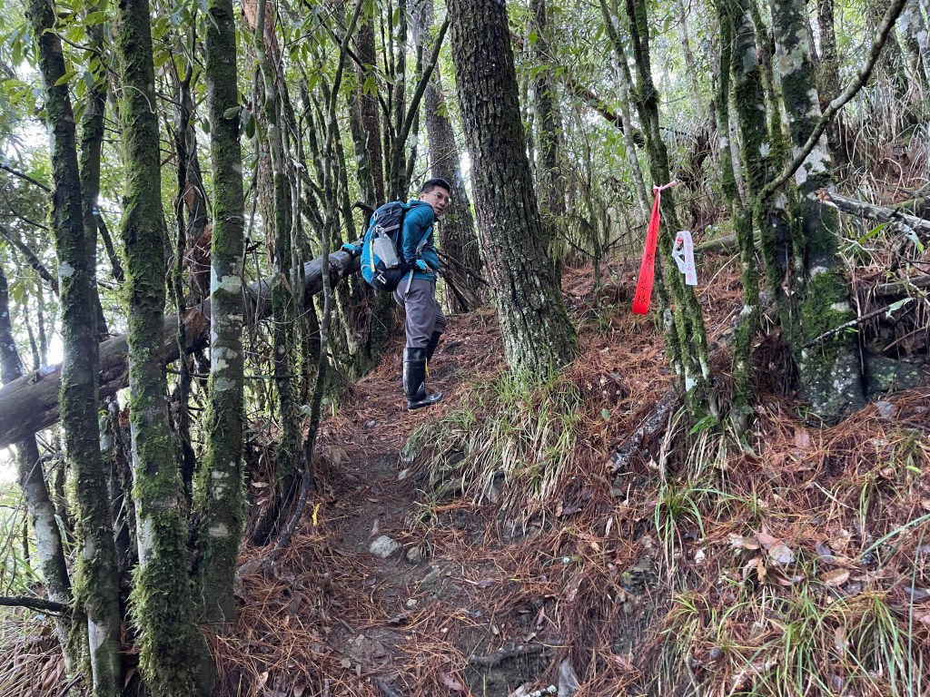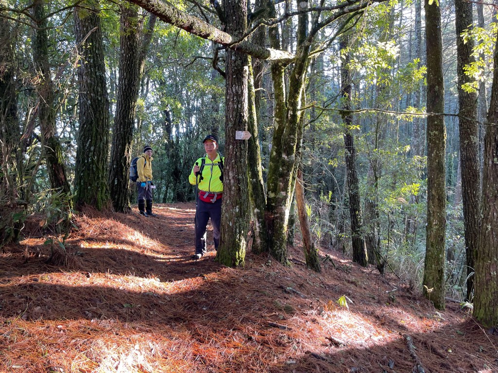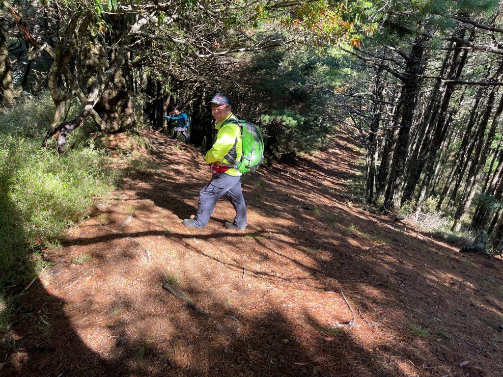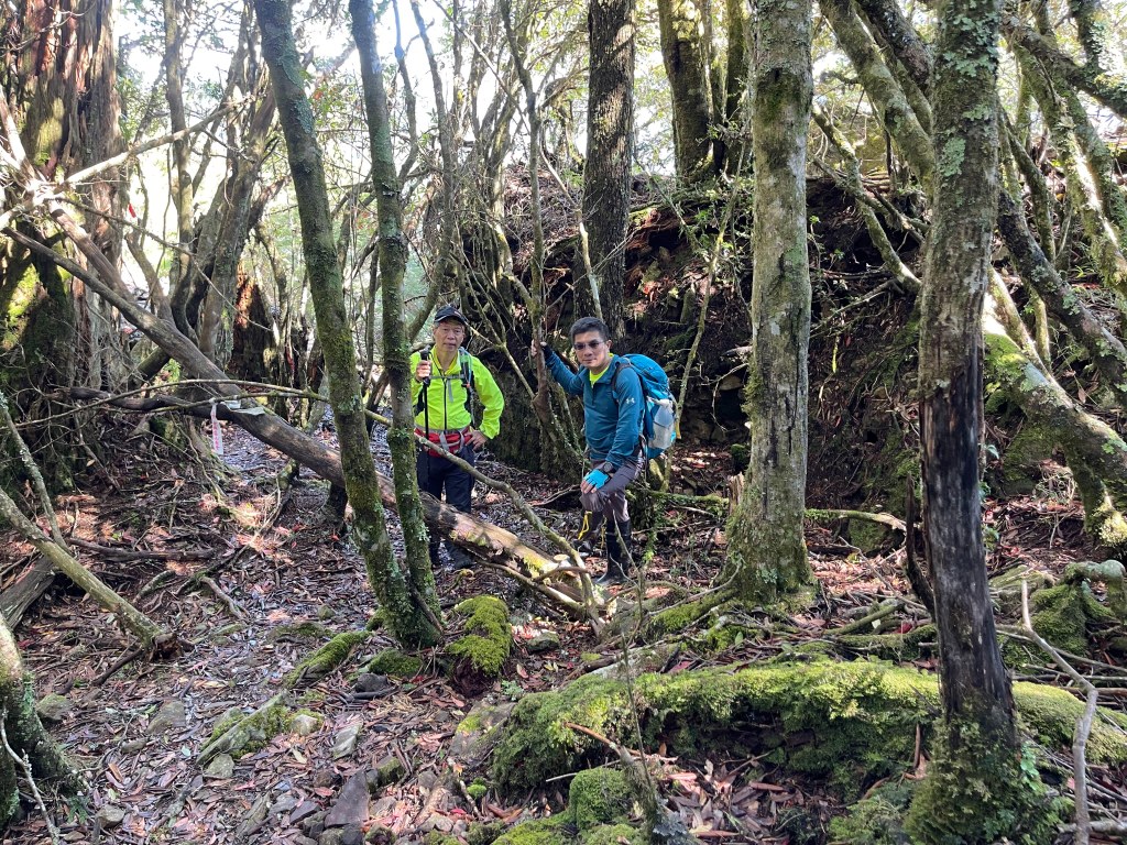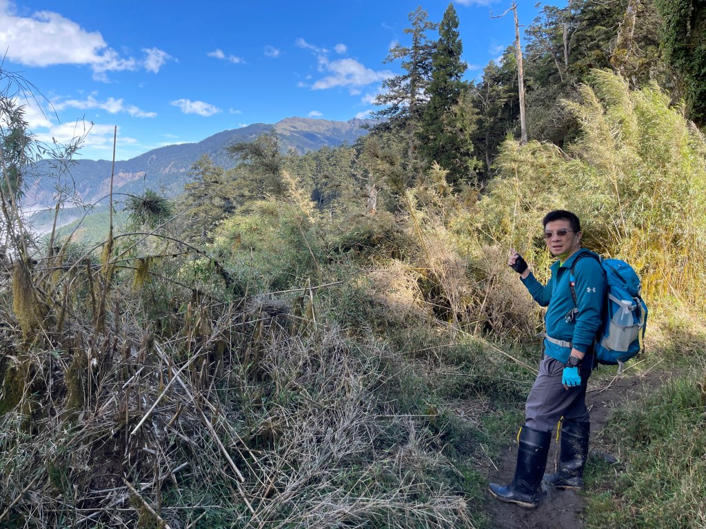 接著在箭竹林中陡上穿梭,跨越不少倒木,過平岩池不久後,接上寬大防火巷的稜線,在此康莊大道上,Peter又開始他登山多年的經驗步伐,不疾不徐的速度,但整體走起來算得上頗快,Smile在這種像天梯的路徑上,遠遠一看到要略為陡上還是會唉嚎一下。往右側看去,中央尖山不時露臉,由此到平岩山前都是優美的路徑。