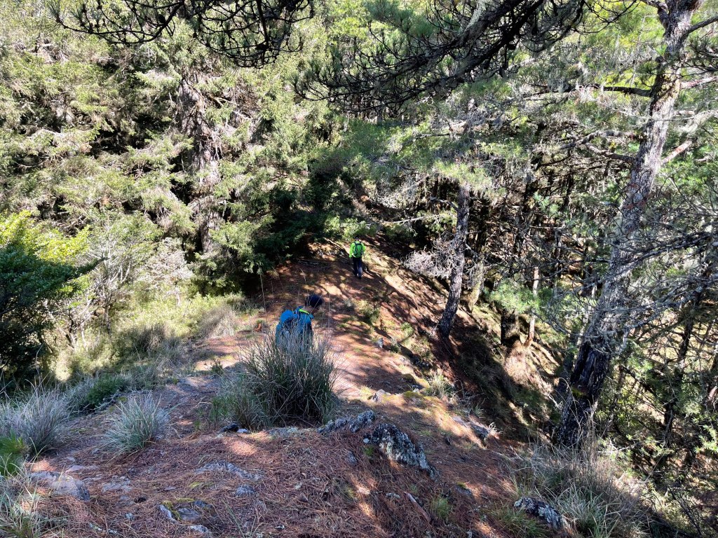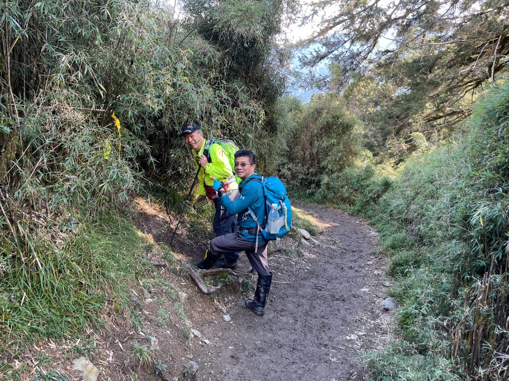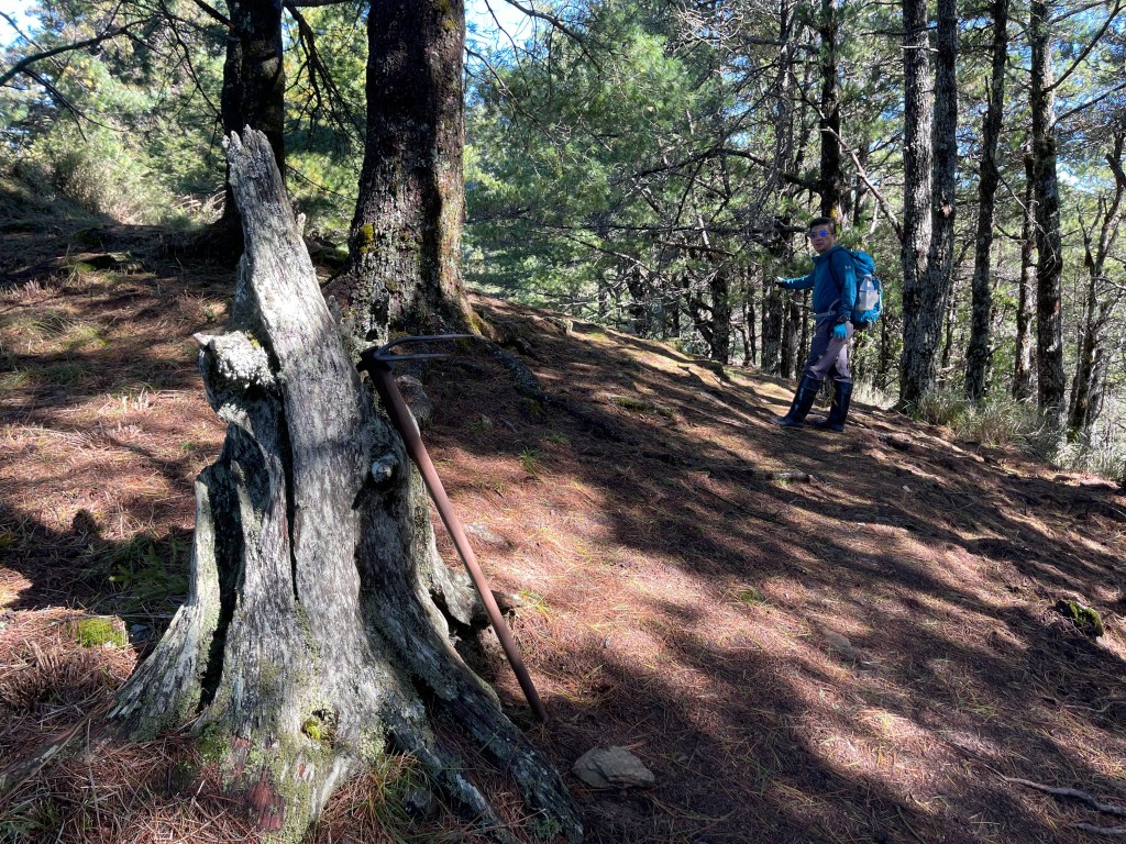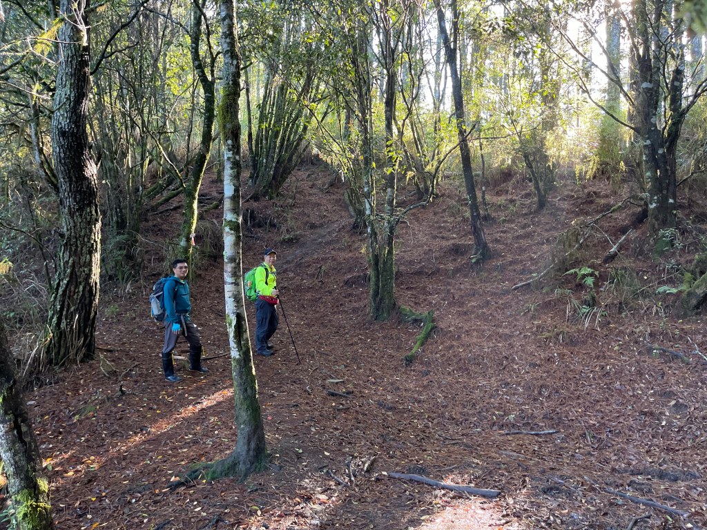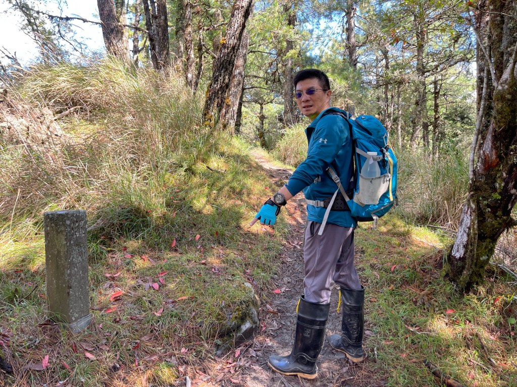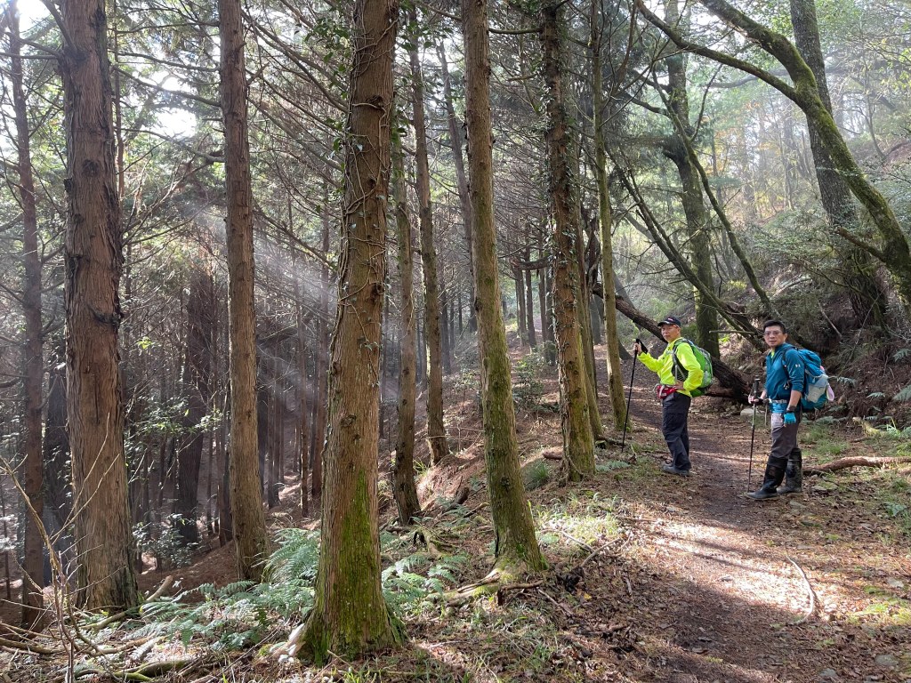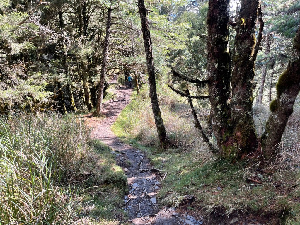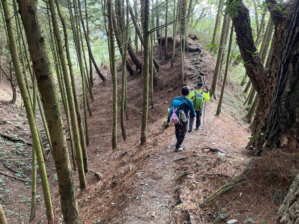 接著在箭竹林中陡上穿梭,跨越不少倒木,過平岩池不久後,接上寬大防火巷的稜線,在此康莊大道上,Peter又開始他登山多年的經驗步伐,不疾不徐的速度,但整體走起來算得上頗快,Smile在這種像天梯的路徑上,遠遠一看到要略為陡上還是會唉嚎一下。往右側看去,中央尖山不時露臉,由此到平岩山前都是優美的路徑。
