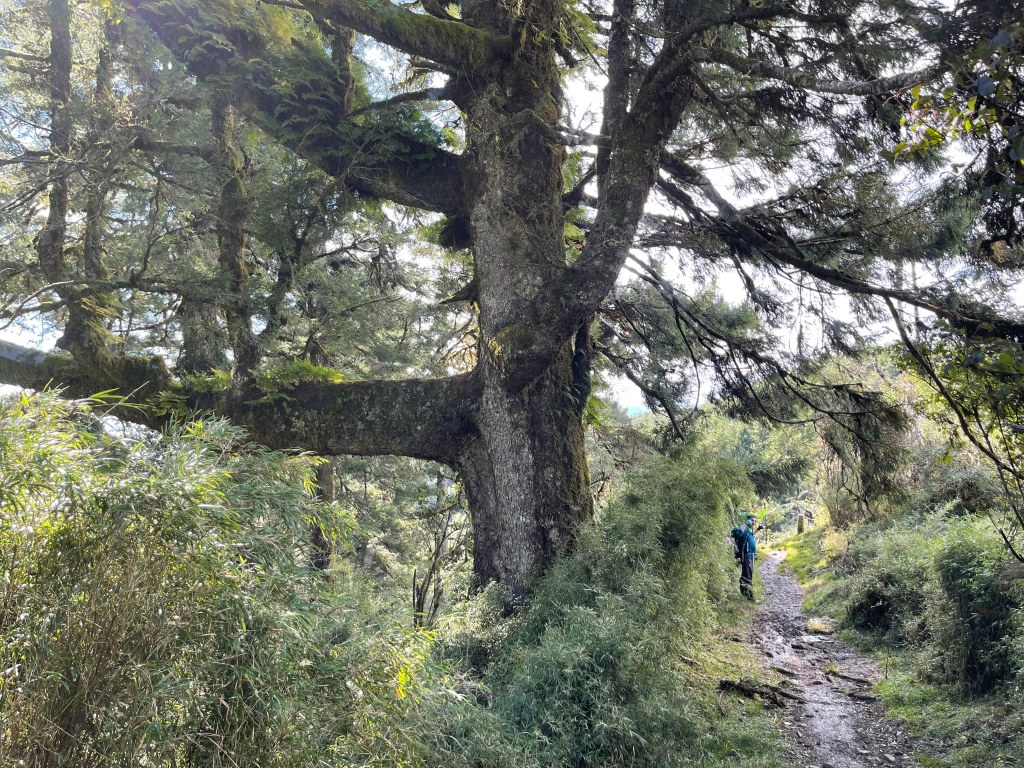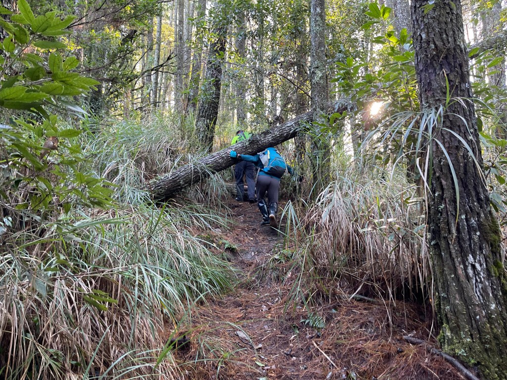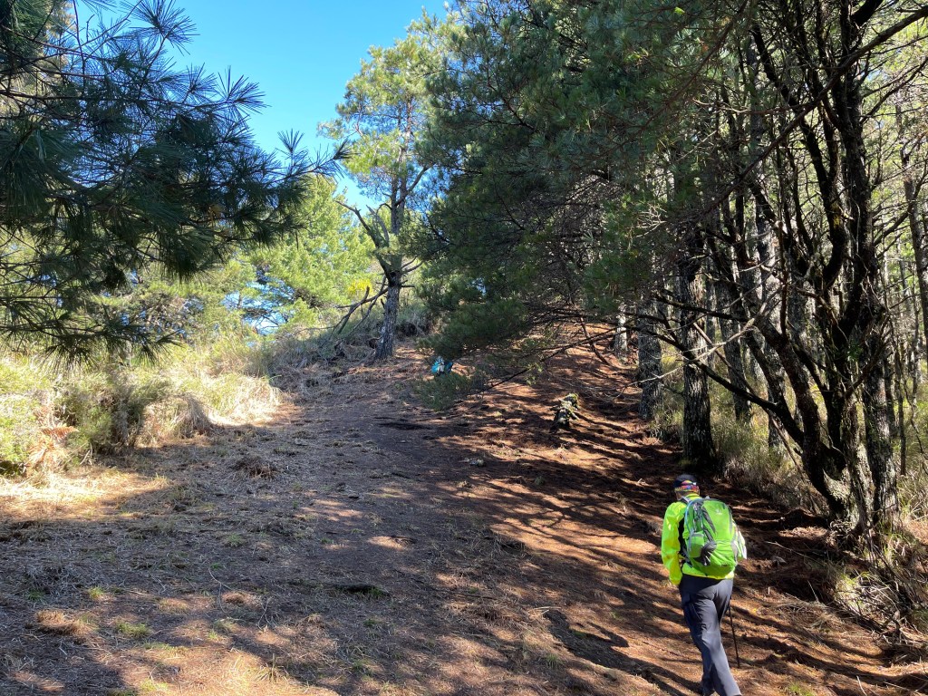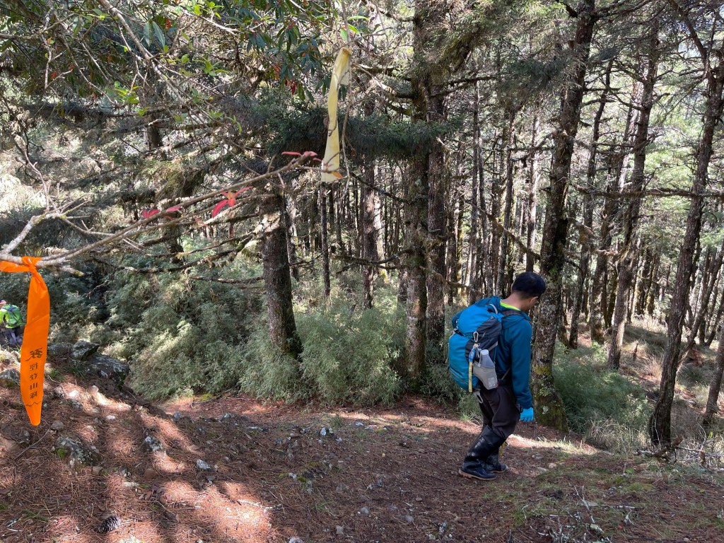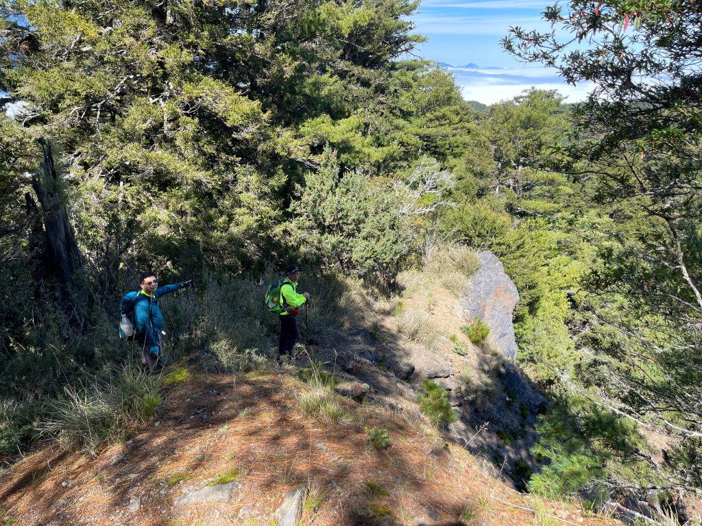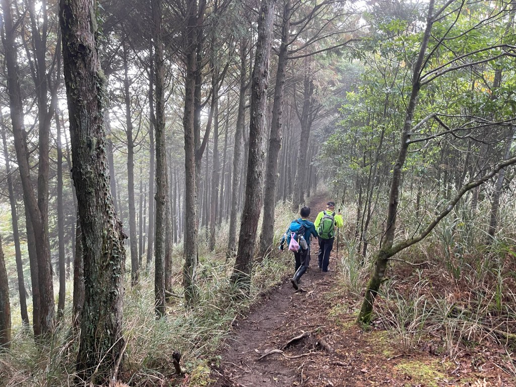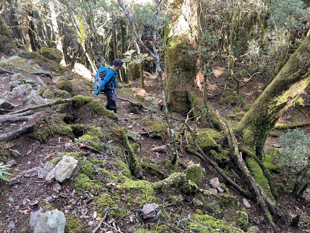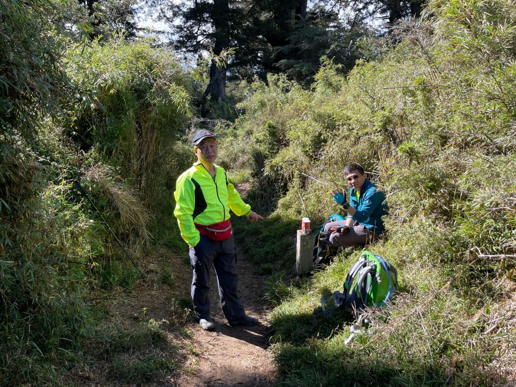 接著在箭竹林中陡上穿梭,跨越不少倒木,過平岩池不久後,接上寬大防火巷的稜線,在此康莊大道上,Peter又開始他登山多年的經驗步伐,不疾不徐的速度,但整體走起來算得上頗快,Smile在這種像天梯的路徑上,遠遠一看到要略為陡上還是會唉嚎一下。往右側看去,中央尖山不時露臉,由此到平岩山前都是優美的路徑。