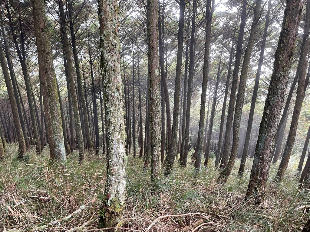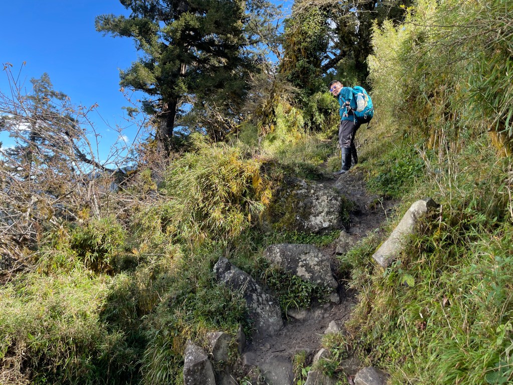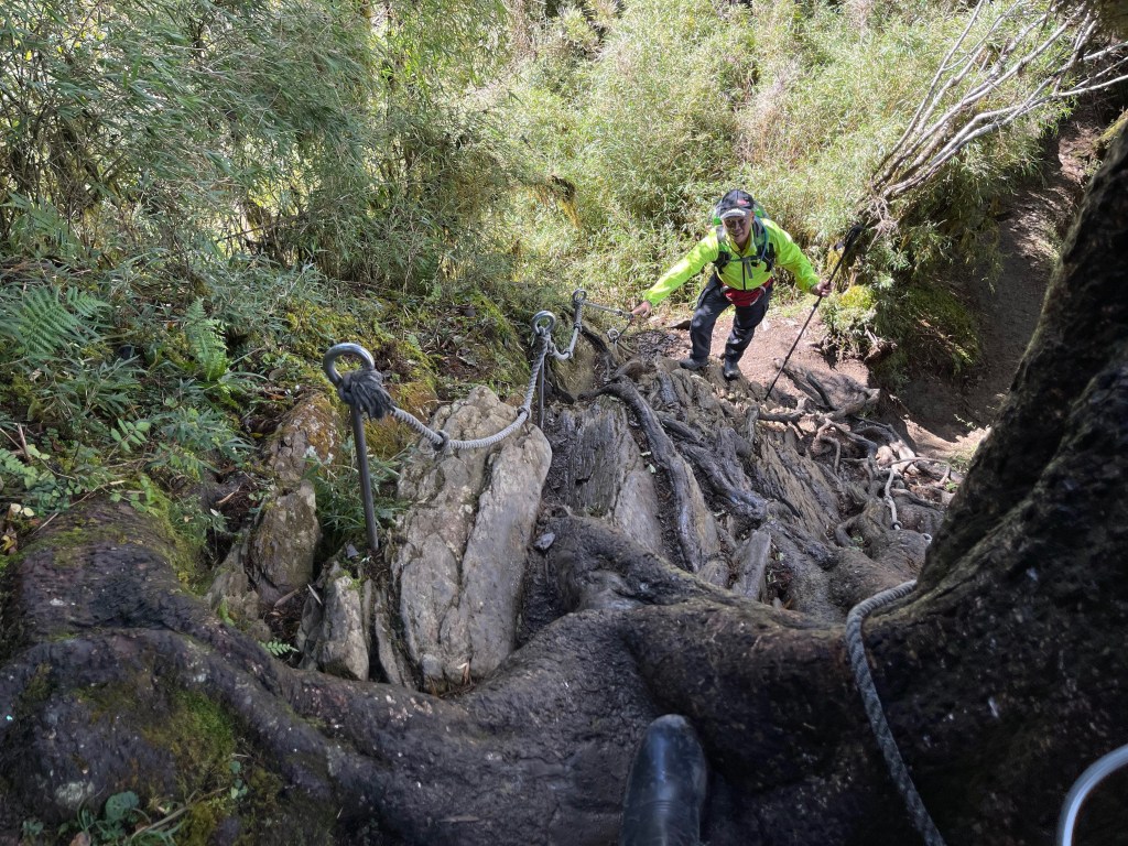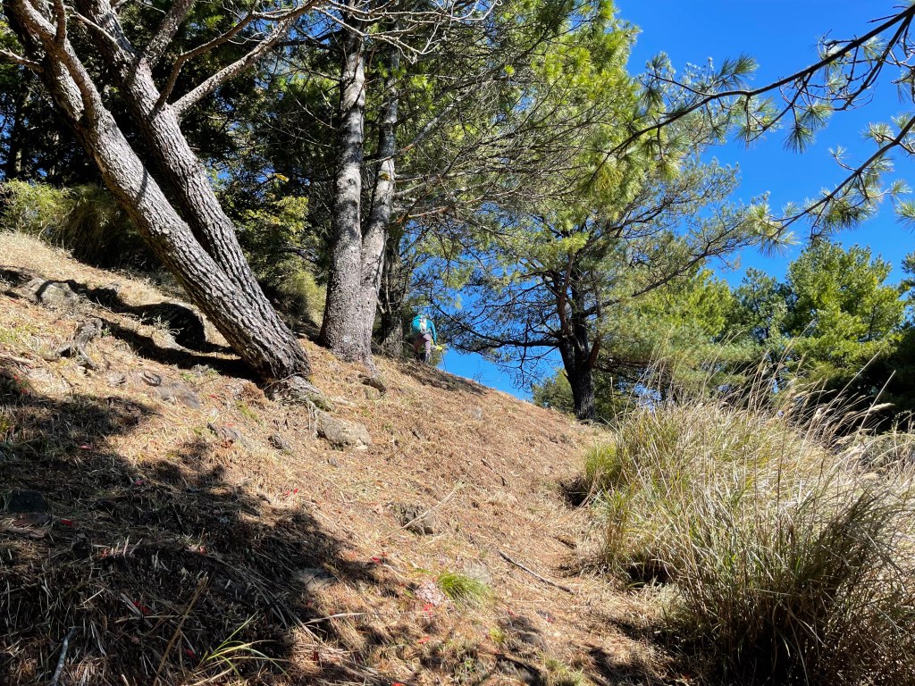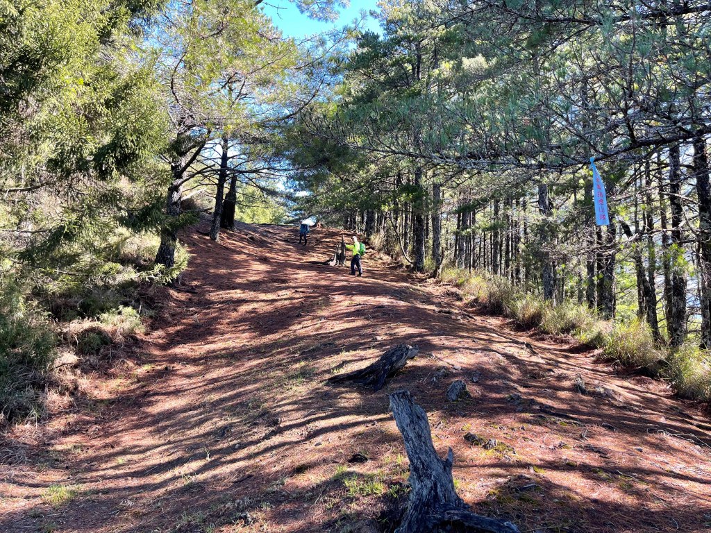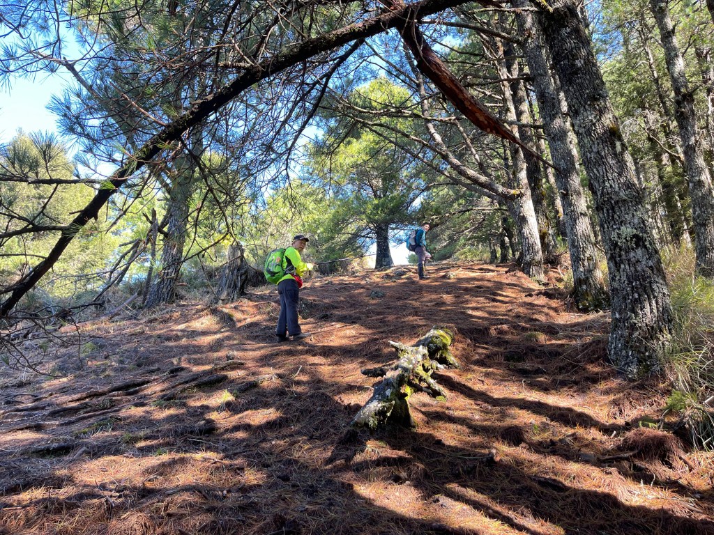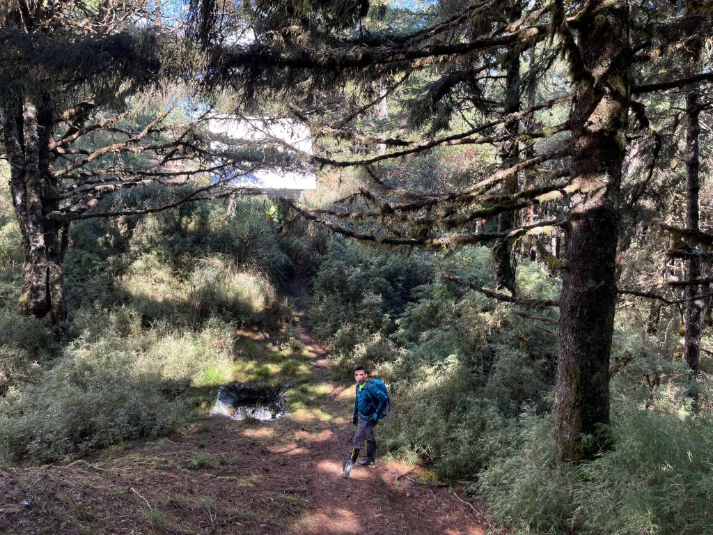 接著在箭竹林中陡上穿梭,跨越不少倒木,過平岩池不久後,接上寬大防火巷的稜線,在此康莊大道上,Peter又開始他登山多年的經驗步伐,不疾不徐的速度,但整體走起來算得上頗快,Smile在這種像天梯的路徑上,遠遠一看到要略為陡上還是會唉嚎一下。往右側看去,中央尖山不時露臉,由此到平岩山前都是優美的路徑。