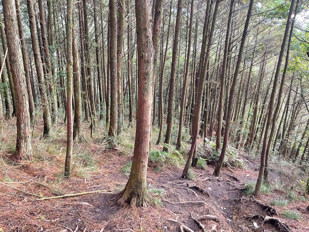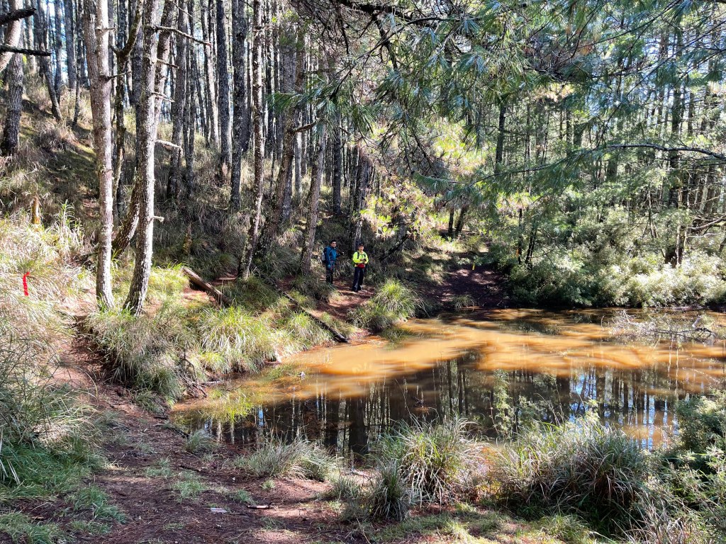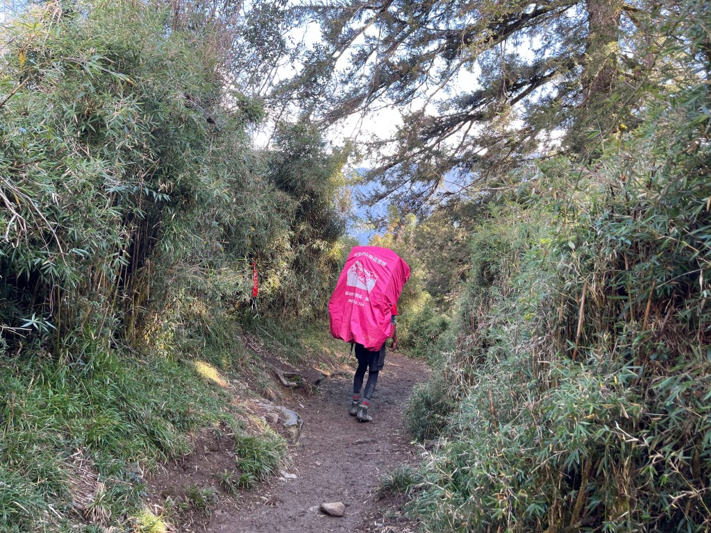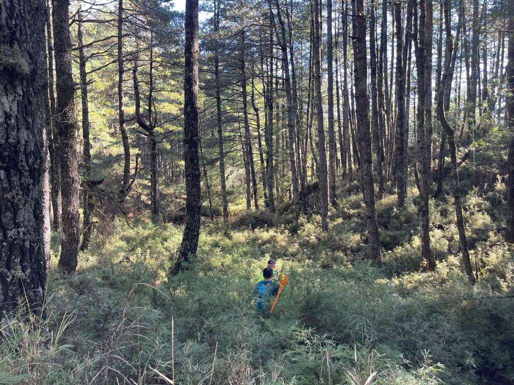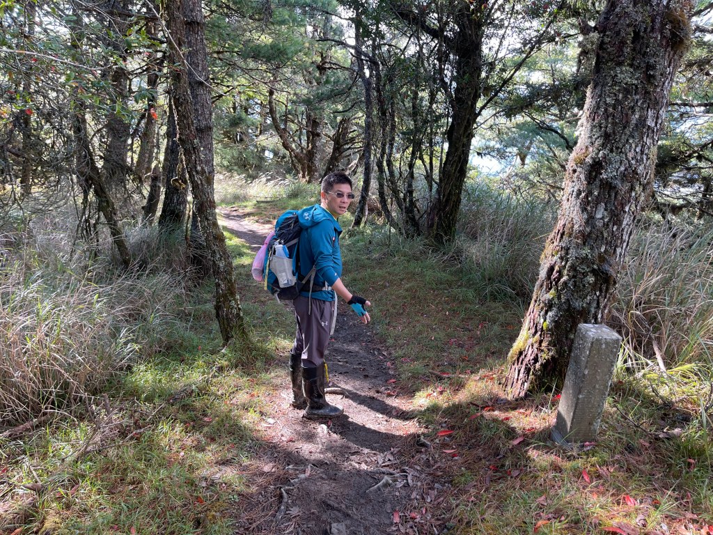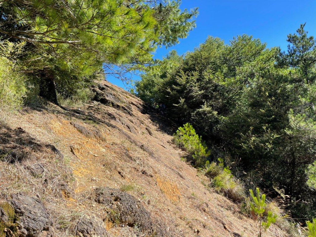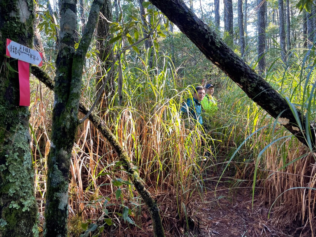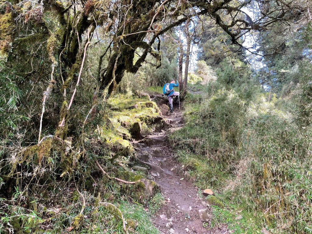 接著在箭竹林中陡上穿梭,跨越不少倒木,過平岩池不久後,接上寬大防火巷的稜線,在此康莊大道上,Peter又開始他登山多年的經驗步伐,不疾不徐的速度,但整體走起來算得上頗快,Smile在這種像天梯的路徑上,遠遠一看到要略為陡上還是會唉嚎一下。往右側看去,中央尖山不時露臉,由此到平岩山前都是優美的路徑。