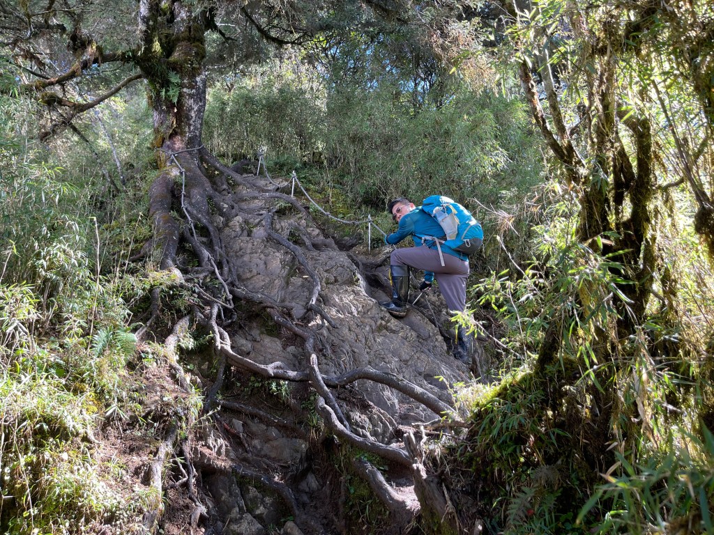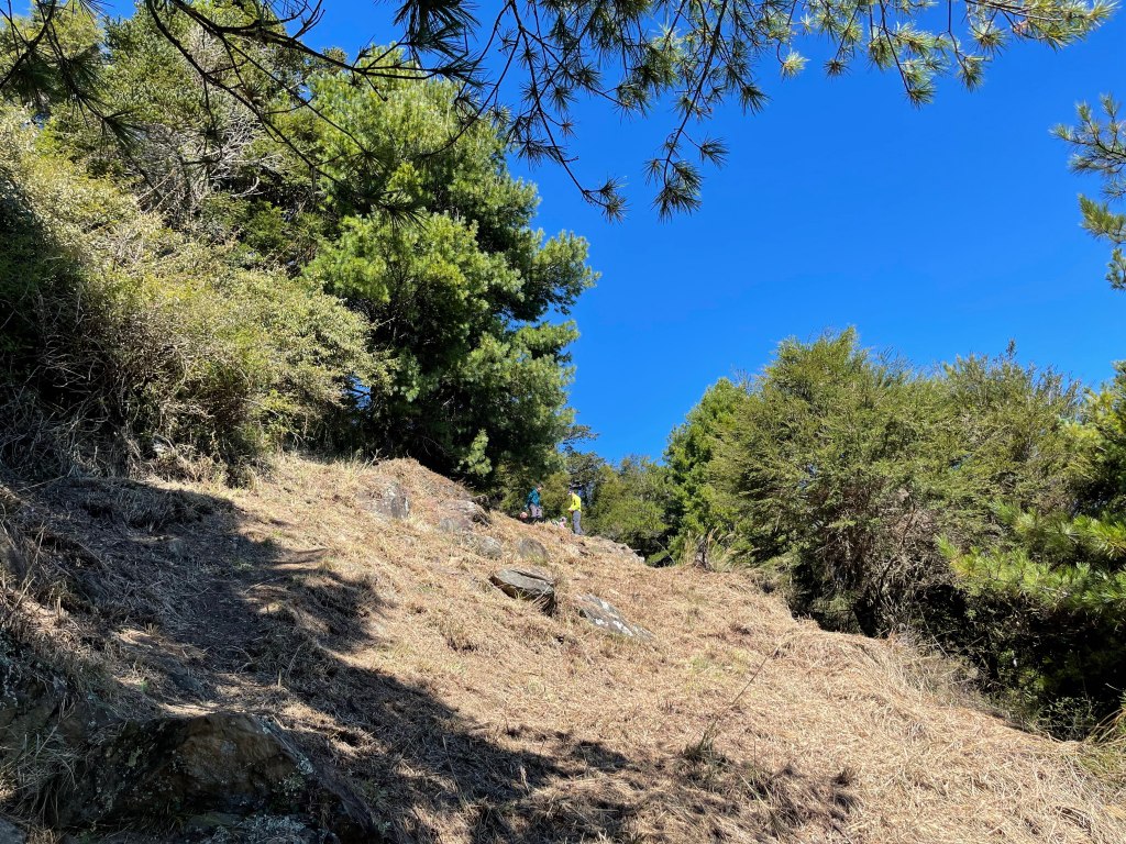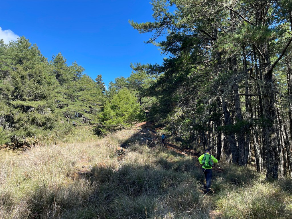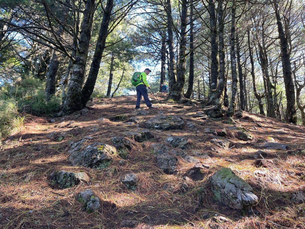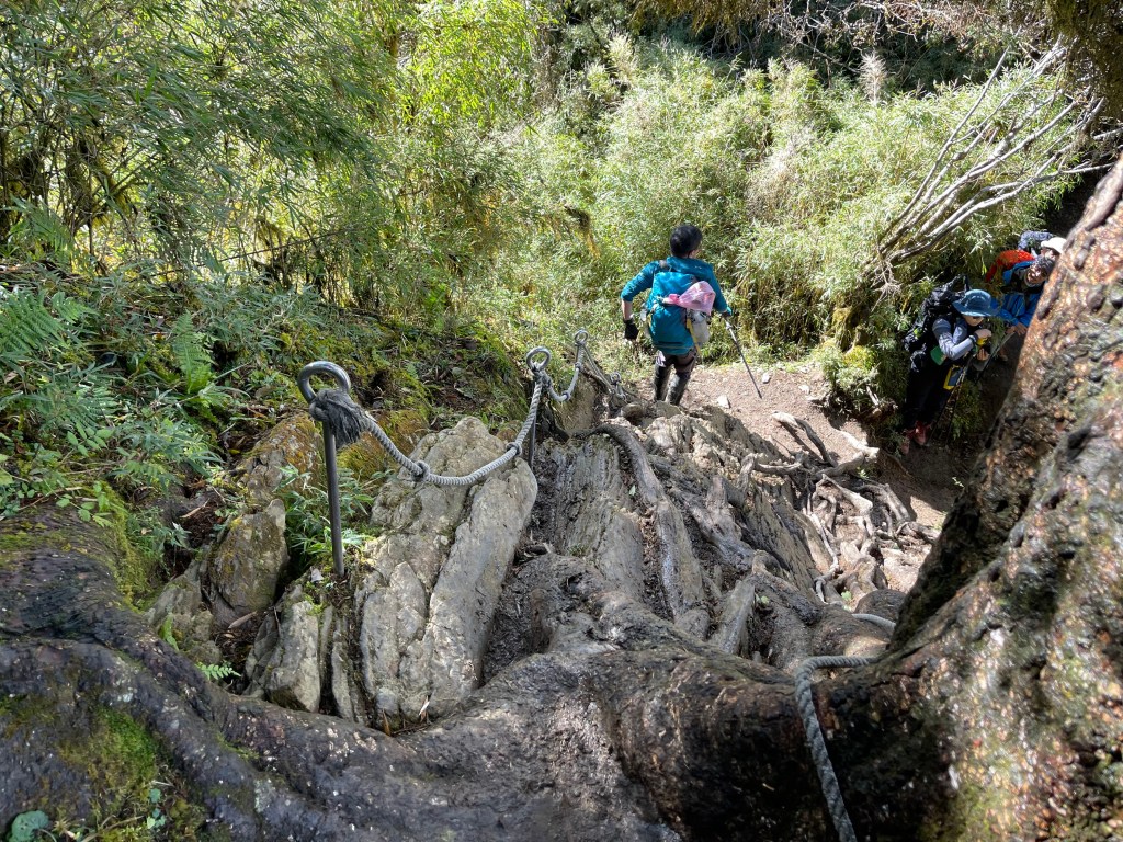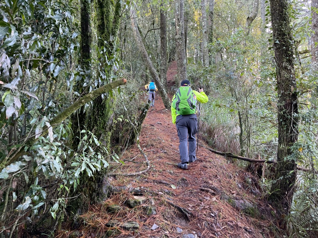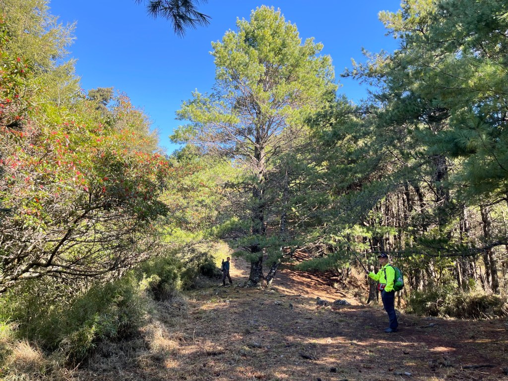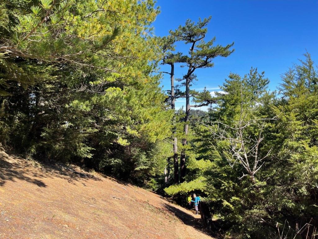 接著在箭竹林中陡上穿梭,跨越不少倒木,過平岩池不久後,接上寬大防火巷的稜線,在此康莊大道上,Peter又開始他登山多年的經驗步伐,不疾不徐的速度,但整體走起來算得上頗快,Smile在這種像天梯的路徑上,遠遠一看到要略為陡上還是會唉嚎一下。往右側看去,中央尖山不時露臉,由此到平岩山前都是優美的路徑。
