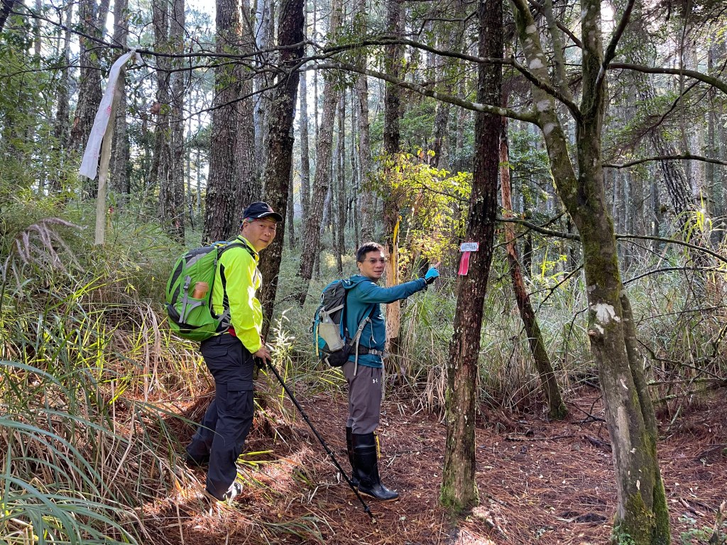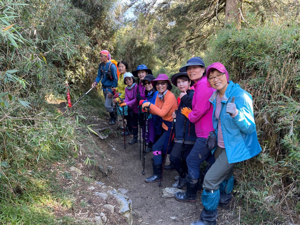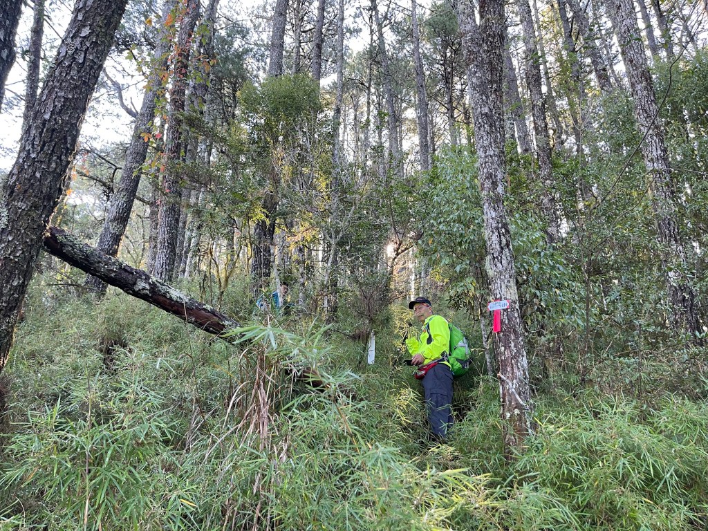 這一天,我們安排一台車放置在勝光登山口,另搭一台車開至果園登山口,並從果園登山口起登,由此到平岩山需走4.5K的距離,陡上海拔700m的高度。一開始先走0.3K的好走林道,接著就往右上稜線略為陡坡而上,遇到一右側往下至南湖溪的岔路,不取。繼續直走陡上一段,續接緩緩而上的松針路徑,經平岩山雨量自動測報站後,慢慢隨之陡上也逐漸進入箭竹林中,路徑左側不時可看到雪山丶北稜角,山頭上已經都是白頭(有雪)。