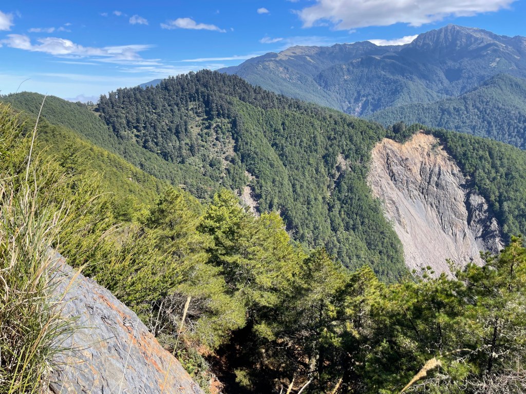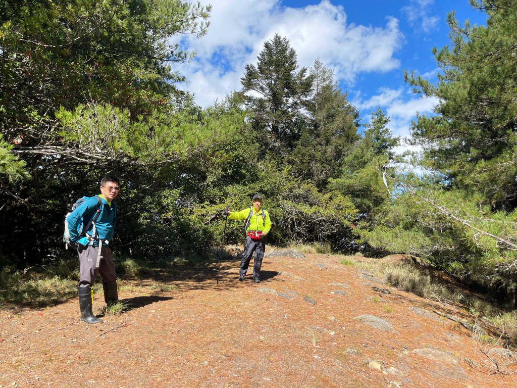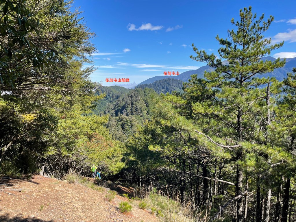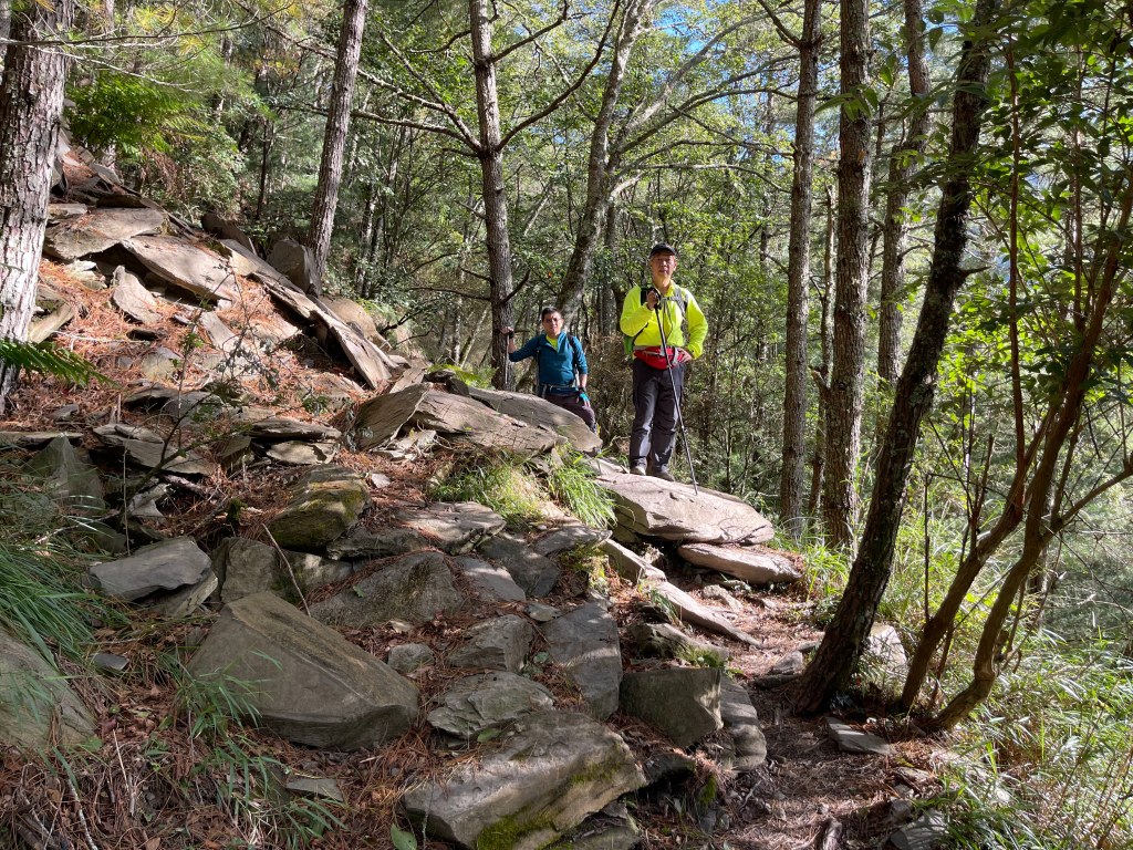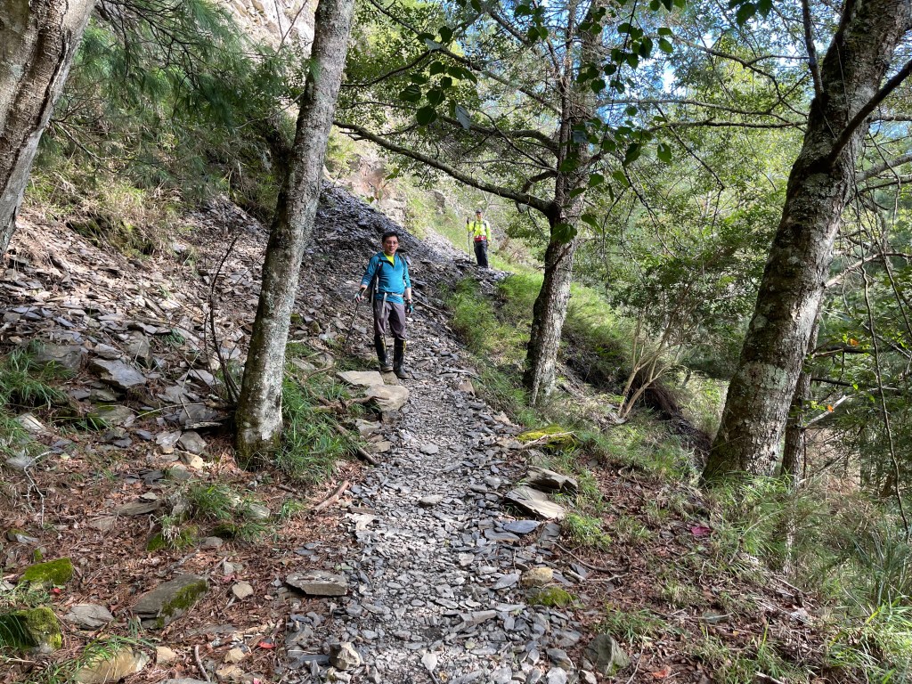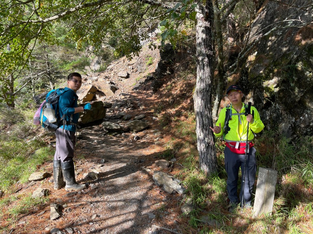 抵達平岩山!可以看到南湖大山、中央尖山等,非常貼近的北一段及北二段稜線,在此巧遇百福自由行登山隊的夥伴們,也正在此休息賞景。我們三人休息後繼續前行,到下一個目標多加屯避難小屋需3.2K,一路上仍然走在寬大的防火稜線上,有起伏也有好幾個假山頭,也有崩塌路段,也有陡滑路段,過中午後來到多加屯避難小屋,續往前50公尺就會接上南湖大山登山步道。