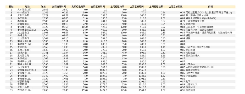 非常感謝鉅細靡遺的分享。這篇文我從頭到尾來回認真翻了好多遍,又翻了這個日期附近的幾篇文章,比較自己和你們的速度差異後,也順利完成一日南湖(從方便屋起登來回費時18:47)。此外我還依據你們的紀錄去調整配速,順利在南湖北山看到日出、成功趕在白牆前十分鐘登上主峰(當天不到八點半就白牆)、並在天黑前回到登山口。如果沒有這篇文章幫忙,第一次登南湖不可能有如此完美的成果。再次感謝,也祝你們每次登山都能順利並且出大景!