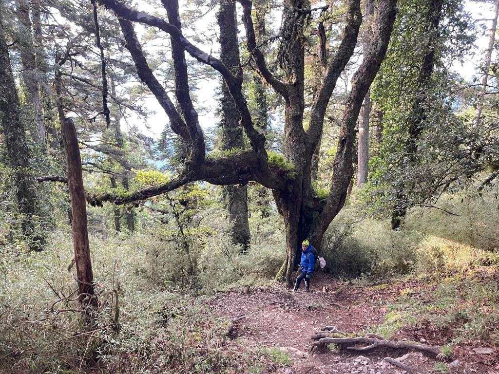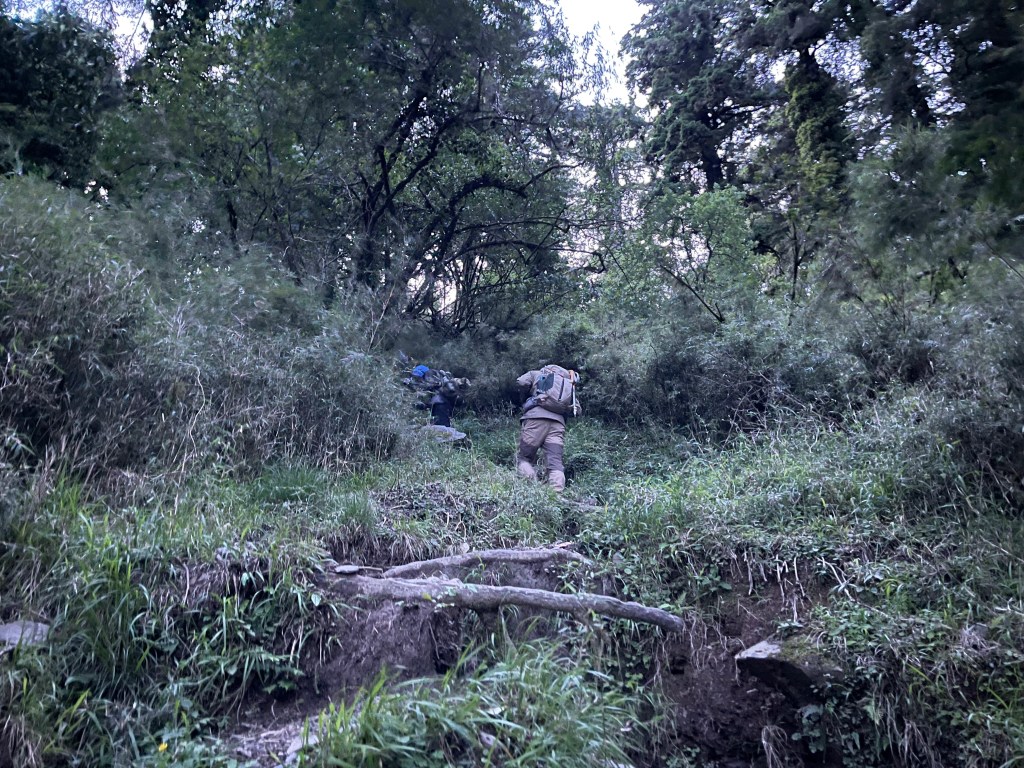 就在過五岩峰的過程中,Smile正在拍攝我(Gosen)往前走,突然,看到了兩隻長鬃山羊正從上方相互追逐往我(Gosen)與Smile衝過來,就從我的身邊呼嘯而過,而其中一隻就停在Smile前,並且轉頭看了Smile一眼,接著縱身往右側樹叢跳下。這真是太令人驚艷的一段偶遇啊!