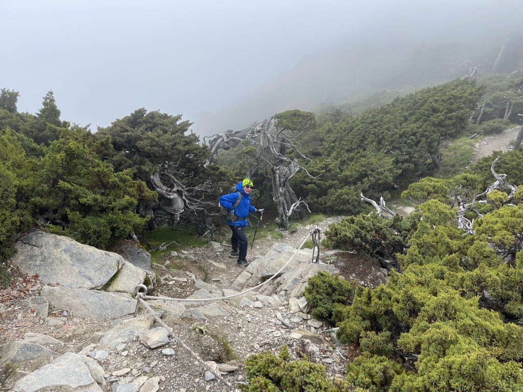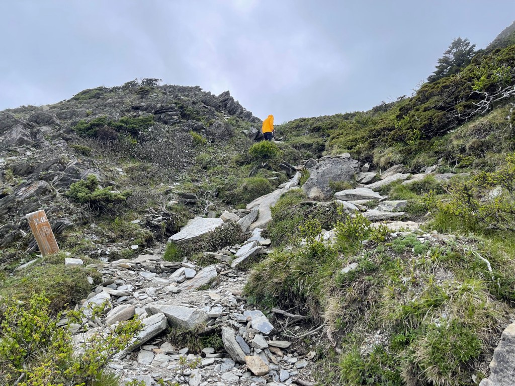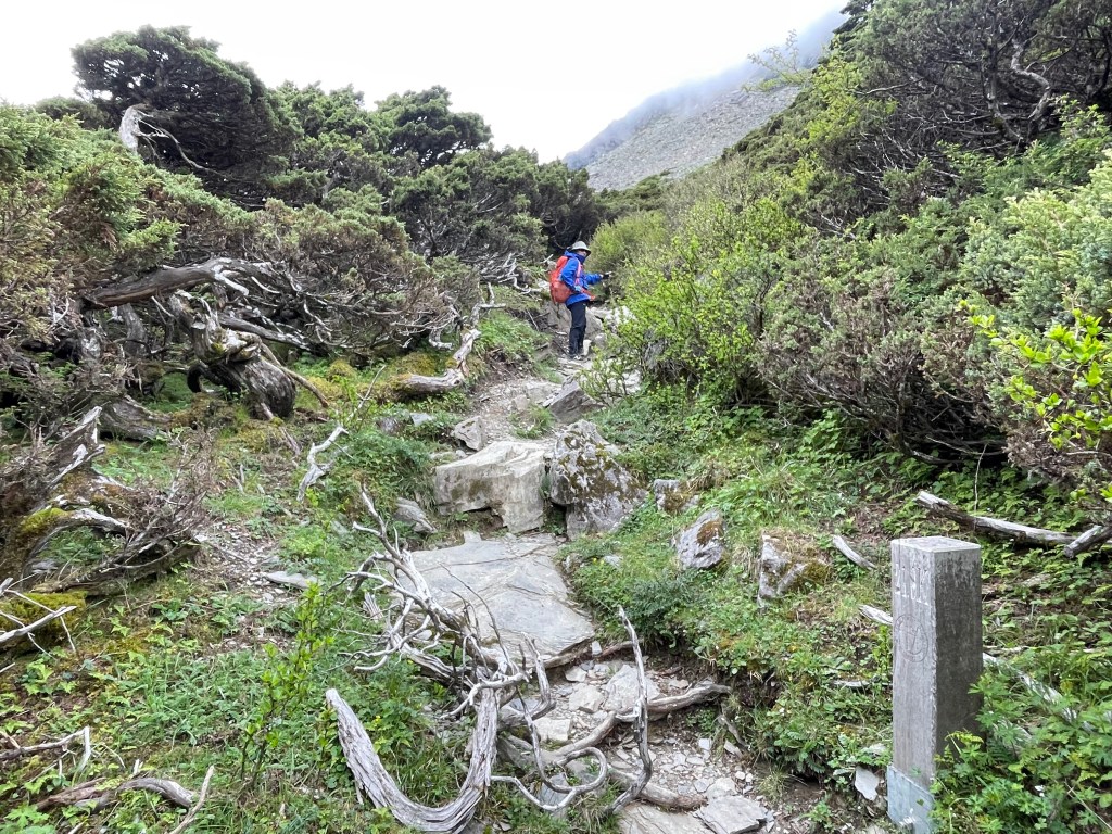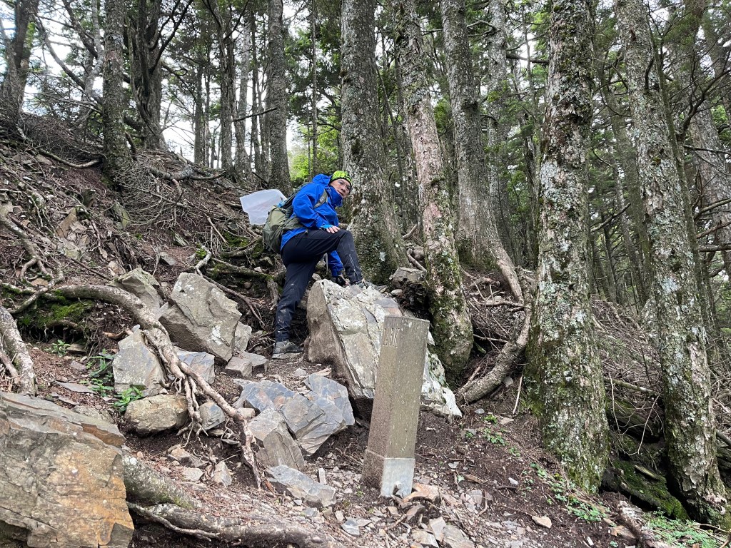 其實,在接近南峰岔時,嘉鴻就有反應如果走太快會有頭痛問題,感覺上就覺得是高山症?當我們上到巨大岩壁攀爬區時,我突然想到,我有帶威而鋼及丹木斯啊!只是現在才吃,可能沒有效果?但是,我的背包在山屋邊,唉啊!嘉鴻也當機立斷,即使離三角點剩下不到200m,也立即決定先下撤往山屋走。