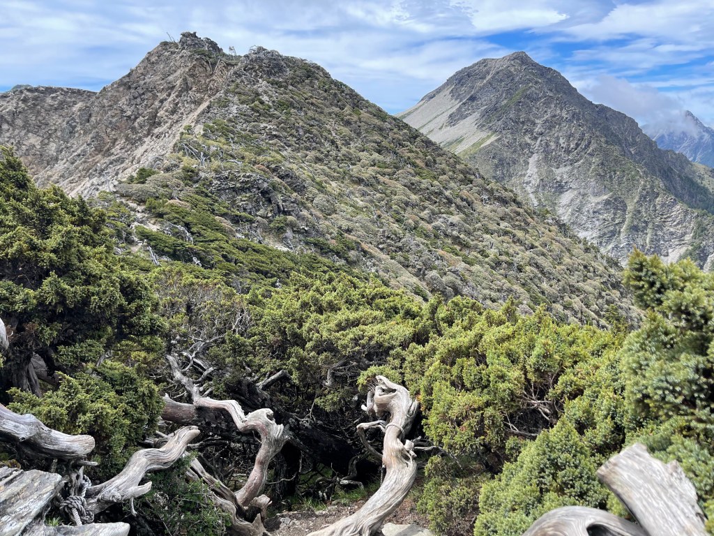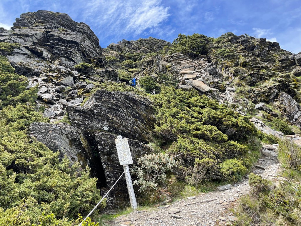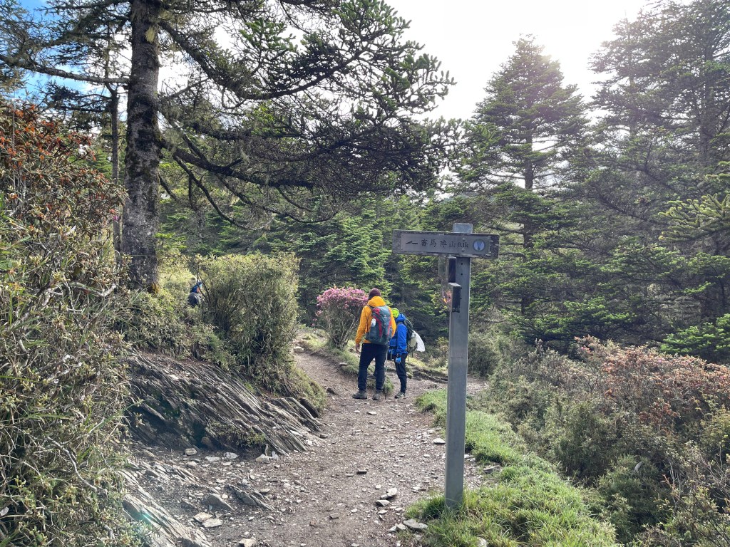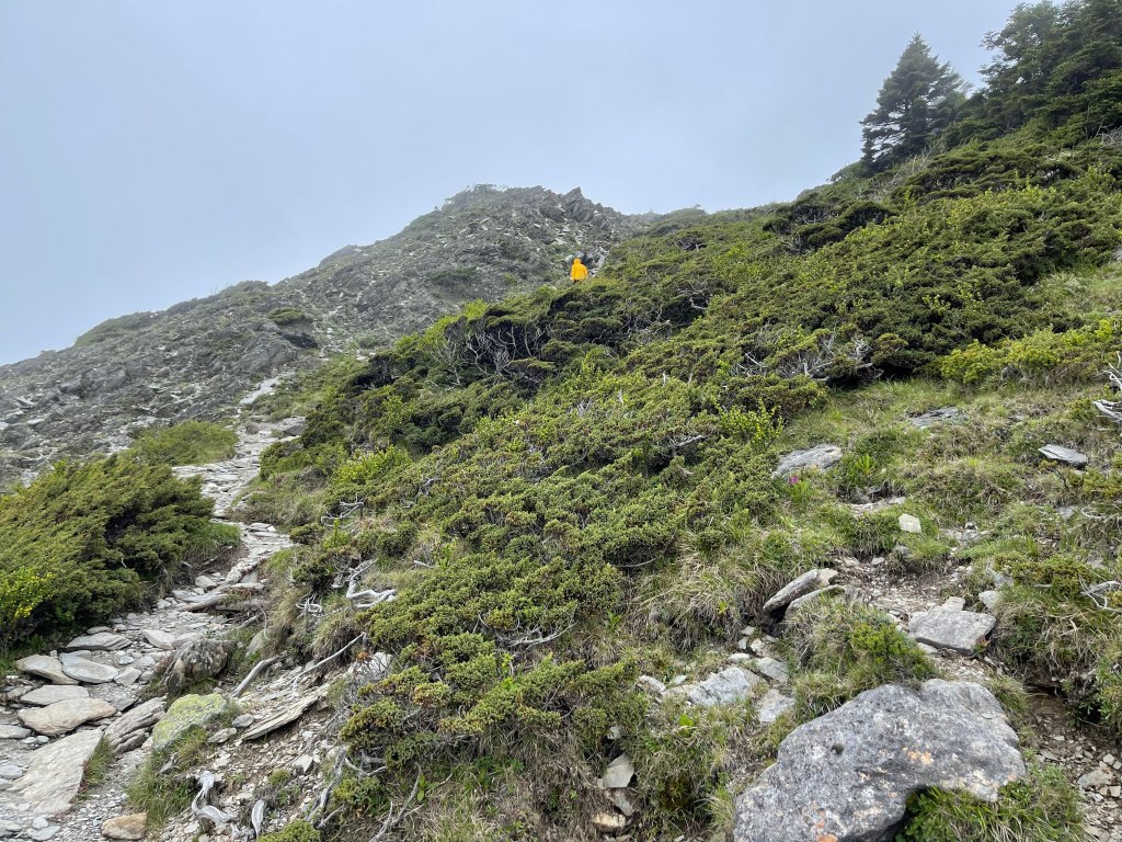其實,在接近南峰岔時,嘉鴻就有反應如果走太快會有頭痛問題,感覺上就覺得是高山症?當我們上到巨大岩壁攀爬區時,我突然想到,我有帶威而鋼及丹木斯啊!只是現在才吃,可能沒有效果?但是,我的背包在山屋邊,唉啊!嘉鴻也當機立斷,即使離三角點剩下不到200m,也立即決定先下撤往山屋走。