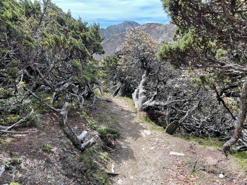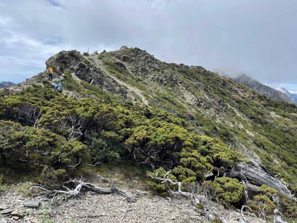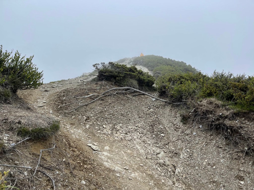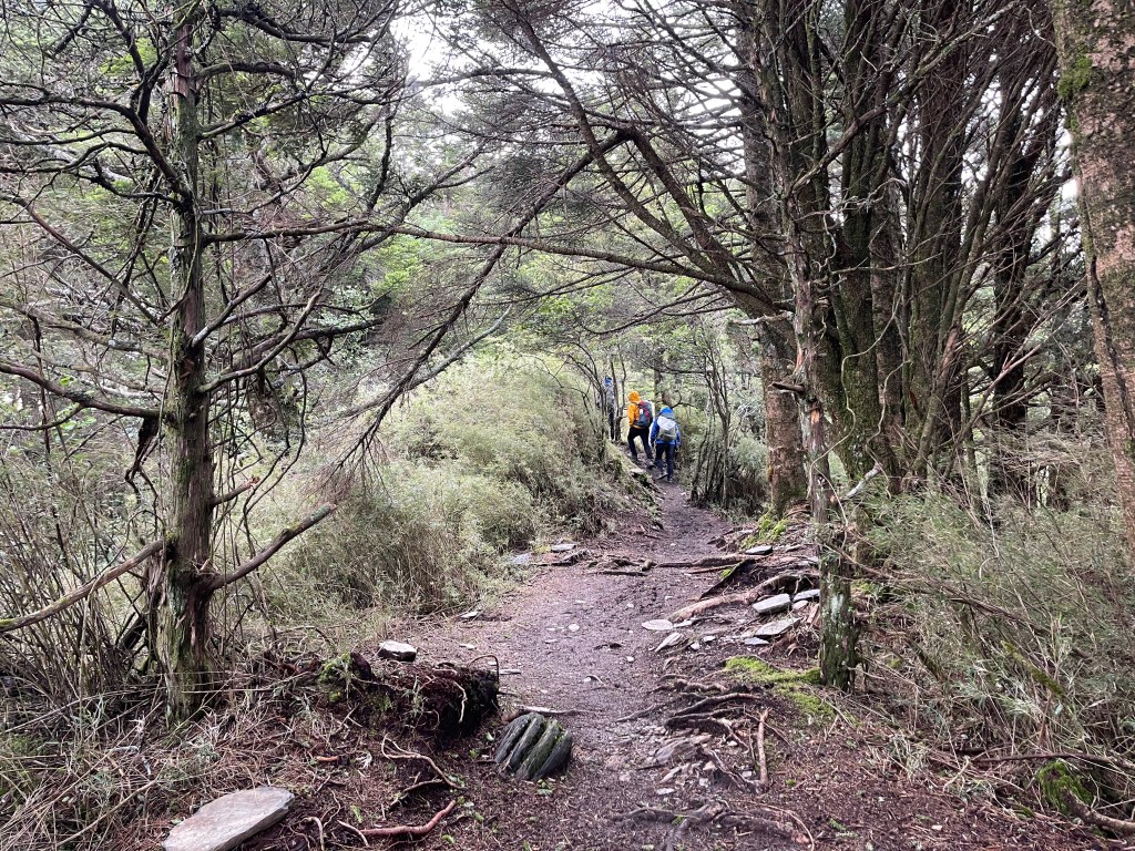 今天由凌晨開始到目前為止,一直吹著狂風。持續走後,稍微陡上,馬上就一路陡下來到另一個鞍部後,接著要一路陡上了,由11.7K的雲稜山莊到15.8K的審馬陣山岔,要由海拔2600m直接陡上到海拔3127m,這之間的路徑,一開始就中級山型態的山徑,接著就會接上一段松針平緩路徑,再來就會由14.2K沿著岩壁路徑陡上到14.6K為止,我們走到這一段時天色已亮,也建議走這一段時不要在摸黑階段。