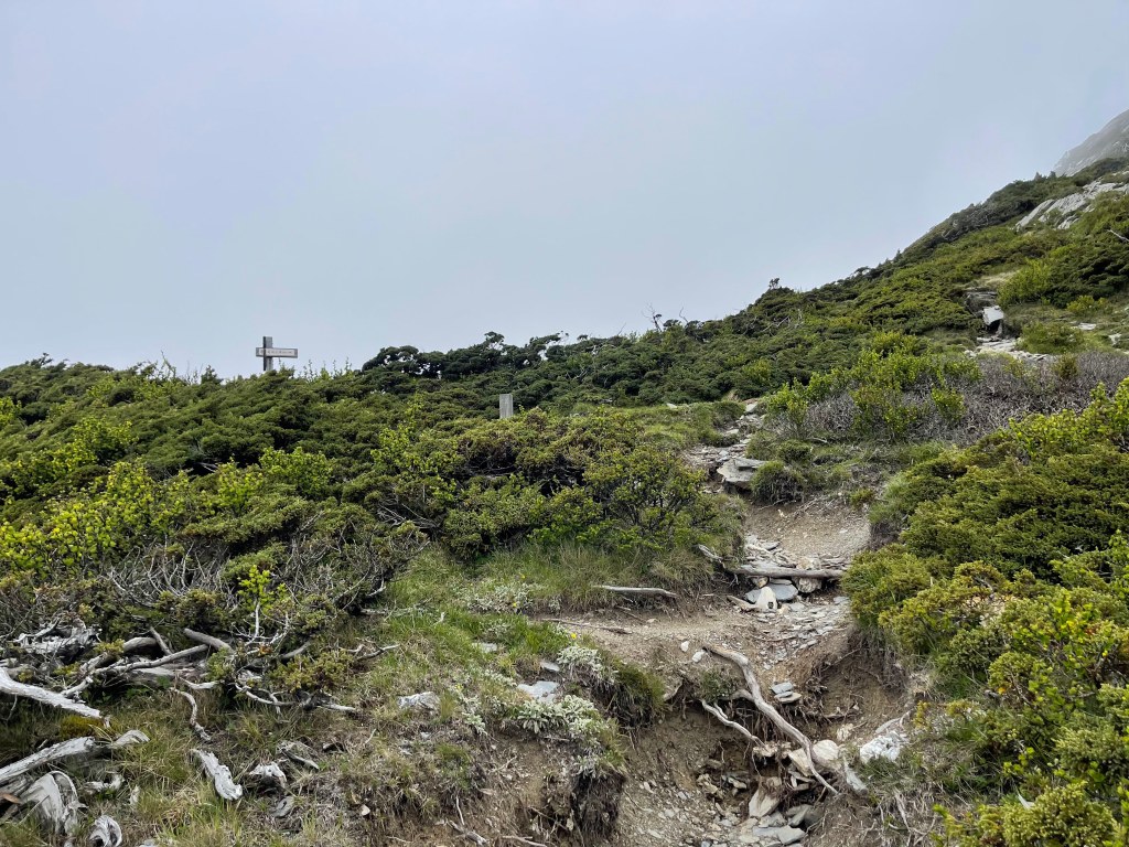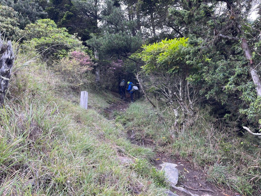 過了9.3K的多加屯山後,路徑轉為陡下,要到11.1K的木桿鞍部達到低點,這一段的陡下並不是持續的,而是一段陡下一段平緩,而逐漸來到木桿鞍部,這裡是往南湖大山與中央尖山的岔路口,我們要繼續往雲稜山莊的方向走。接著,就陡上一段,再陡下時就是11.7K的雲稜山莊已經抵達。