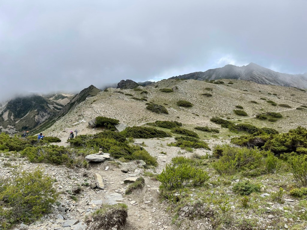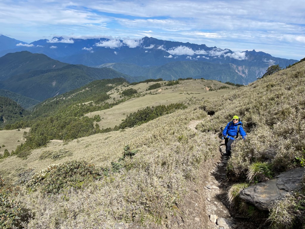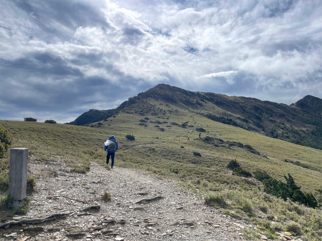 過了14.6K後,雖然路徑仍然往上,但陡度變得較緩,再來的路徑就是平緩的泥土型態,過了15.8K的審馬陣山岔,我們決定回程再進去100m去拍審馬陣山,接著,就會出到草原區,此時整個視野大開,往前可以一直看到往南湖北山的緩上且長的路徑,眼光往右轉就可以一覽看到五岩峰、南湖大山、中央尖山、直到在後側的聖稜線,這時真是心境大好,陽光也出現,但就是狂風不斷。