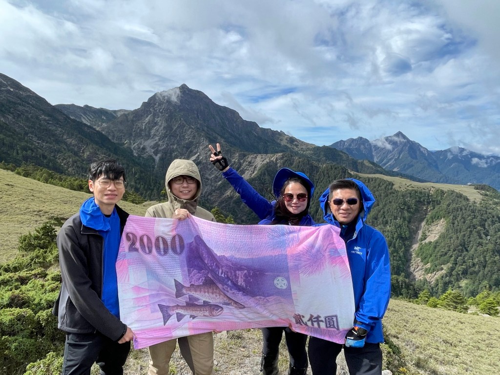 隨著路徑走到17.2K新台幣2000元的背面圖像拍照處,我們拿出自備的新台幣2000元的大浴巾,就在此處拍了起來。Steven本來打算要在此空拍,但整日強風猛吹,我們就看到空拍機根本飛不起來,David事後查證,我們這一天吹的是7級風(風的等級由0-12級),到早上8點此時就讓他覺得頭痛,所以,Steven決定走到這裡,他要退出今天的行程,等會就自己一人慢慢走下山。我們整日被狂風侵襲,都會不自覺的滴下鼻水(真的是水)!整天,都只能將防風外套給包緊緊,但,一路上帝王之山隨伺在側,一直強烈的吸引我們的眼睛。