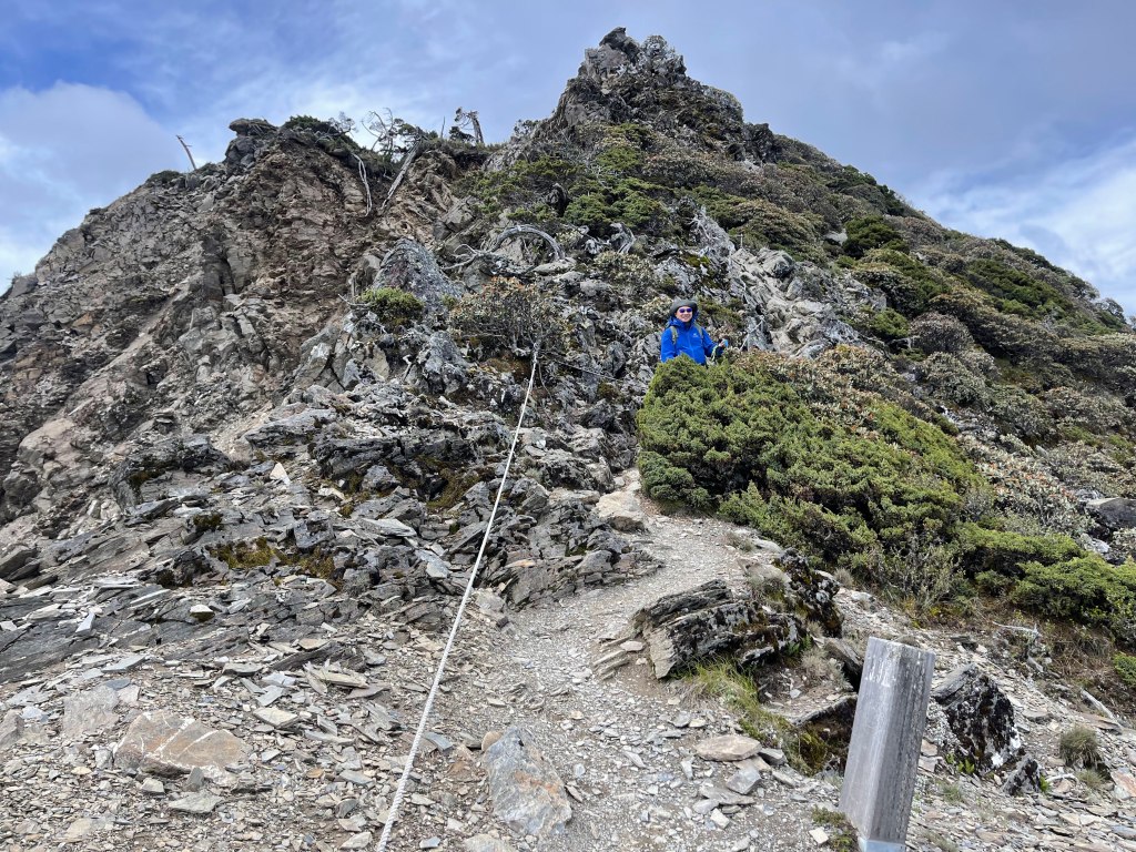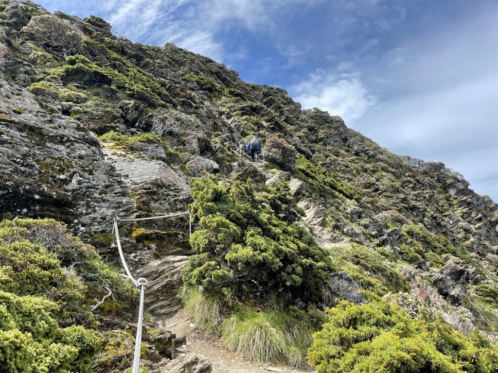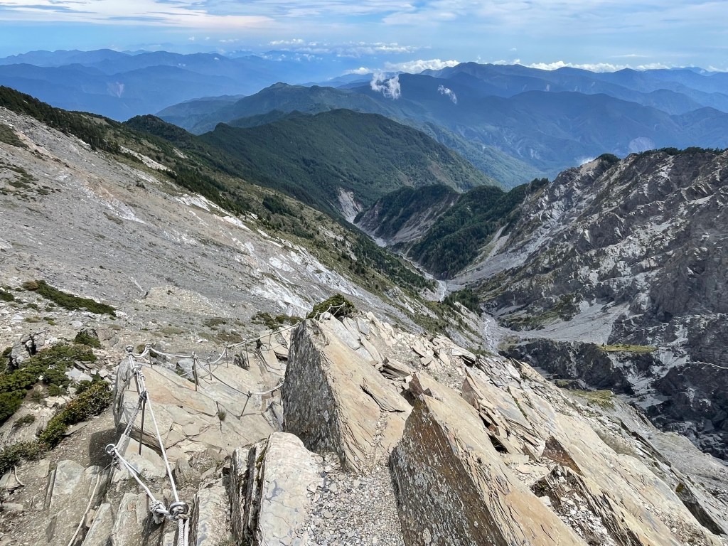 整個碎石坡的長度將近700m,陡下海拔200m,過程極為陡滑,一路上有繩索,一定要拉著繩索走,中途有一小段的左側接近斷崖,盡量不要靠近就是。