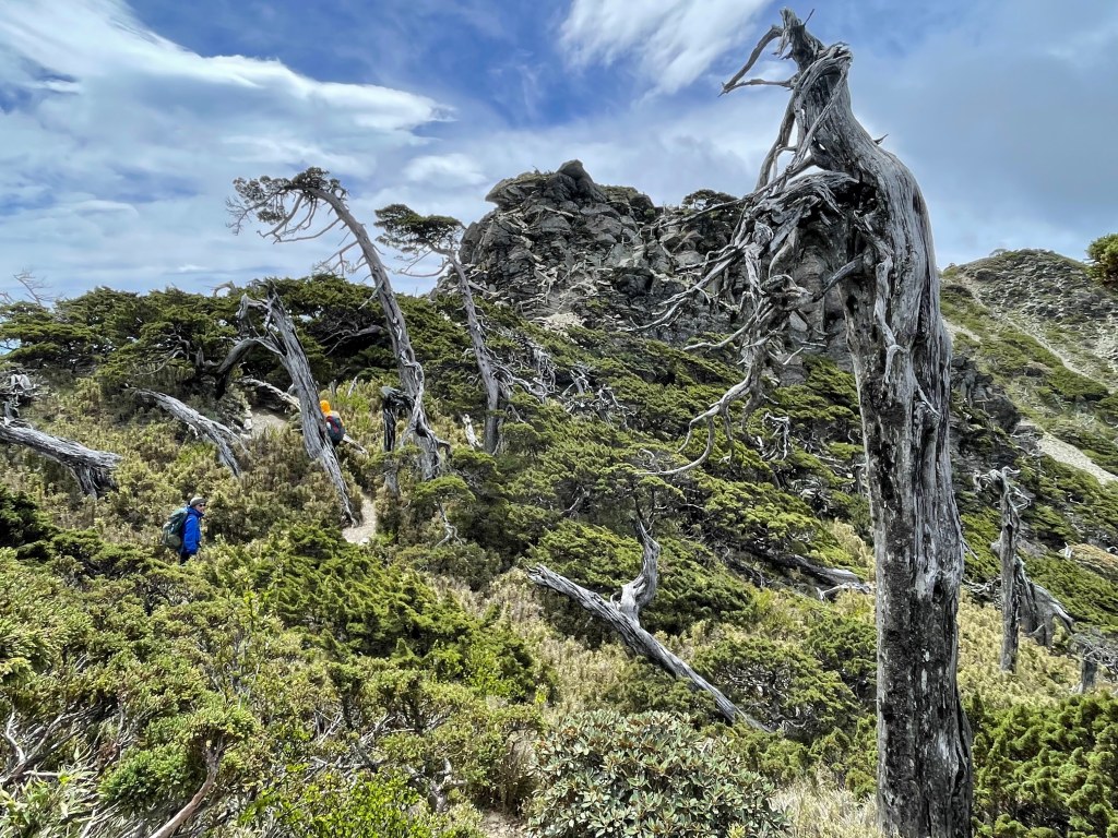 新的高繞路線由林道5.17K開始到林道8.0K的松風嶺止,這一段的距離有1.9K,這也表示改由高繞路走後會比原來的林道路距離上縮短不少!要從海拔H2258m陡上到H2629m,前段比較陡峭,路徑狹窄但布條路徑都清楚,走了500m後,會遇到右側有一條往下的岔路,不要走這一條路徑!這一條路徑下去只是又接回到林道5.5K。繼續直走,再走1.4K的距離,路徑會愈來愈開,但布條卻愈來愈稀少,但就是沿著稜線路走,看到路徑上有一個藍色小帆布的積水池,即會接上林道8.0K的松風嶺。