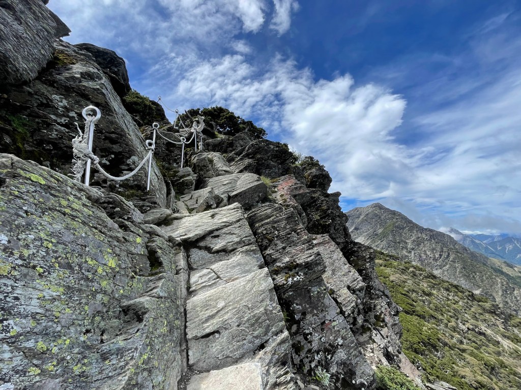 由19K的南湖北山岔,往21.0K的南湖山屋走,這中間要經過19.5K開始的五岩峰,經過五上四下的過程,走在略有驚險感受的岩壁路徑上,但都有繩索可以輔助確保,逐步逐步走不要搶快,拉著繩索都還算安全。這樣的過程要走到20.0K止脫離岩壁區。再往前130m的高峰就是南湖大山北峰,這不是百岳,但站在南湖大山北峰頂,總感覺只比南湖大山矮一些些而已。