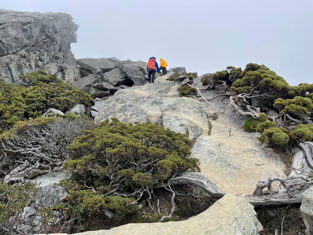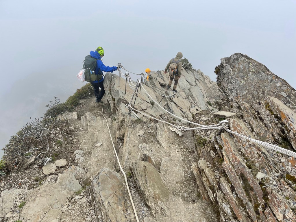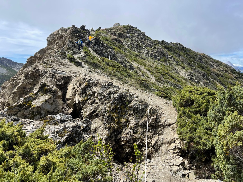 持續往南湖大山走,過了22.5K南峰岔後,路徑直接右轉陡上,路徑轉為岩壁且坡度陡度約有60度,非常辛苦的上到稜線上後,走一段來到22.7K,接上巨大岩壁攀爬區,這也是一段具有驚險視覺效果的一段。