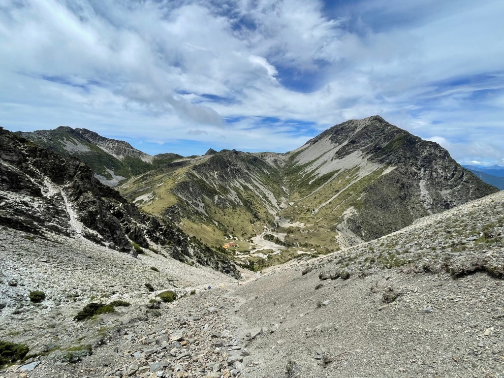 從南湖大山北峰頂,就可以整個看到南湖大山、南湖大山東峰,兩道非常明顯的圈谷地形,也可以看到接著要往下陡降海拔200m的碎石坡,以及碎石坡下的南湖山屋。看著碗形的南湖圈谷,想像著大自然的力量,甚至覺得比雪山圈谷還來得美!當然,這是見仁見智的問題。