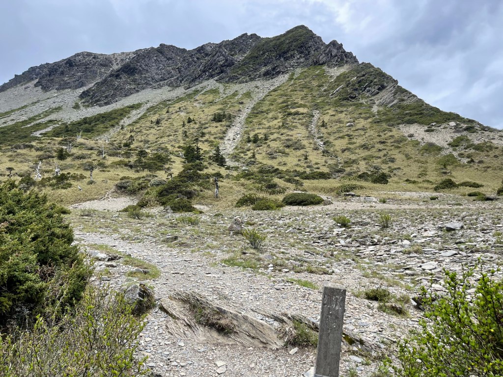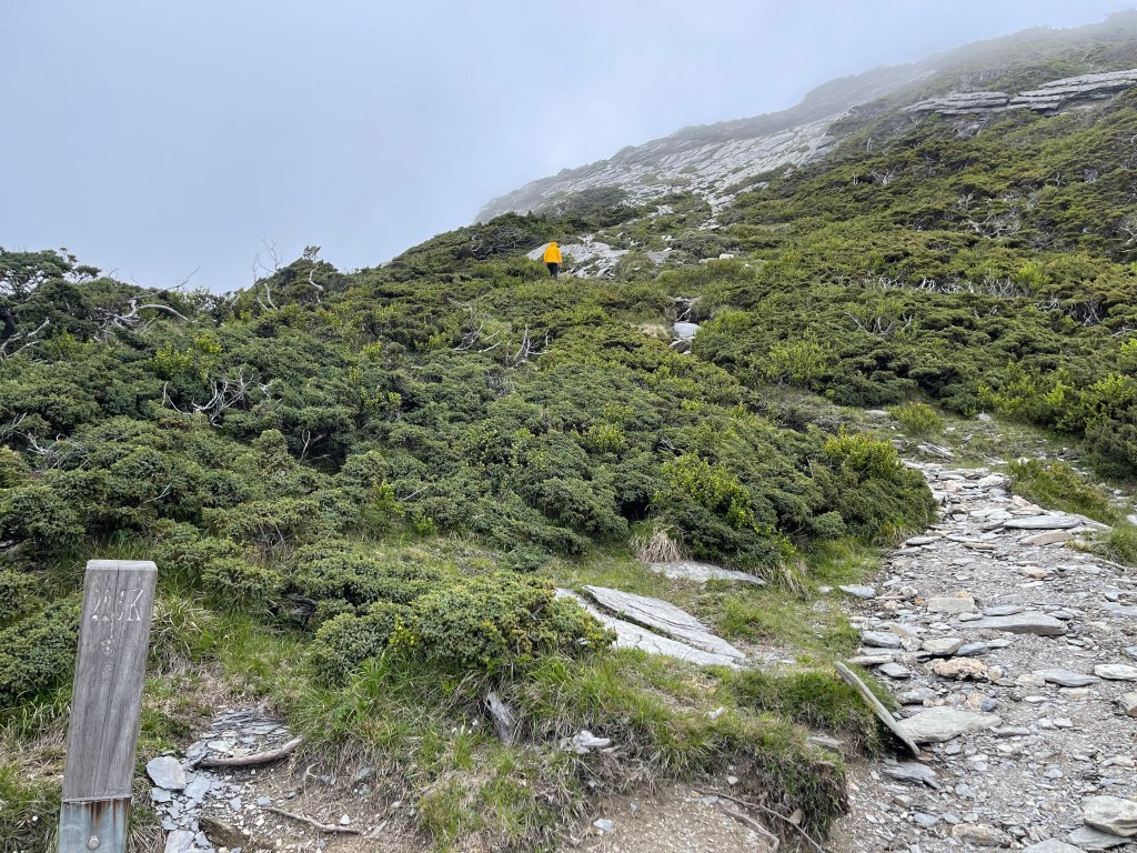 由南湖山莊開始,一直到南湖大山三角點,距離為1.9K,要由海拔H3386m陡上到H3742m。這又要分兩階段來說明,由21.0K的南湖山屋開始到22.5K的南峰岔前,這一段是泥土、碎石交雜,但還算好走,其間會經過22.1K的東峰岔。