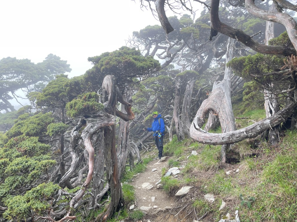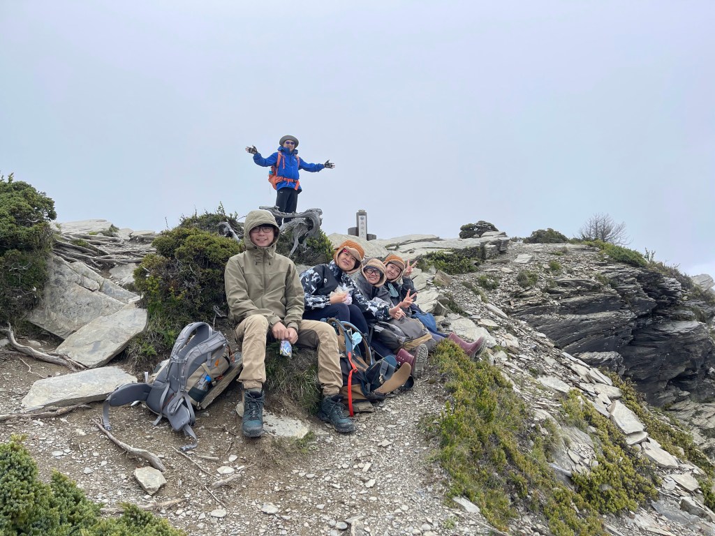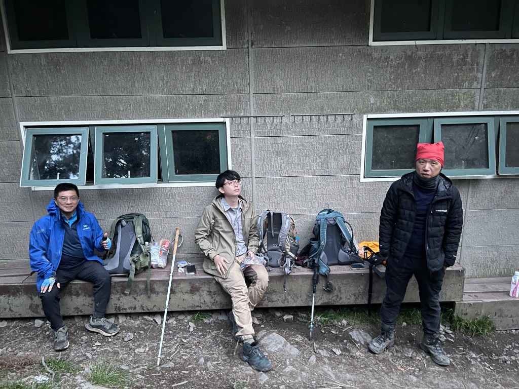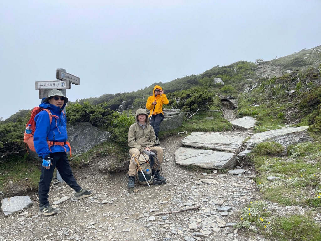 這時,我們想到,已經登頂的David也有準備藥品。因此,Smile與我(Gosen)先往前去追上David,與三角點拍一下照,就直接回走追上嘉鴻,說也奇怪?回到山屋後,嘉鴻的症狀就減輕了。我們一直認為,這一天強風不斷猛吹,也許誘發了嘉鴻的高原反應。
