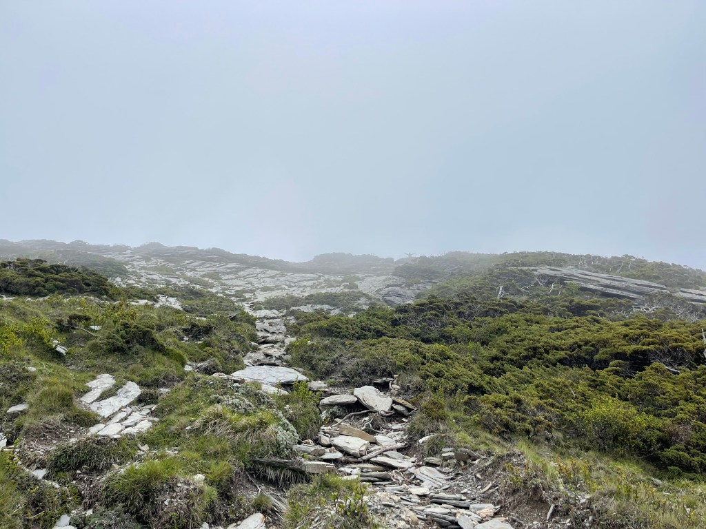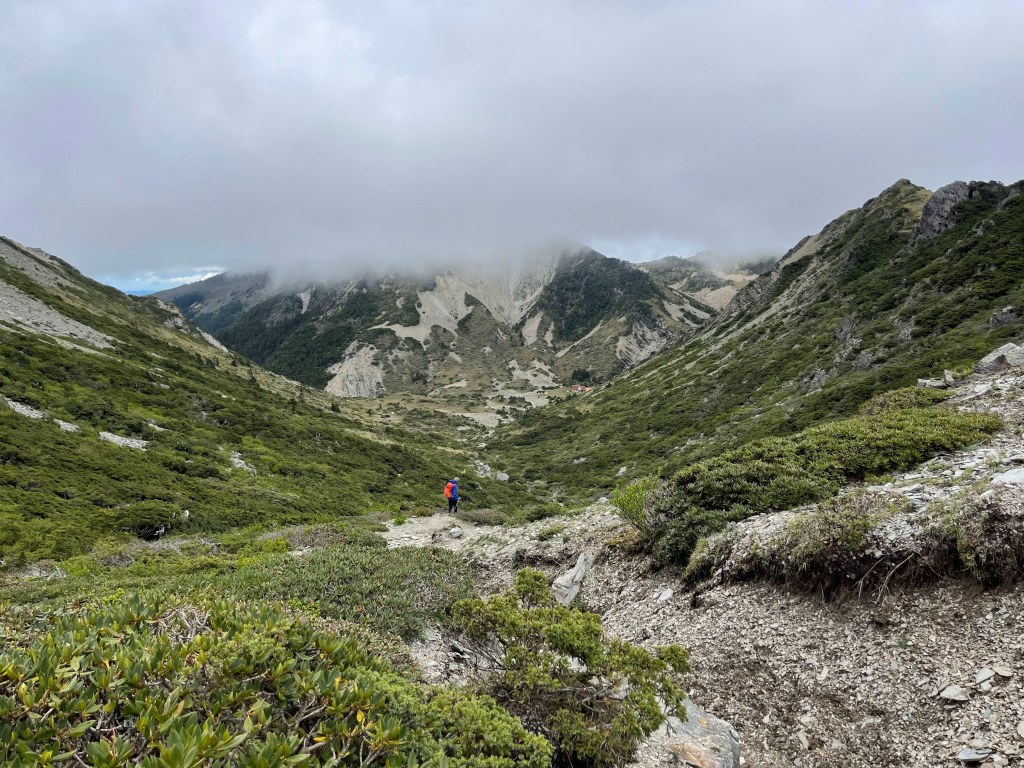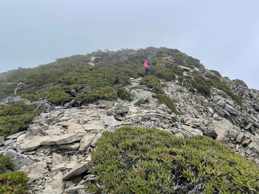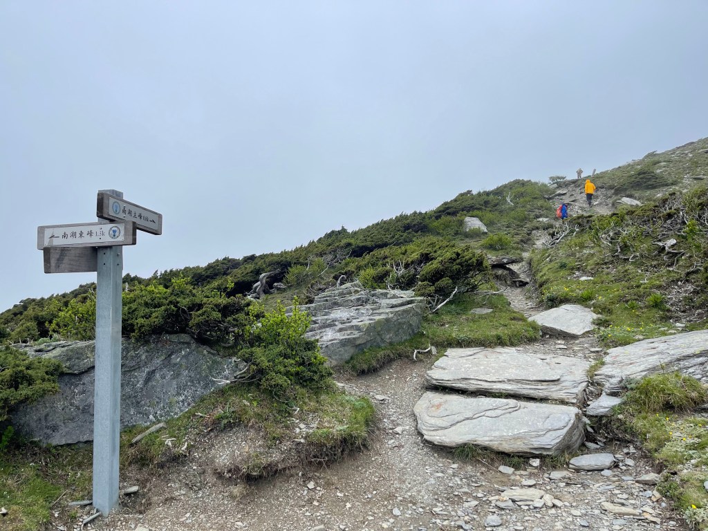 高山上的天氣變化莫測,走在圈谷時還有陽光,一到南峰岔,整個天氣丕變,霧氣籠罩,不用想也知道,登頂必然白牆一片。只能說,南湖大山想讓我對他保持神秘的感受。