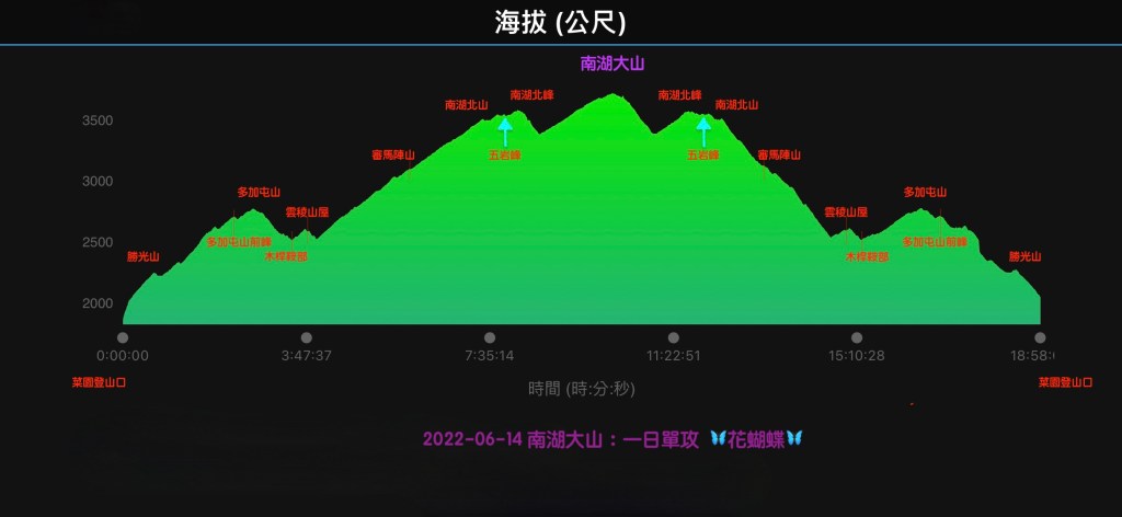 也請朋友們不要笑我們,單攻南湖用了快一天?之前,看過很多山友們的紀錄,神腿級的十五小時就可以完成,體耐力不錯的山友們大多在20小時上下。我們呢?一定不可能,別人單攻,拍照即過,我們單攻,攝影拍照,絕不放過,這就是Smile的個性啊,要記錄,絕不會輕易帶過。所以勒,一路上David及嘉鴻都一直在等待Smile與我的追上,所以,看到我們的靜止時間這麼長,就知道大都在等待拍攝過程中。常看到朋友們的單攻紀錄,像是Willgun Chen的大叔有夢!也一直在想,什麼時候,換我?