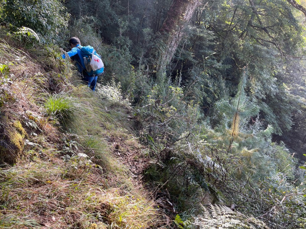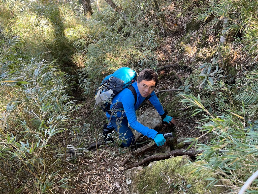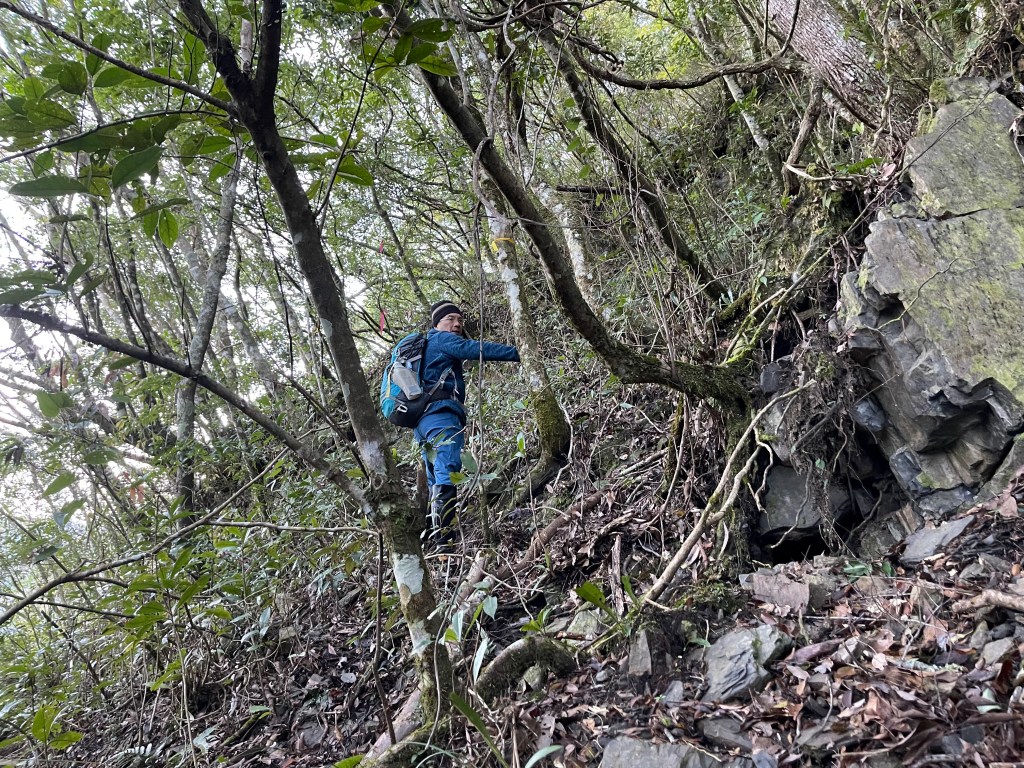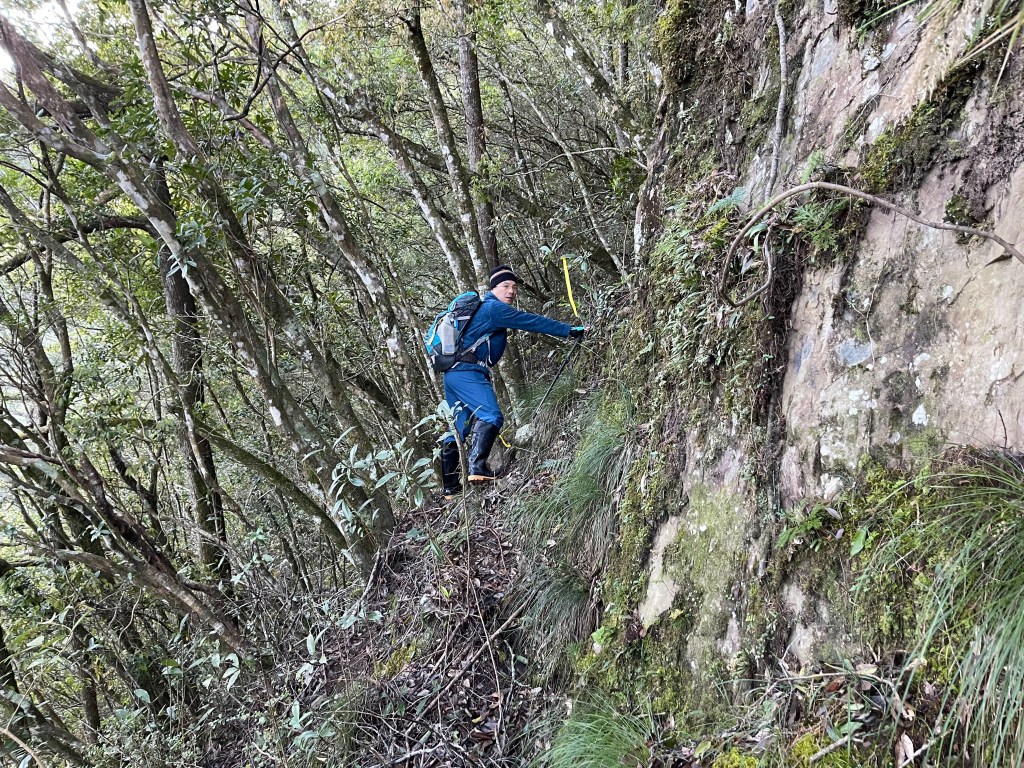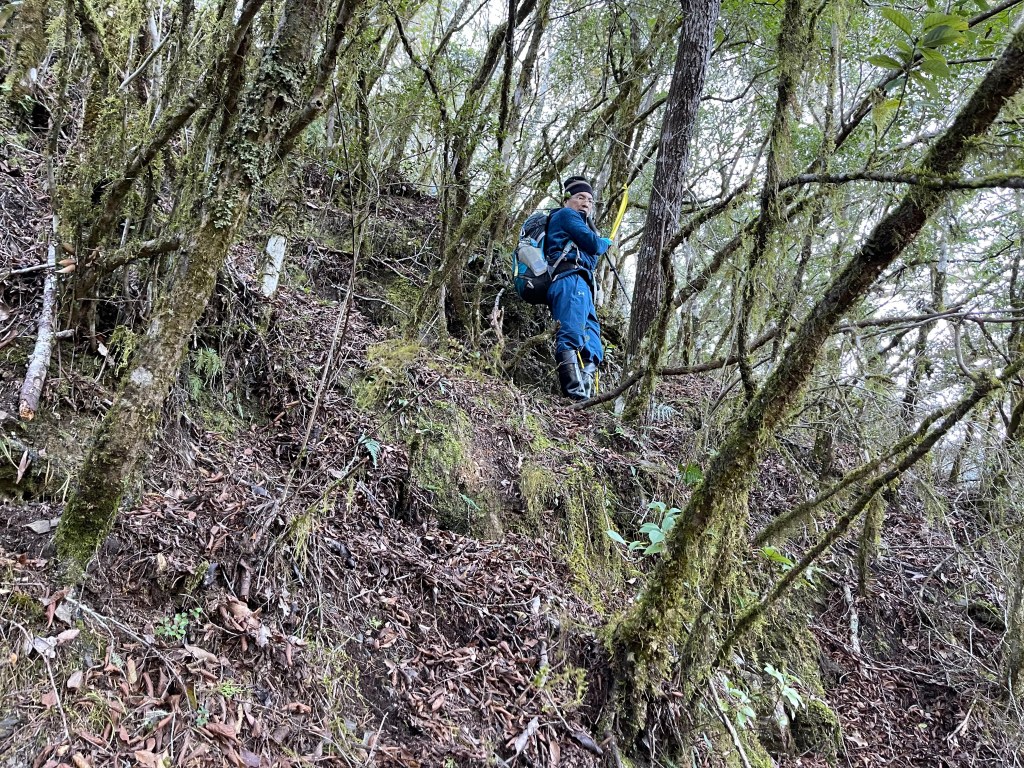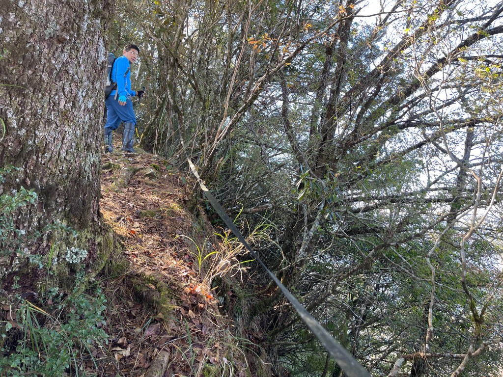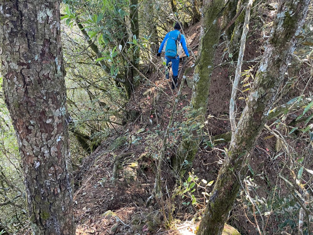 到了2420峰前,可以選擇走右上山峰稜線,也可以選擇走左邊腰繞,我們選左邊腰繞,這一段腰繞路要注意一下,左側的邊坡都蠻深的,接回另一邊腰繞稜線岔後,馬上轉為極陡下需輔助繩索的斷崖!接著,沿著時寬時窄的稜線一路陡下,此時穿梭在杜鵑林裏,透過無線電Leo說他已抵達布奴加里山,而此時我們還要經過兩個2200峰的上下起伏考驗。