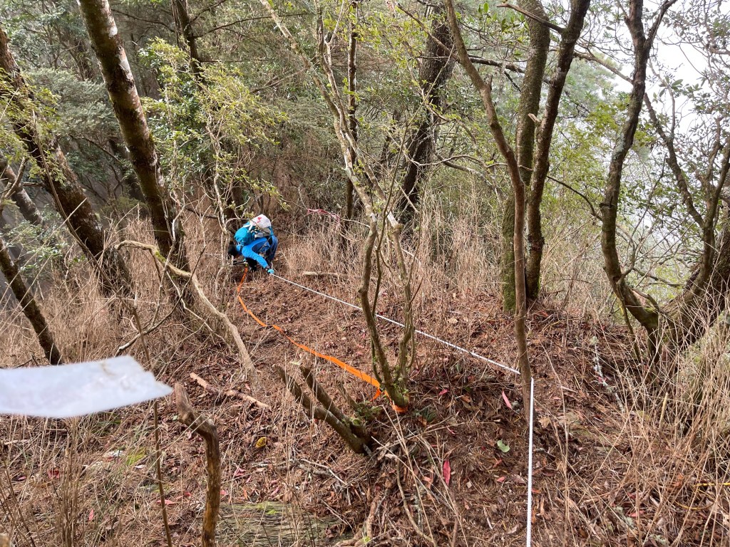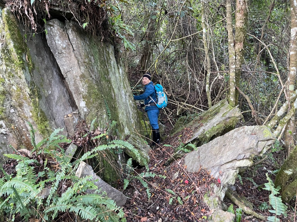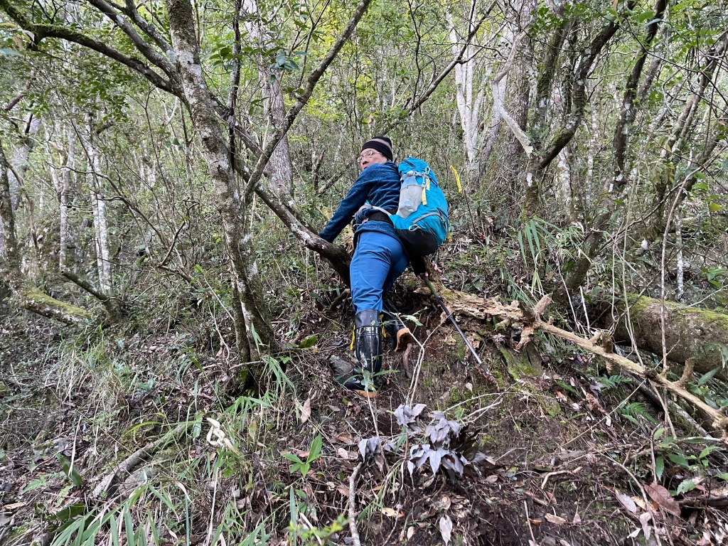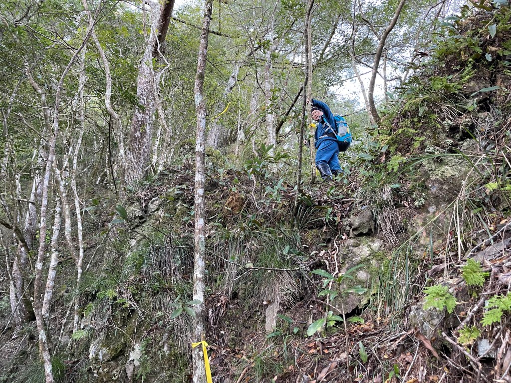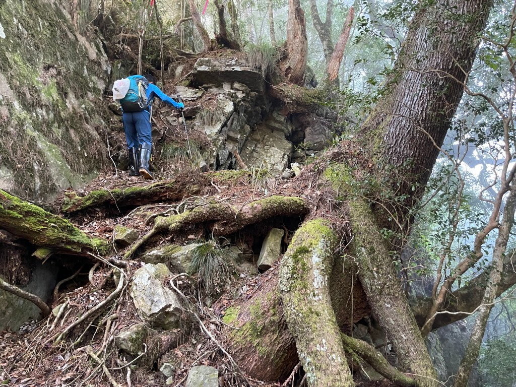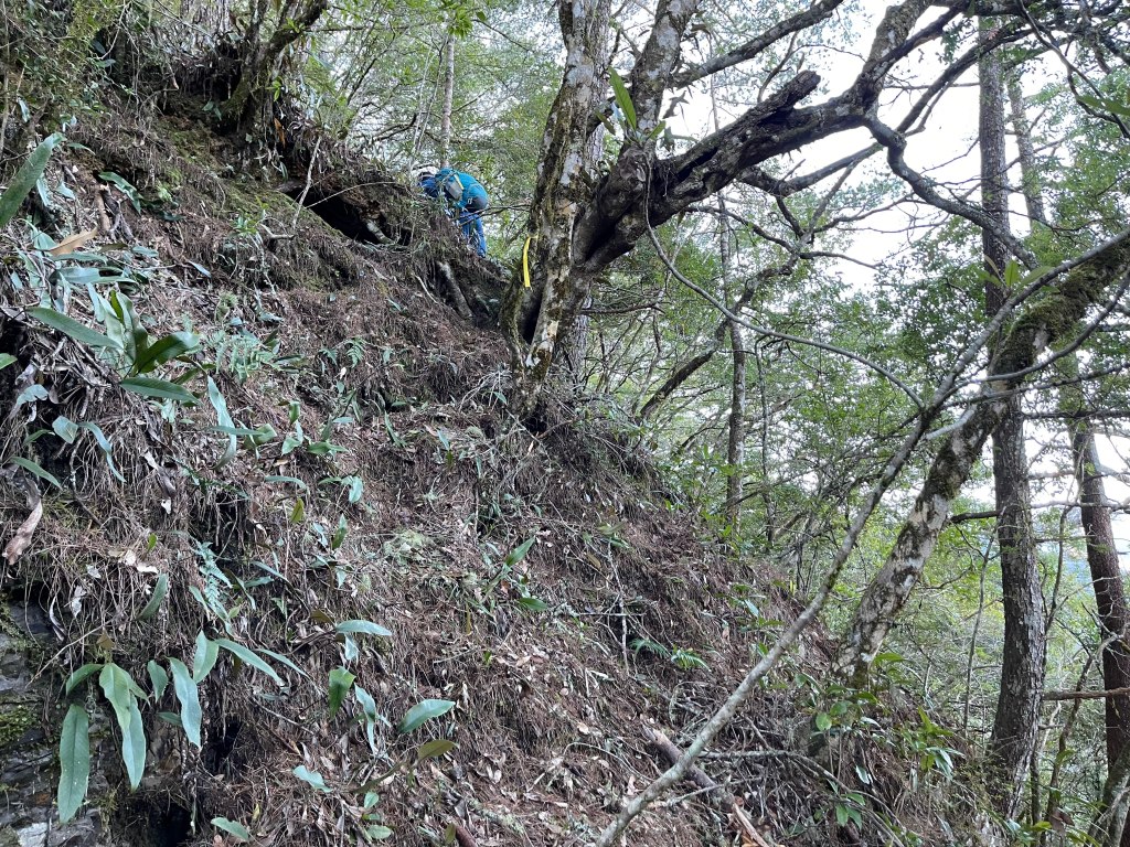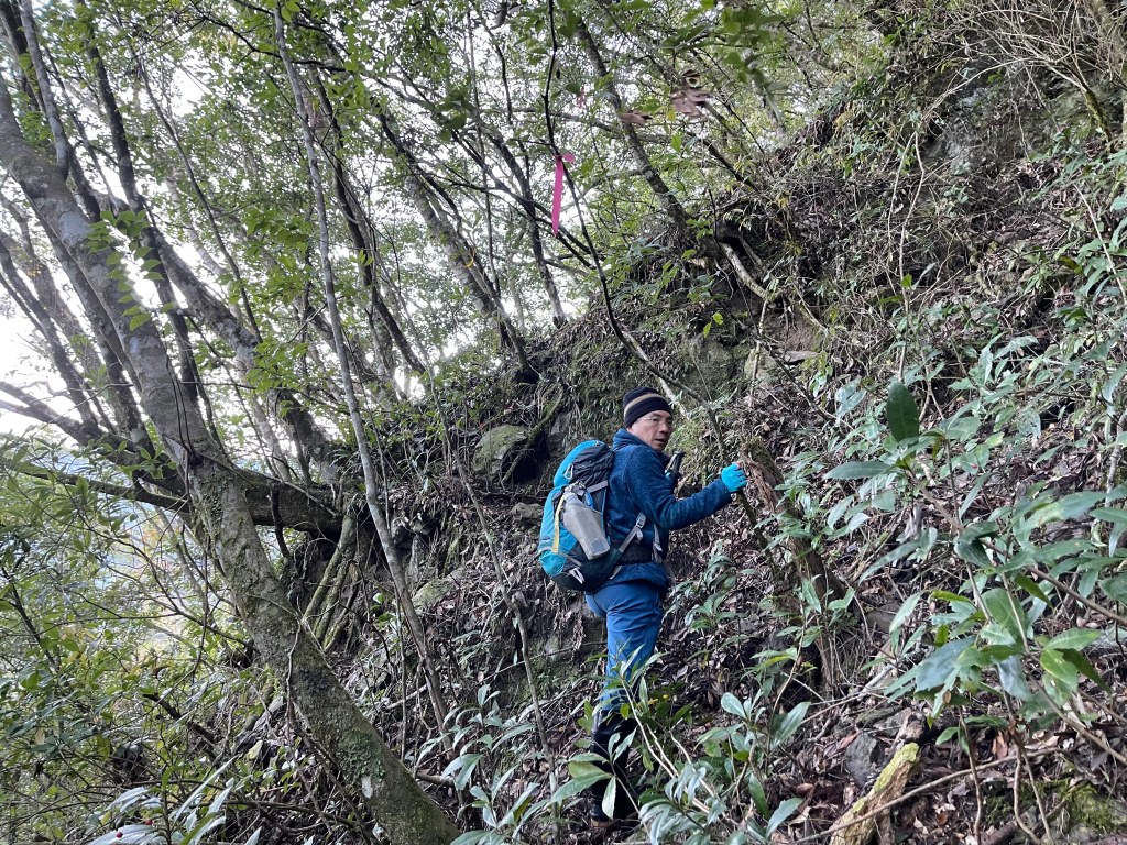到了2420峰前,可以選擇走右上山峰稜線,也可以選擇走左邊腰繞,我們選左邊腰繞,這一段腰繞路要注意一下,左側的邊坡都蠻深的,接回另一邊腰繞稜線岔後,馬上轉為極陡下需輔助繩索的斷崖!接著,沿著時寬時窄的稜線一路陡下,此時穿梭在杜鵑林裏,透過無線電Leo說他已抵達布奴加里山,而此時我們還要經過兩個2200峰的上下起伏考驗。