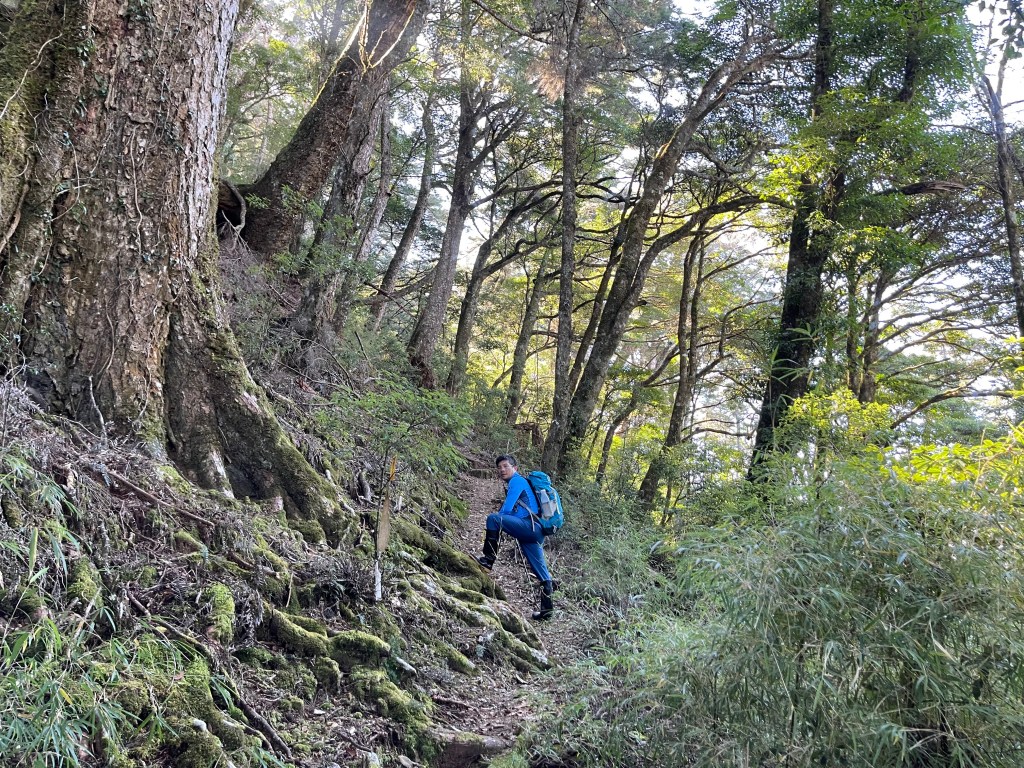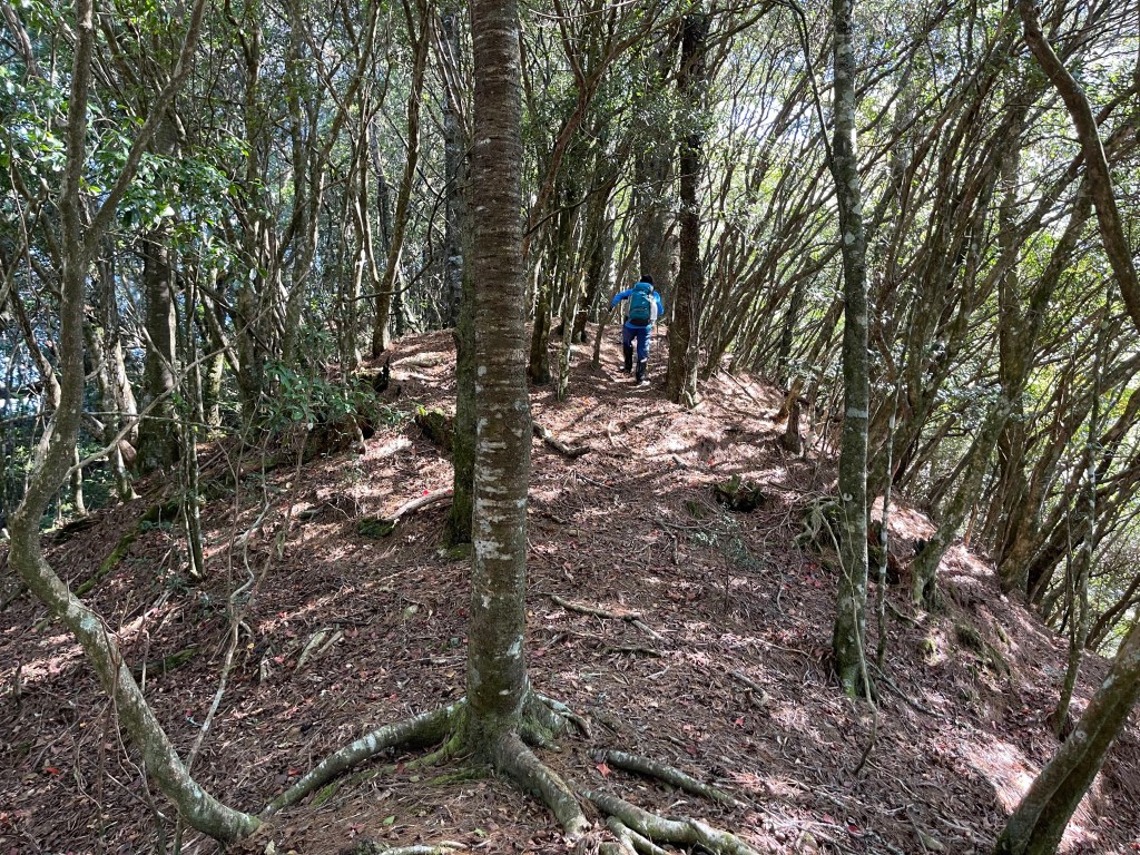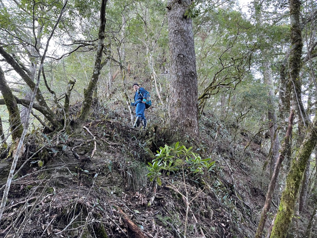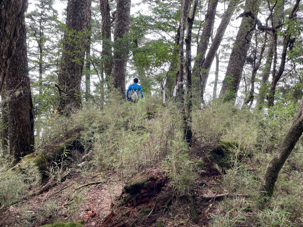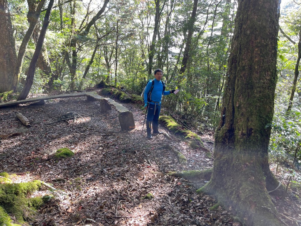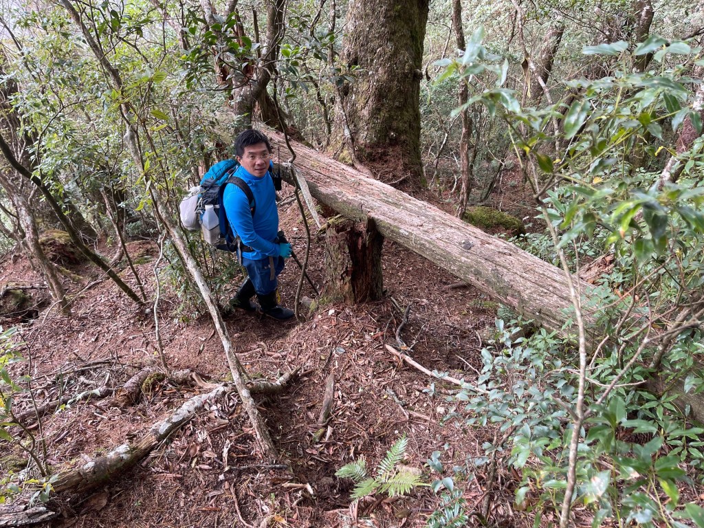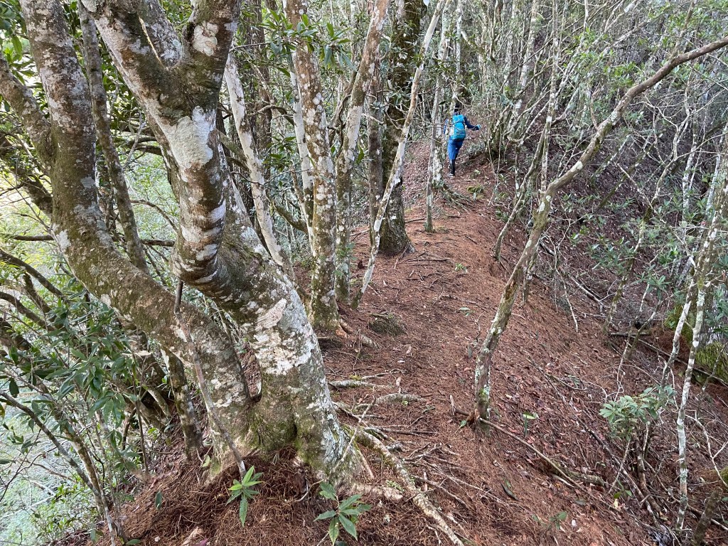 過2420峰前,都是優美平緩路徑,沒想到我們走了40分鐘後,突然發現Leo居然又從後面超過我們😧,原來他沒在看GPS,剛剛不小心走錯了一段路徑,發現沒路了才拿出GPS修正路線。再來會經過L型長板凳休息區,這裡往左岔就是以前往大霸尖山的路徑,我們要往右下走。
