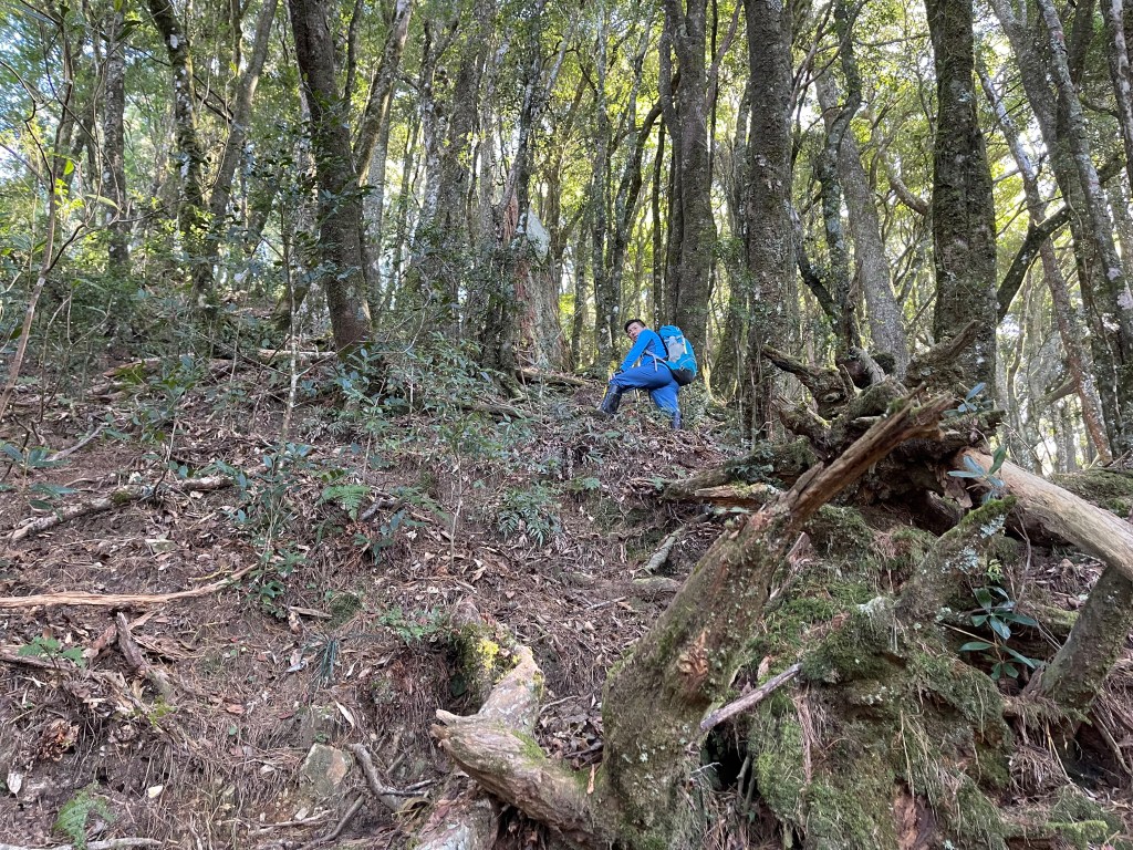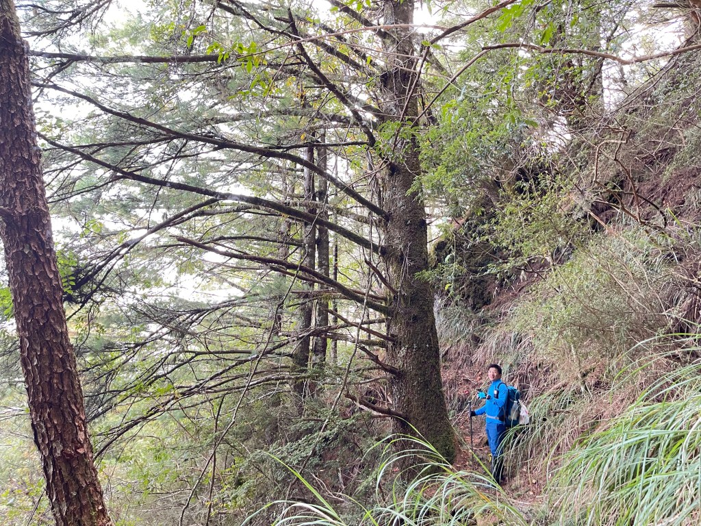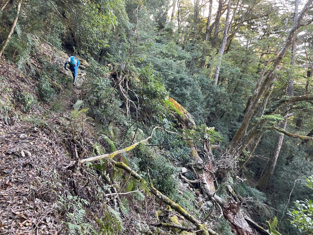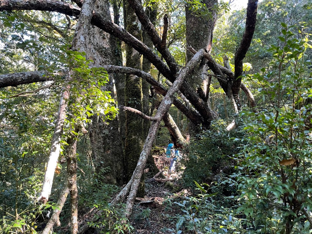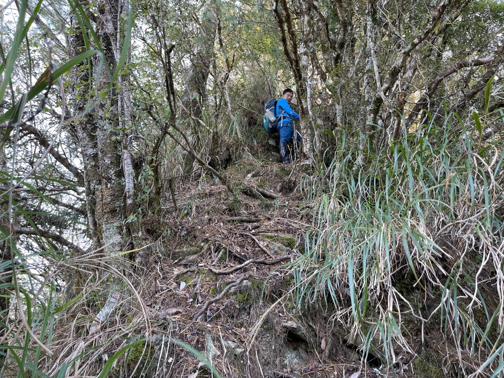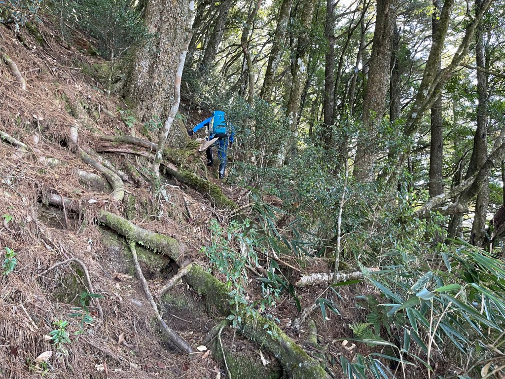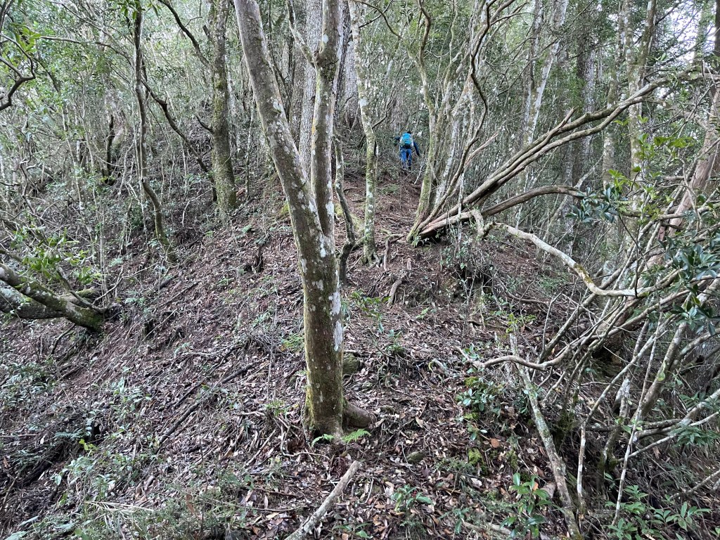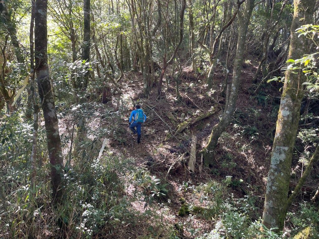 過2420峰前,都是優美平緩路徑,沒想到我們走了40分鐘後,突然發現Leo居然又從後面超過我們😧,原來他沒在看GPS,剛剛不小心走錯了一段路徑,發現沒路了才拿出GPS修正路線。再來會經過L型長板凳休息區,這裡往左岔就是以前往大霸尖山的路徑,我們要往右下走。