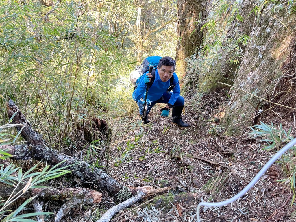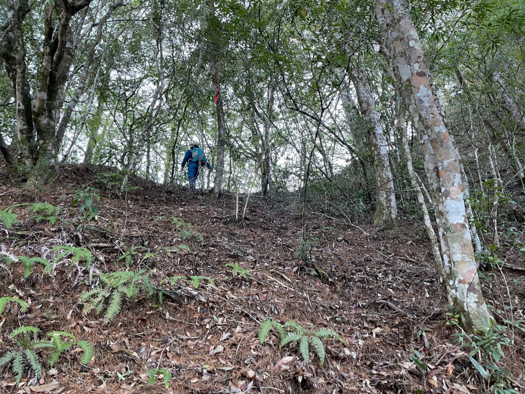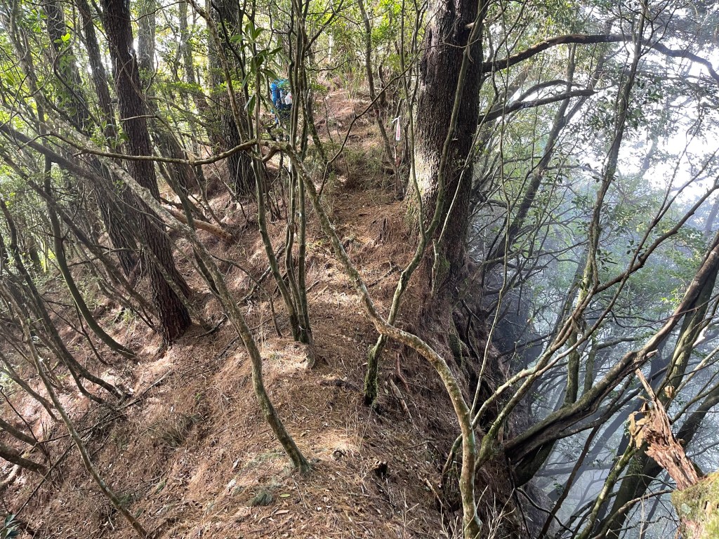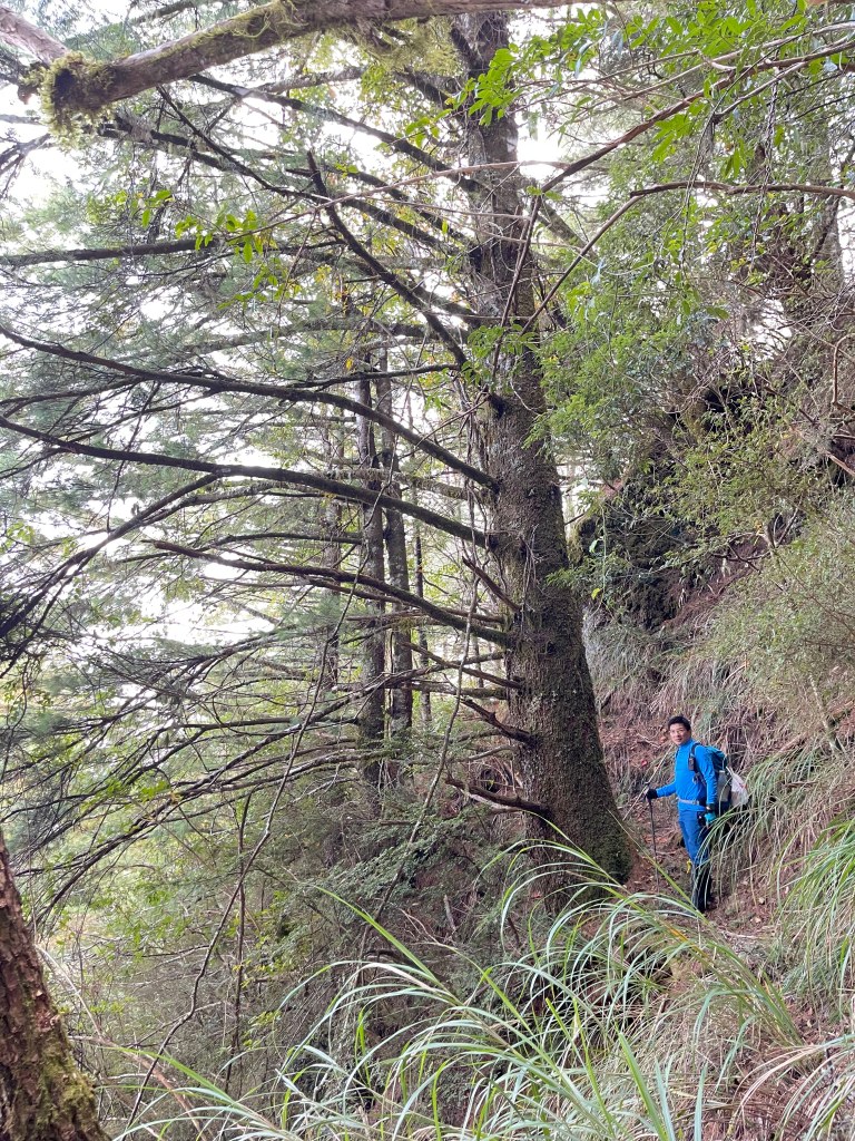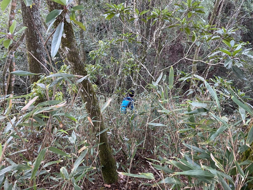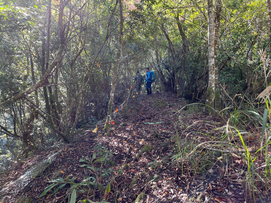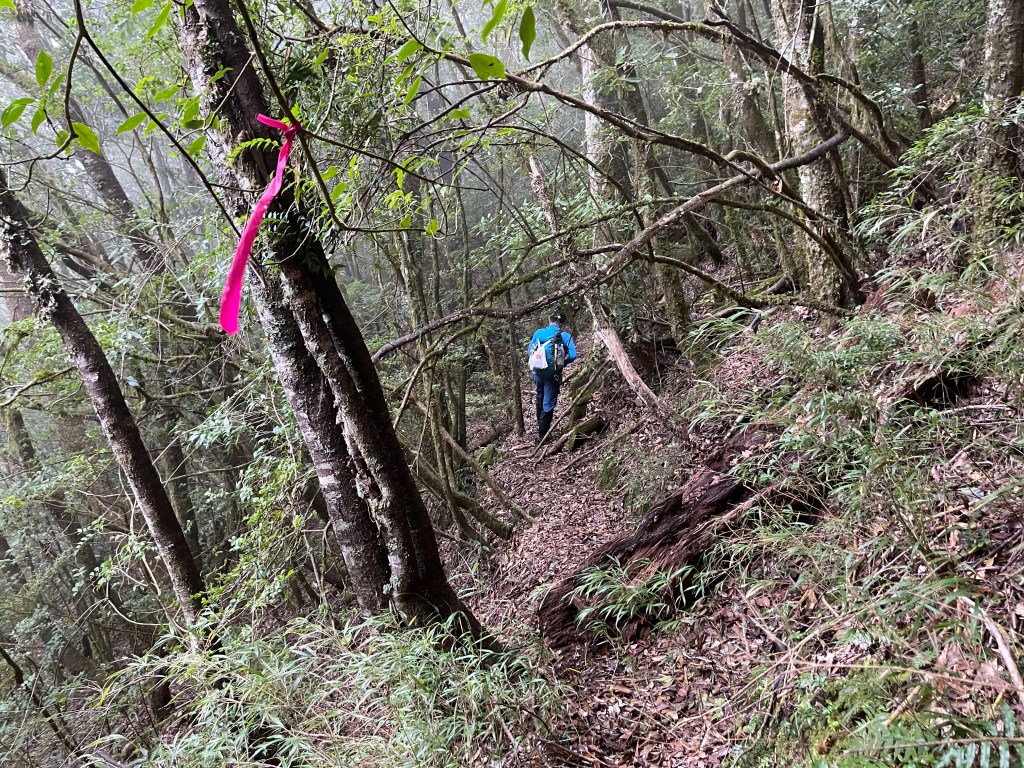 過2420峰前,都是優美平緩路徑,沒想到我們走了40分鐘後,突然發現Leo居然又從後面超過我們😧,原來他沒在看GPS,剛剛不小心走錯了一段路徑,發現沒路了才拿出GPS修正路線。再來會經過L型長板凳休息區,這裡往左岔就是以前往大霸尖山的路徑,我們要往右下走。