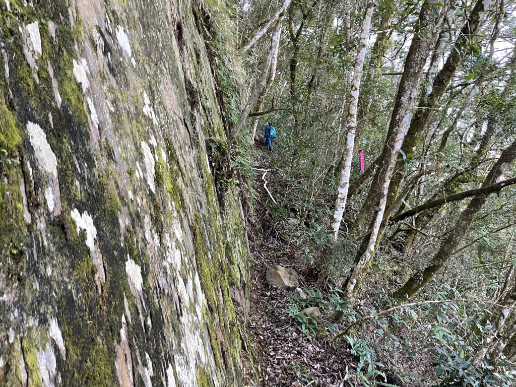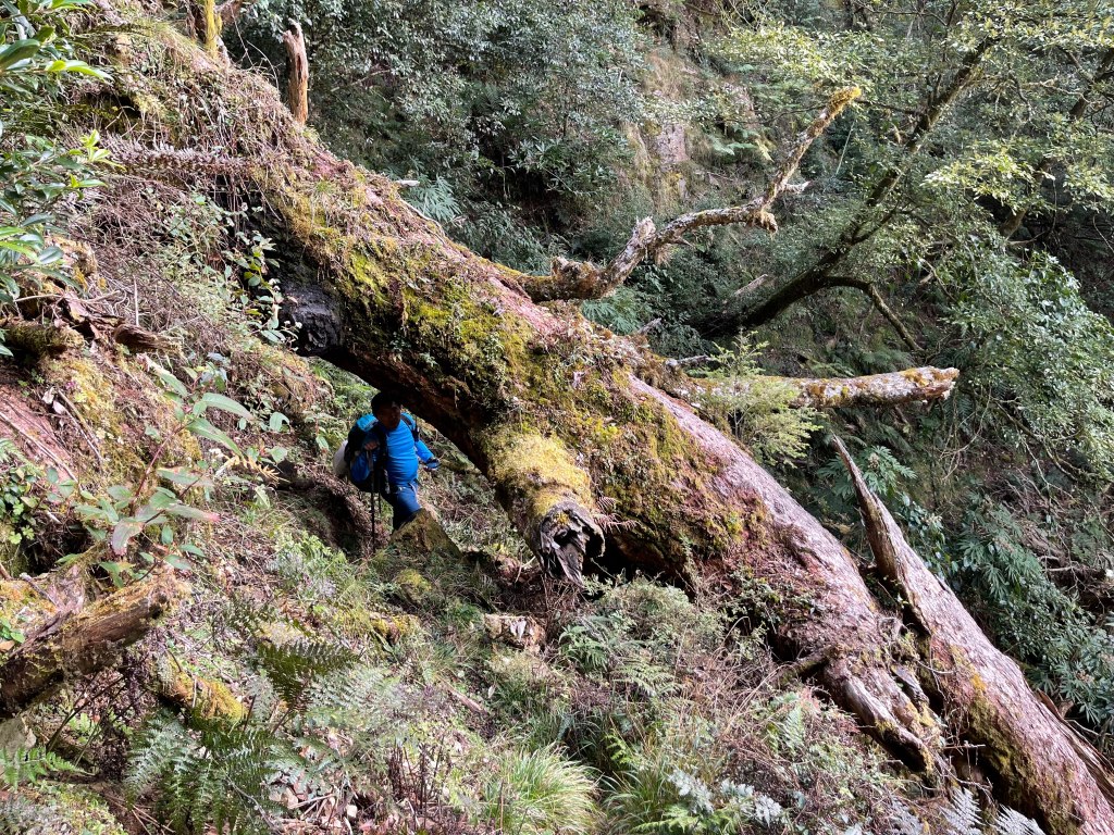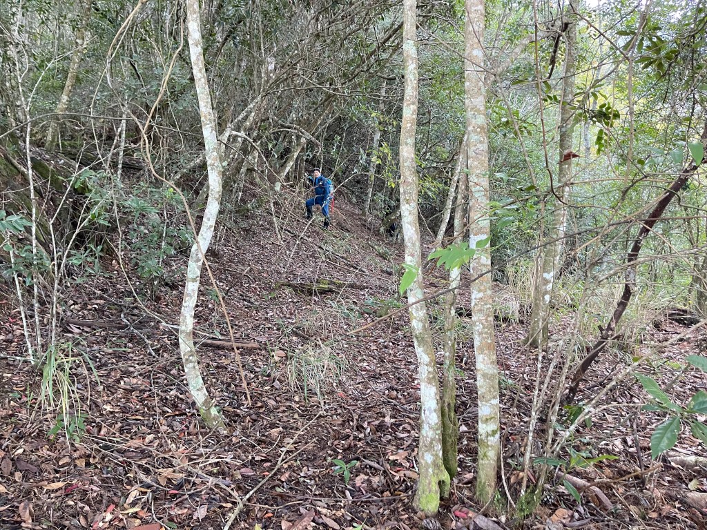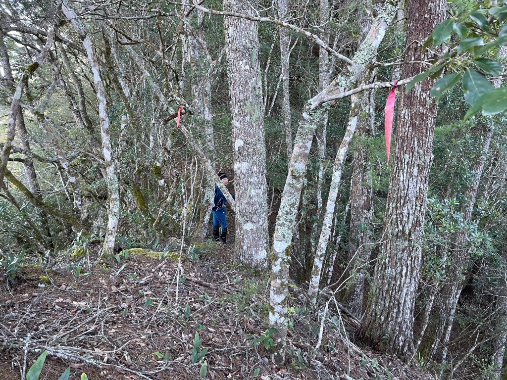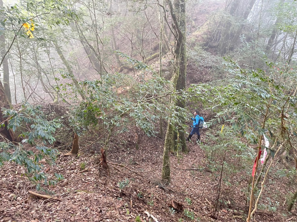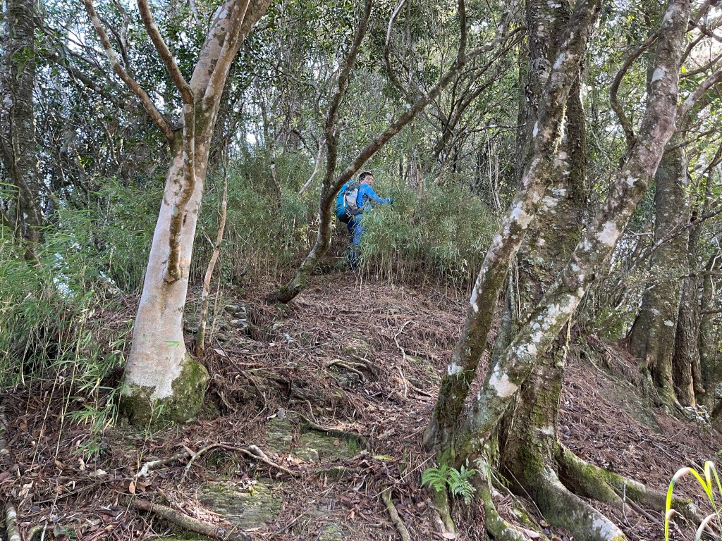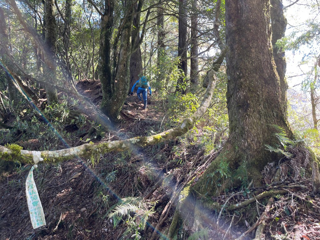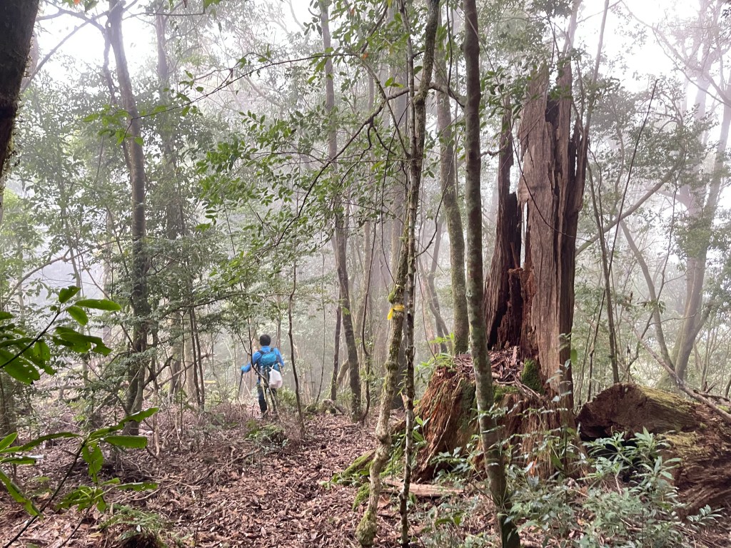 過2420峰前,都是優美平緩路徑,沒想到我們走了40分鐘後,突然發現Leo居然又從後面超過我們😧,原來他沒在看GPS,剛剛不小心走錯了一段路徑,發現沒路了才拿出GPS修正路線。再來會經過L型長板凳休息區,這裡往左岔就是以前往大霸尖山的路徑,我們要往右下走。