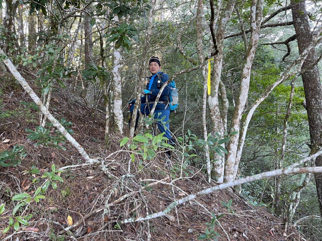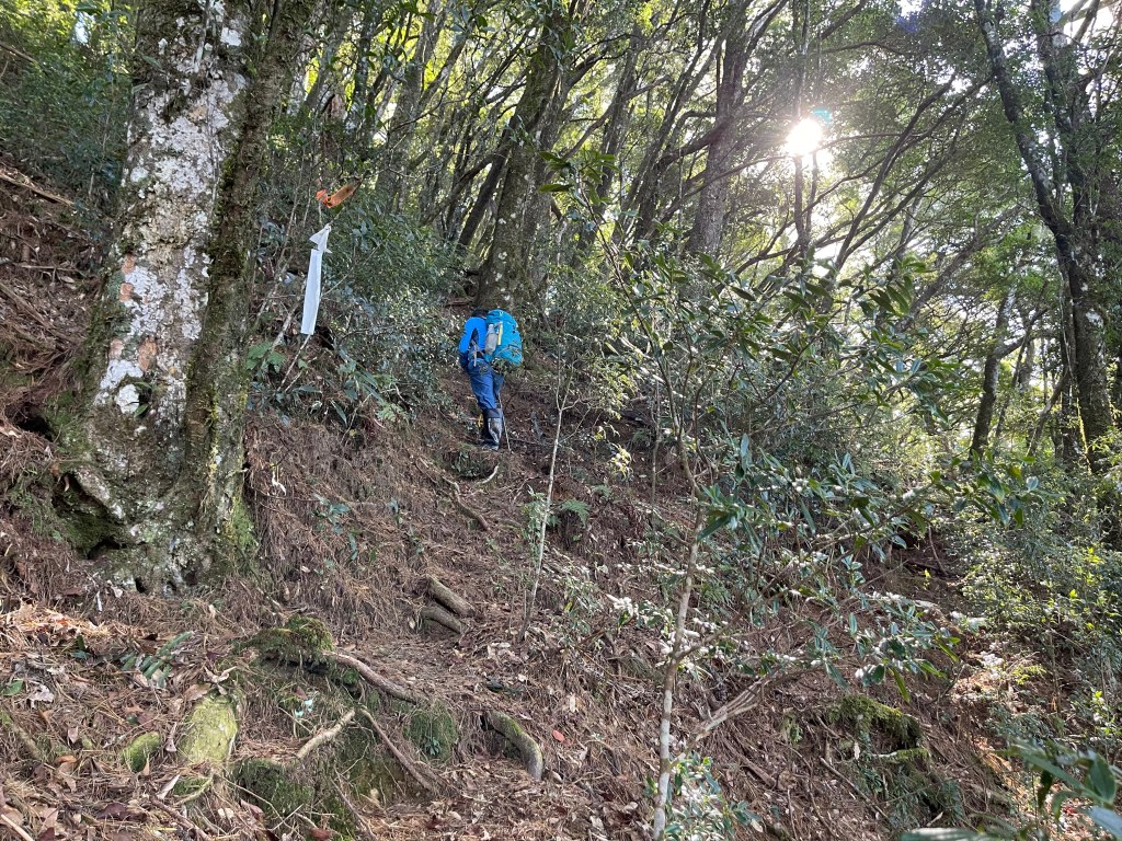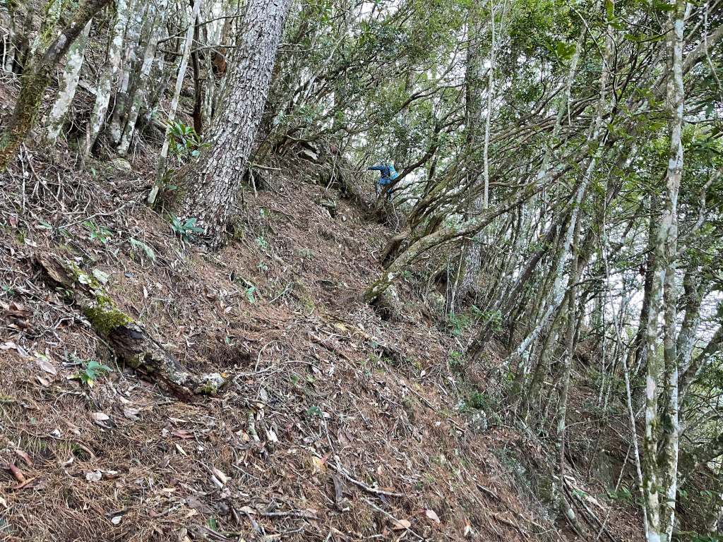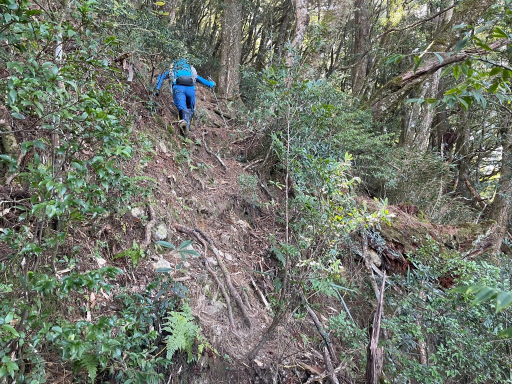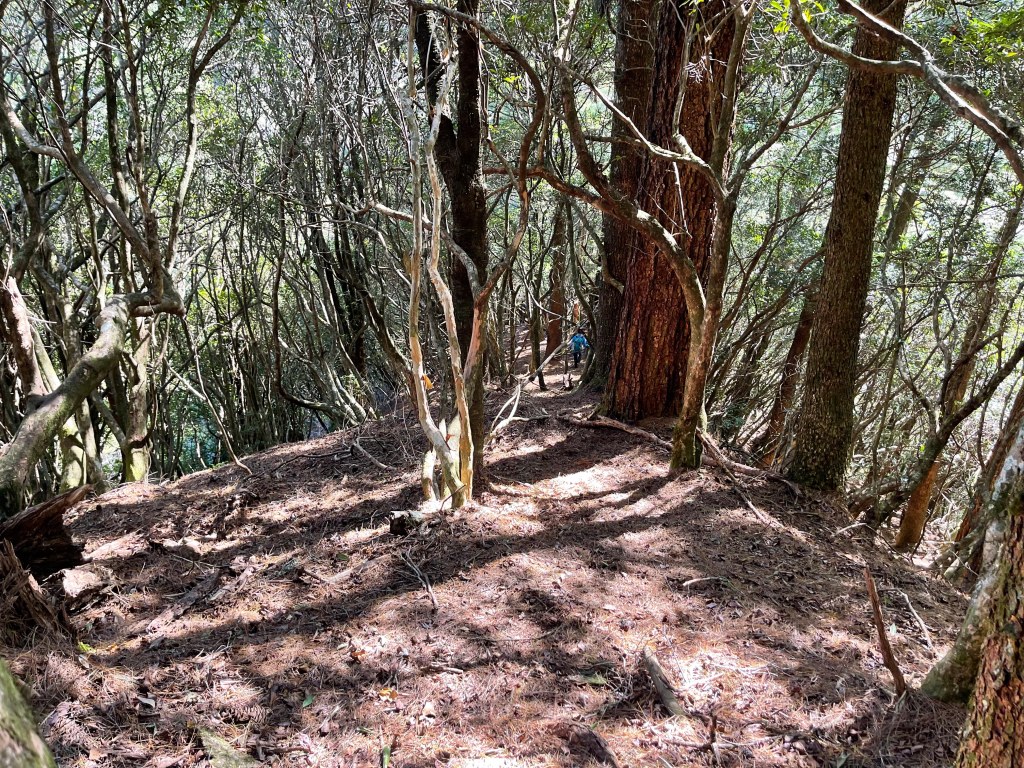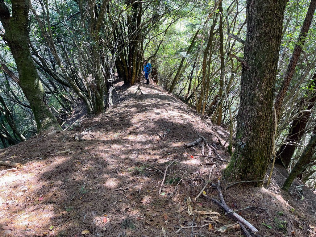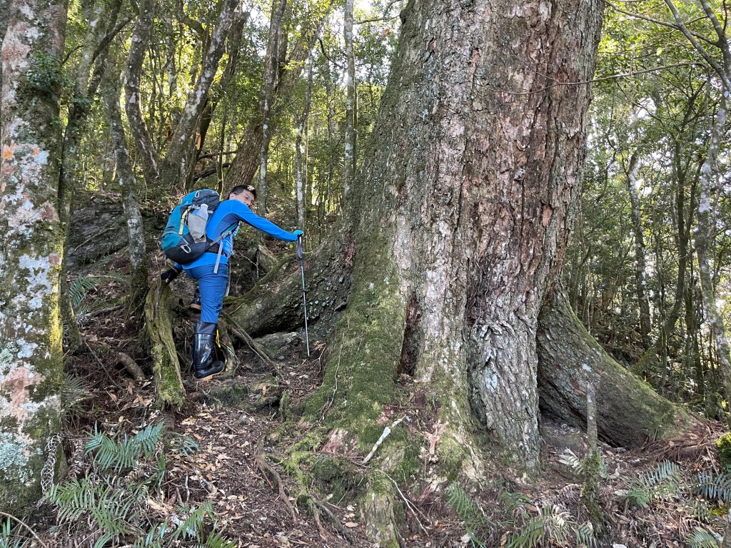 過2420峰前,都是優美平緩路徑,沒想到我們走了40分鐘後,突然發現Leo居然又從後面超過我們😧,原來他沒在看GPS,剛剛不小心走錯了一段路徑,發現沒路了才拿出GPS修正路線。再來會經過L型長板凳休息區,這裡往左岔就是以前往大霸尖山的路徑,我們要往右下走。