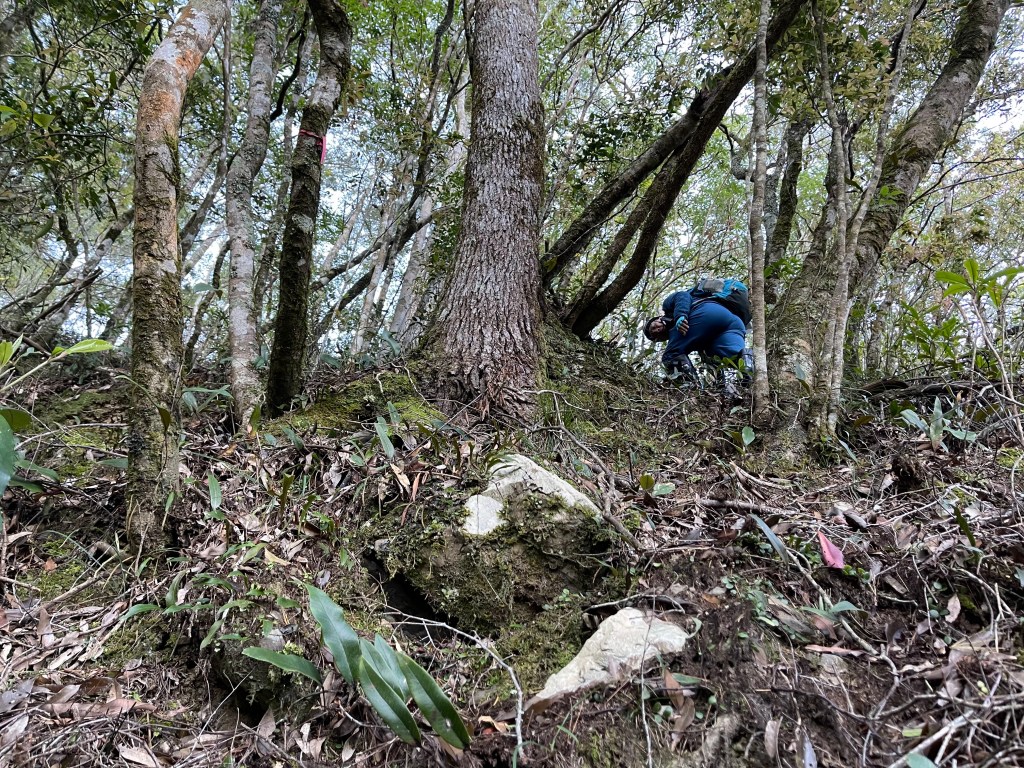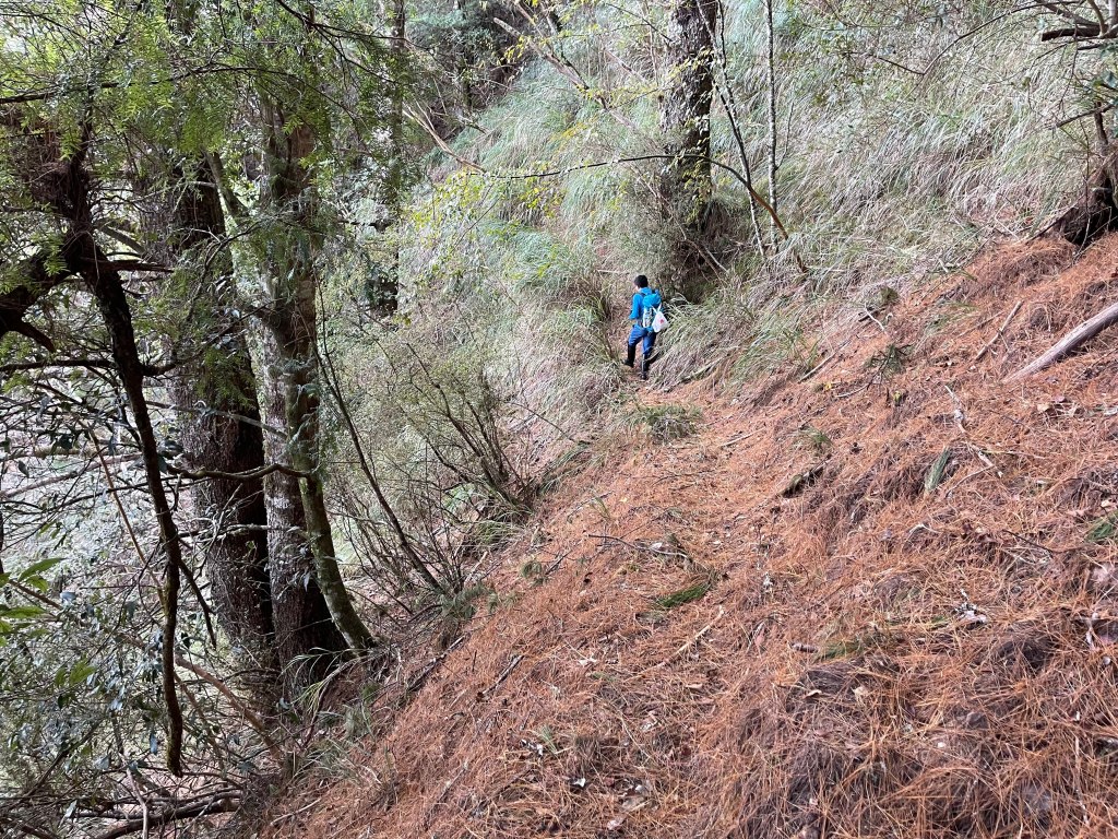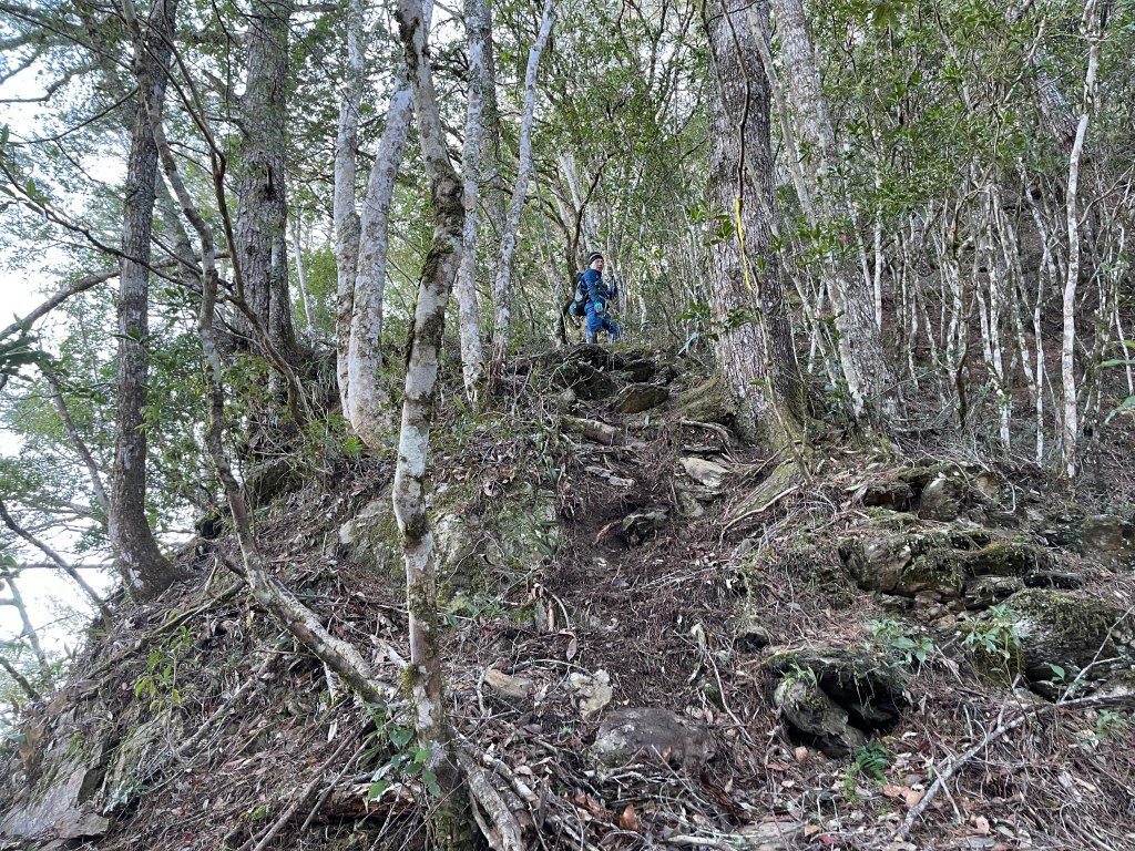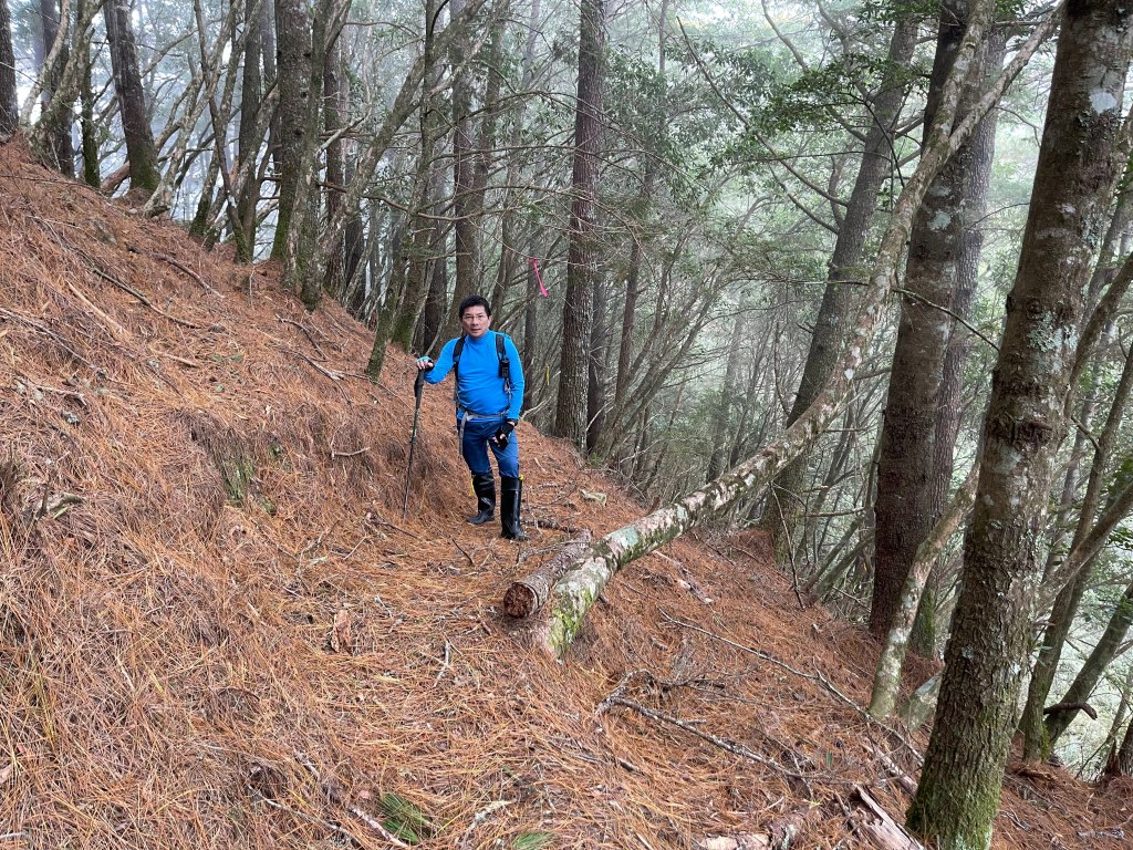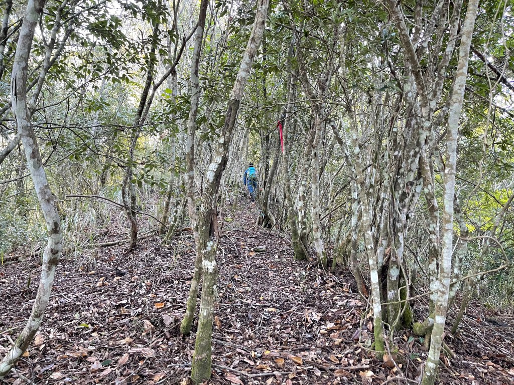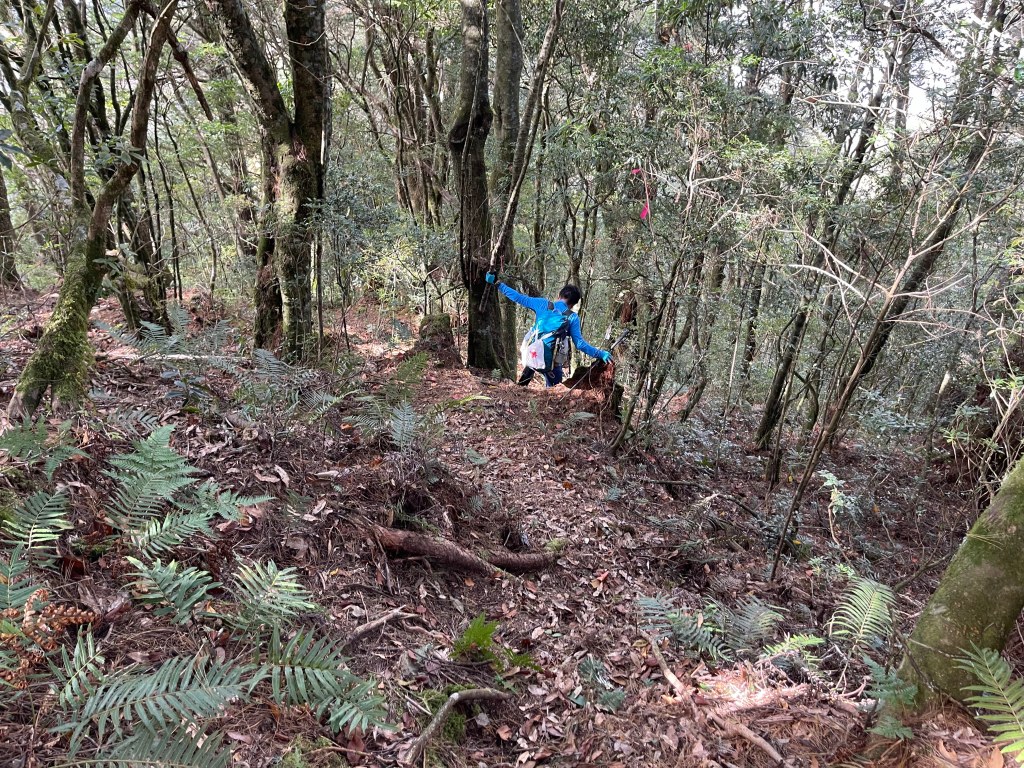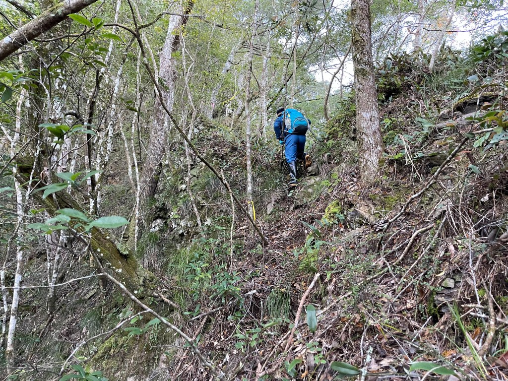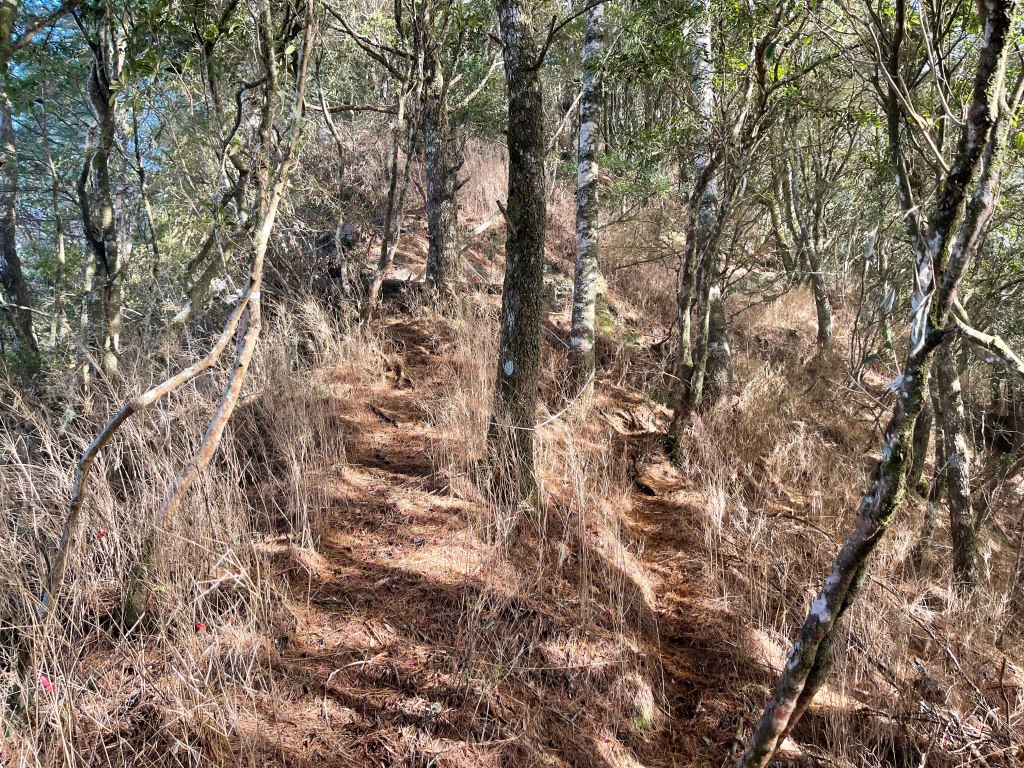 過2420峰前,都是優美平緩路徑,沒想到我們走了40分鐘後,突然發現Leo居然又從後面超過我們😧,原來他沒在看GPS,剛剛不小心走錯了一段路徑,發現沒路了才拿出GPS修正路線。再來會經過L型長板凳休息區,這裡往左岔就是以前往大霸尖山的路徑,我們要往右下走。