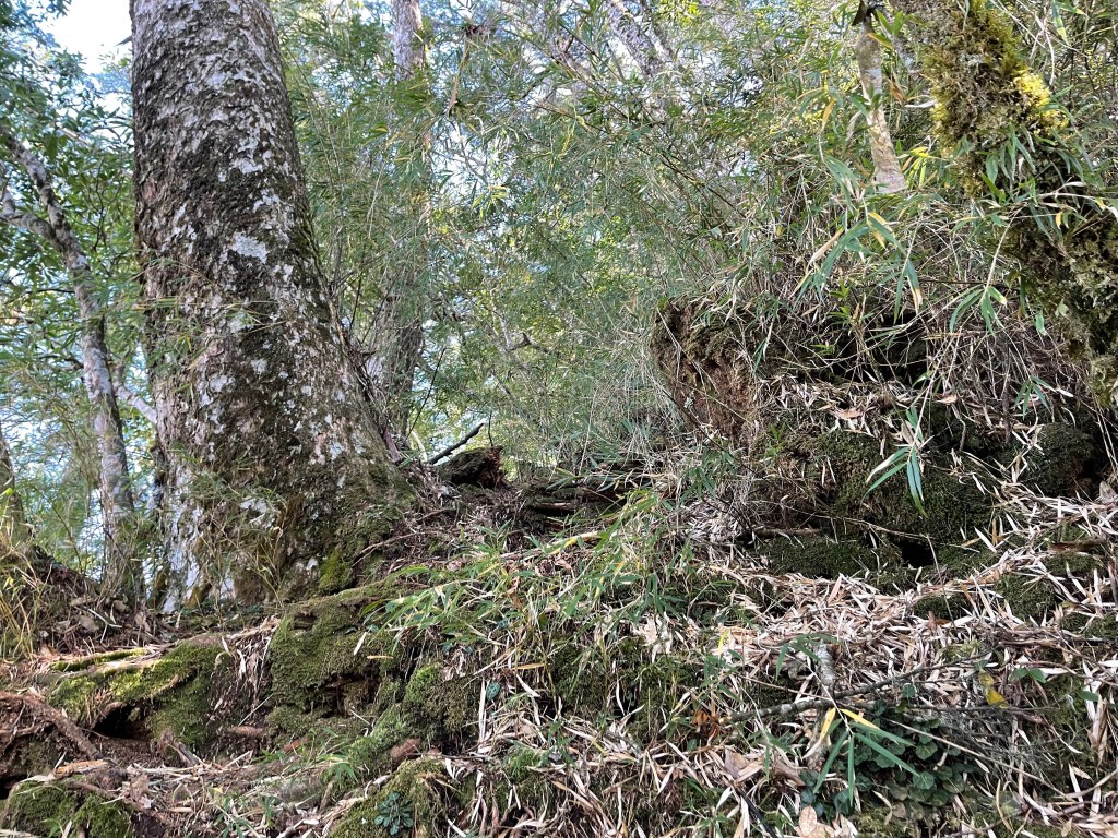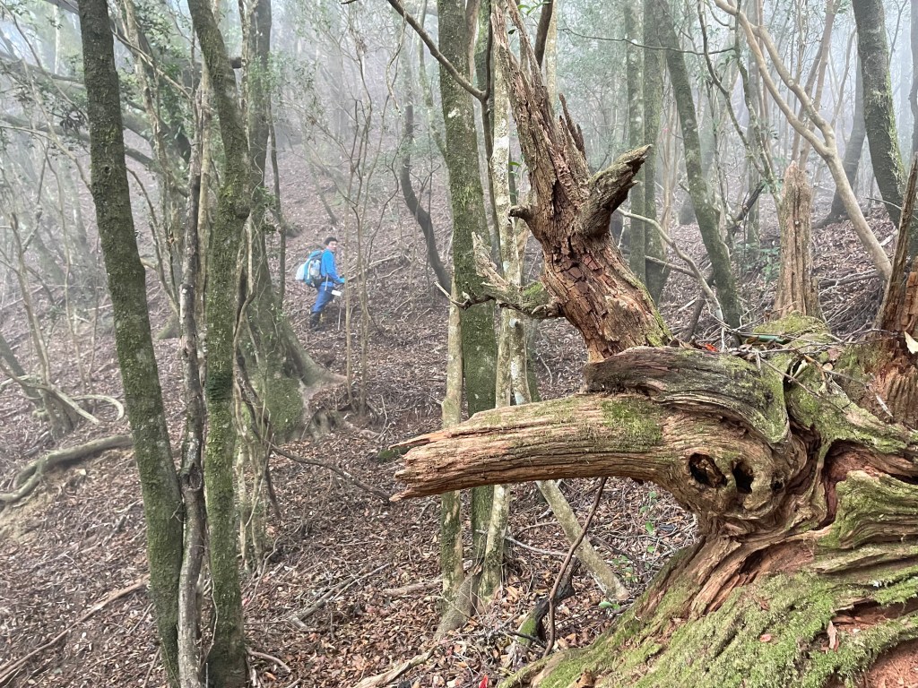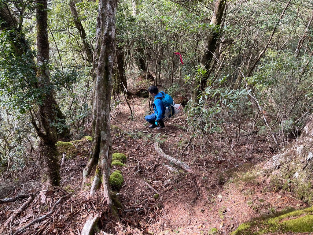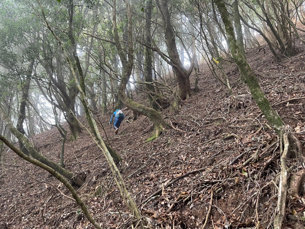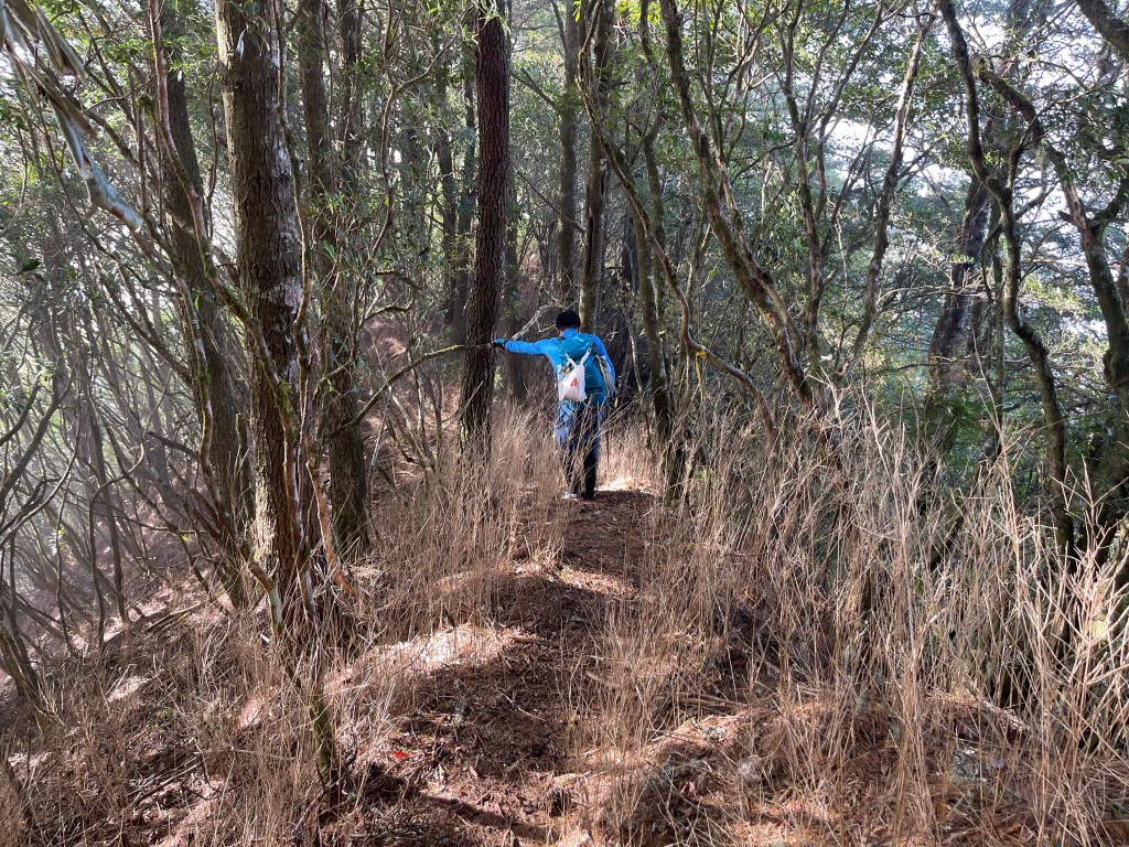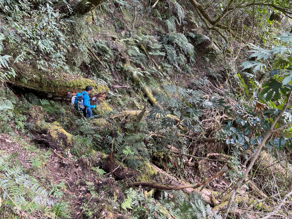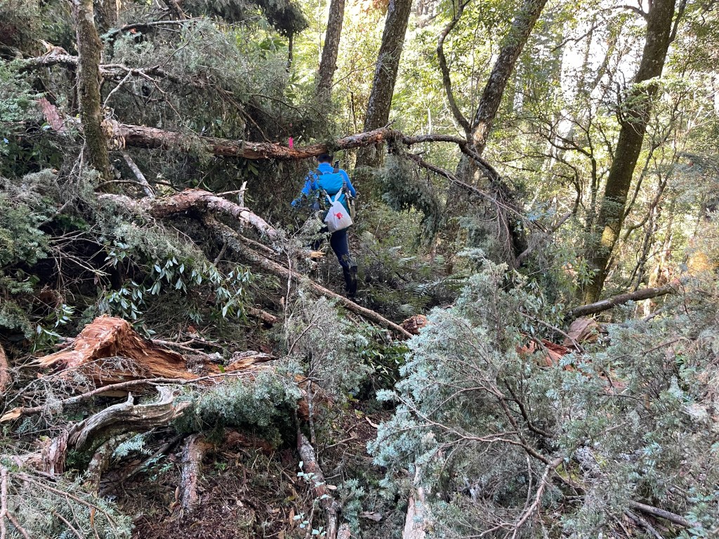 過2420峰前,都是優美平緩路徑,沒想到我們走了40分鐘後,突然發現Leo居然又從後面超過我們😧,原來他沒在看GPS,剛剛不小心走錯了一段路徑,發現沒路了才拿出GPS修正路線。再來會經過L型長板凳休息區,這裡往左岔就是以前往大霸尖山的路徑,我們要往右下走。