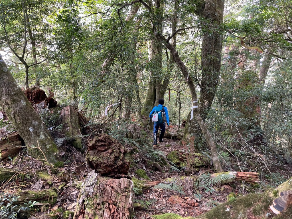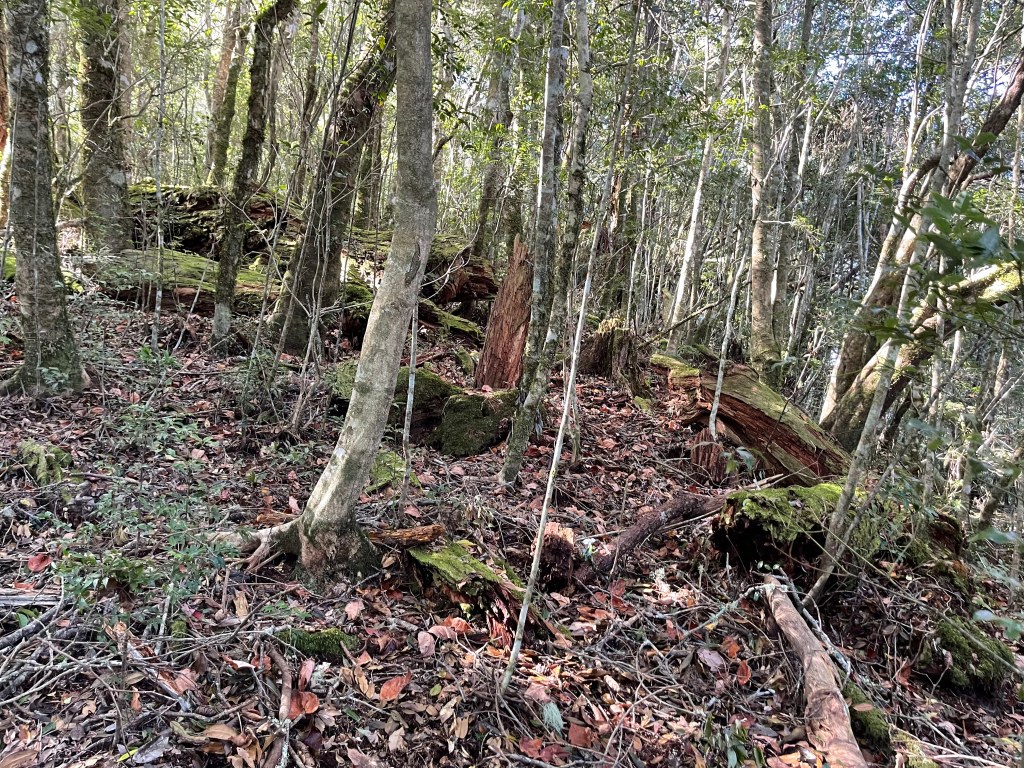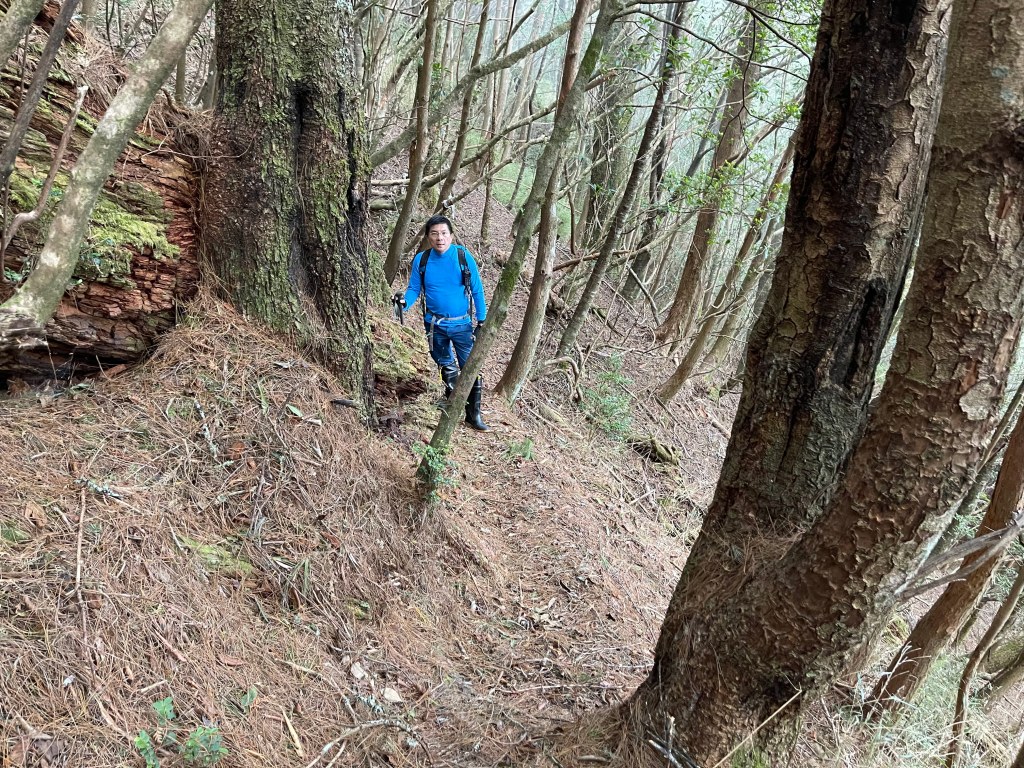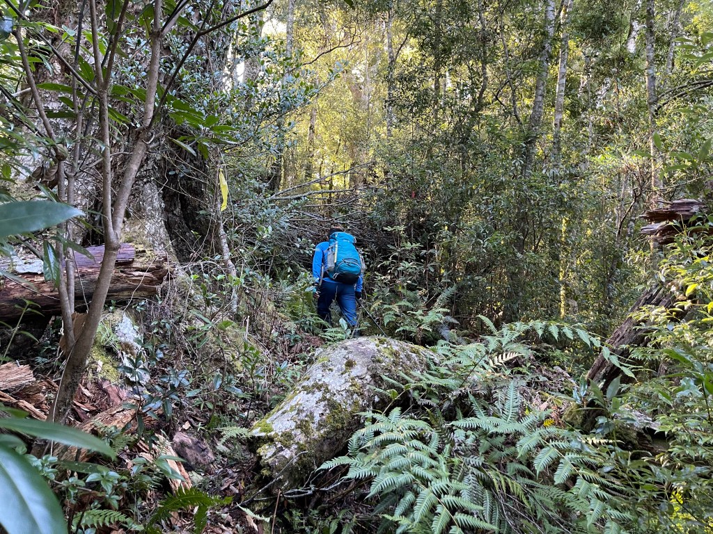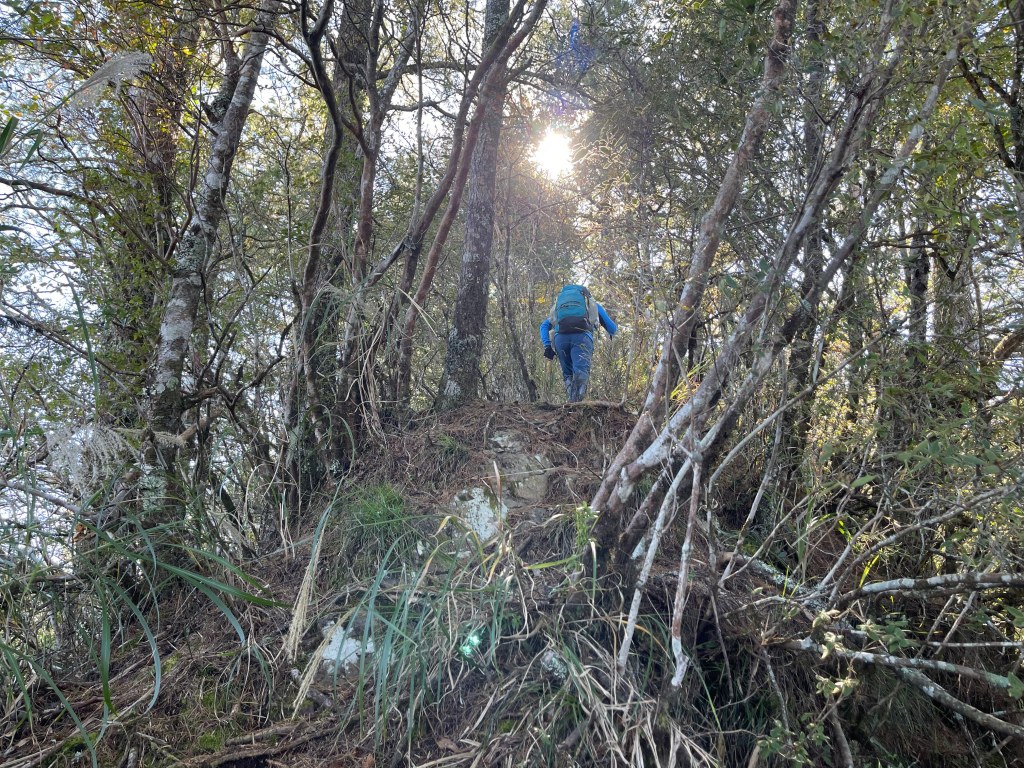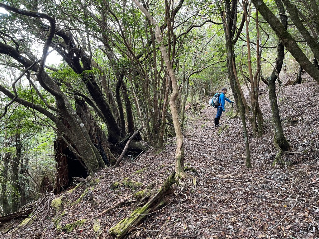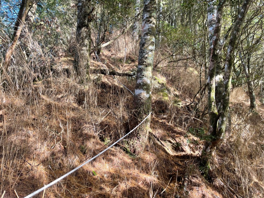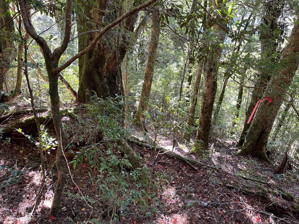 過2420峰前,都是優美平緩路徑,沒想到我們走了40分鐘後,突然發現Leo居然又從後面超過我們😧,原來他沒在看GPS,剛剛不小心走錯了一段路徑,發現沒路了才拿出GPS修正路線。再來會經過L型長板凳休息區,這裡往左岔就是以前往大霸尖山的路徑,我們要往右下走。