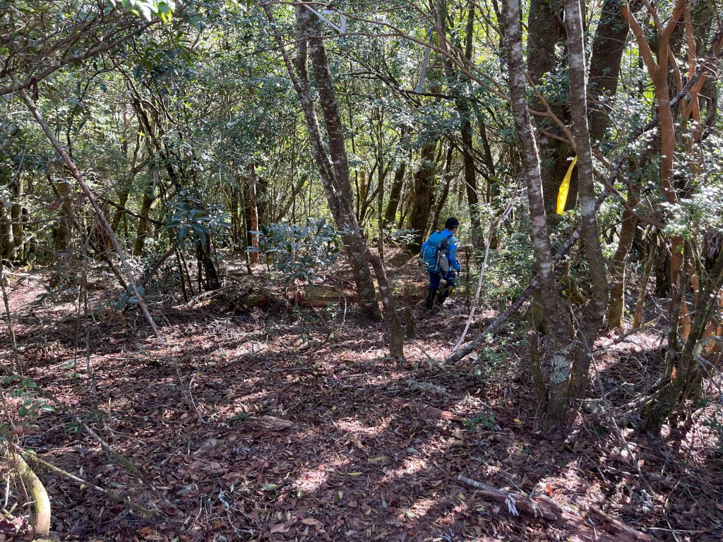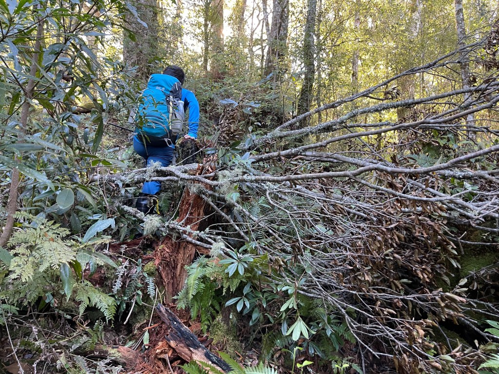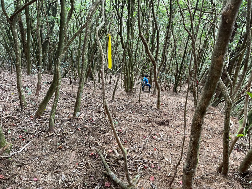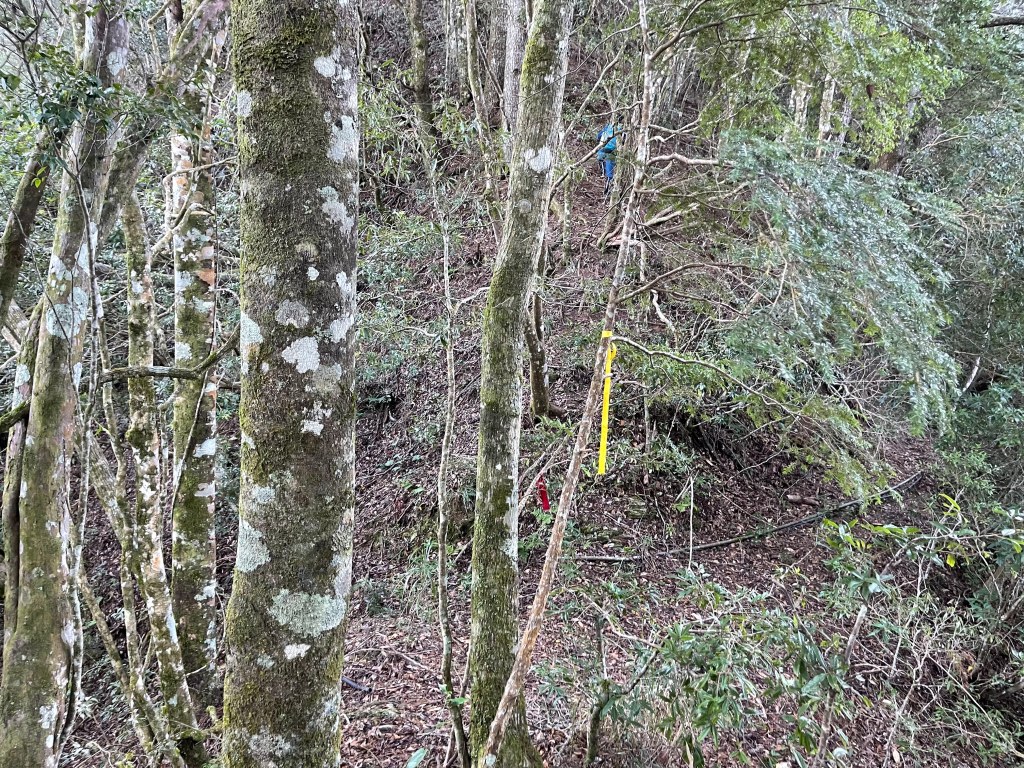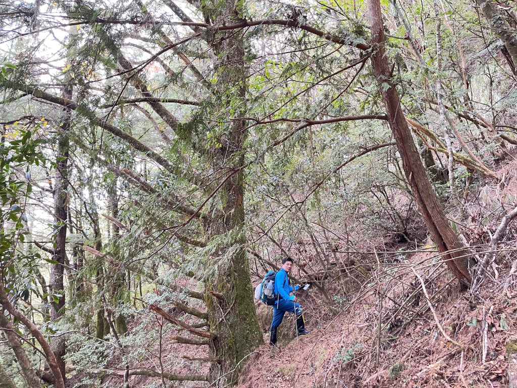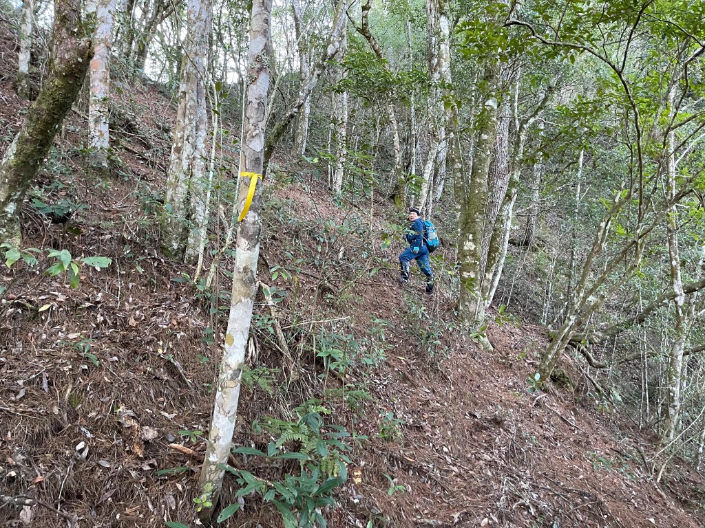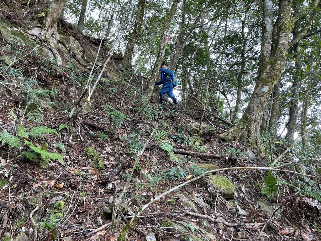過2420峰前,都是優美平緩路徑,沒想到我們走了40分鐘後,突然發現Leo居然又從後面超過我們😧,原來他沒在看GPS,剛剛不小心走錯了一段路徑,發現沒路了才拿出GPS修正路線。再來會經過L型長板凳休息區,這裡往左岔就是以前往大霸尖山的路徑,我們要往右下走。