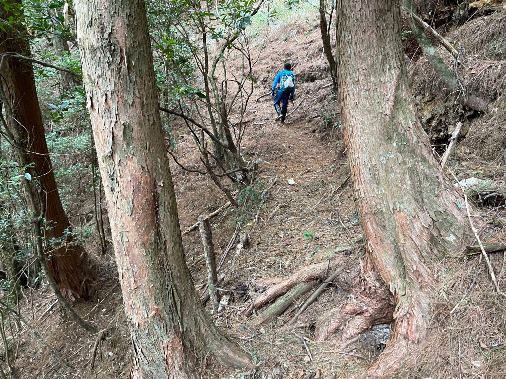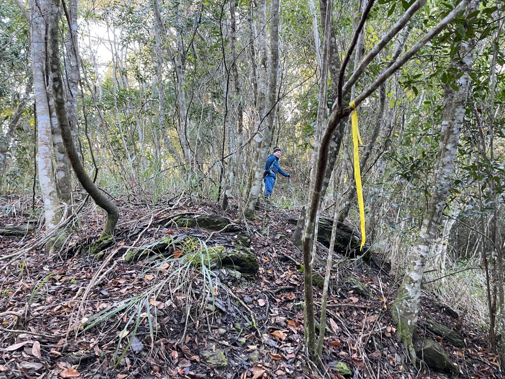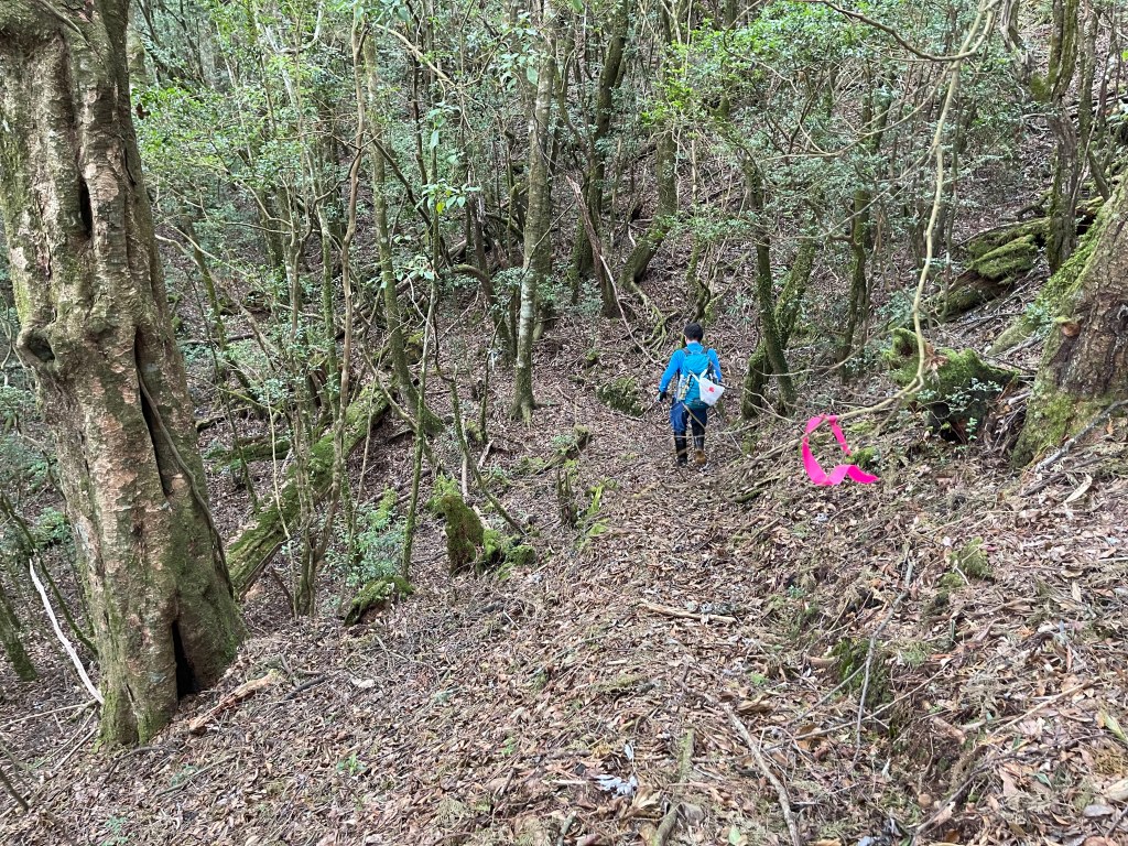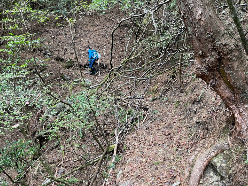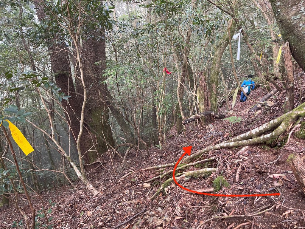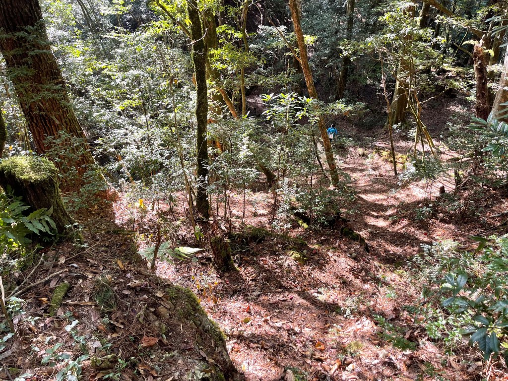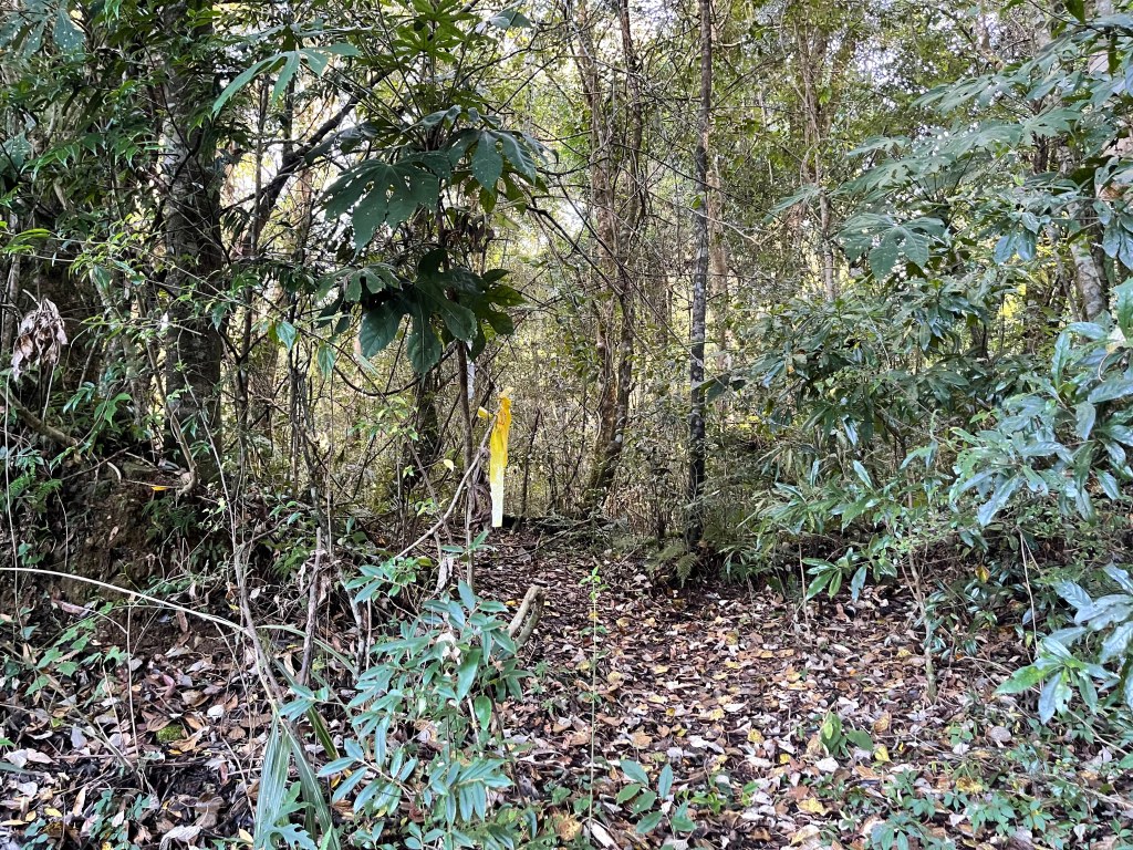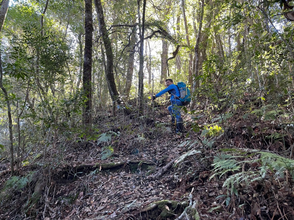 過2420峰前,都是優美平緩路徑,沒想到我們走了40分鐘後,突然發現Leo居然又從後面超過我們😧,原來他沒在看GPS,剛剛不小心走錯了一段路徑,發現沒路了才拿出GPS修正路線。再來會經過L型長板凳休息區,這裡往左岔就是以前往大霸尖山的路徑,我們要往右下走。