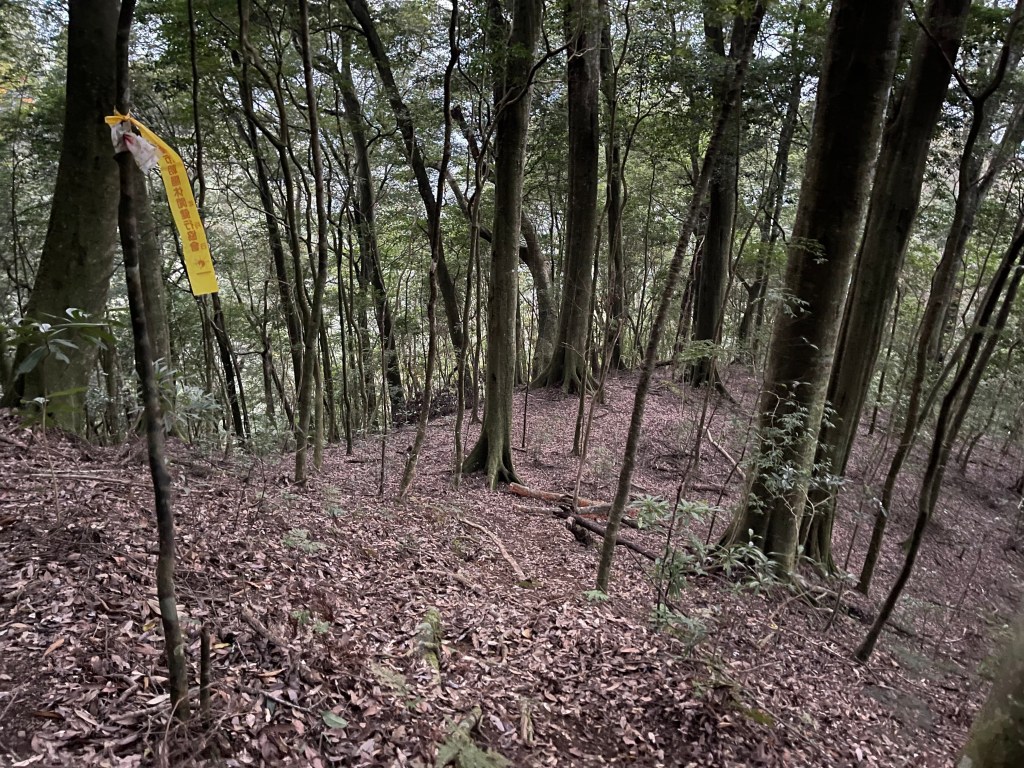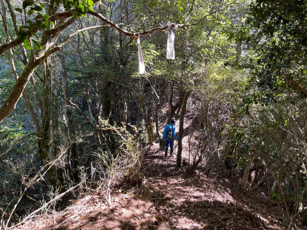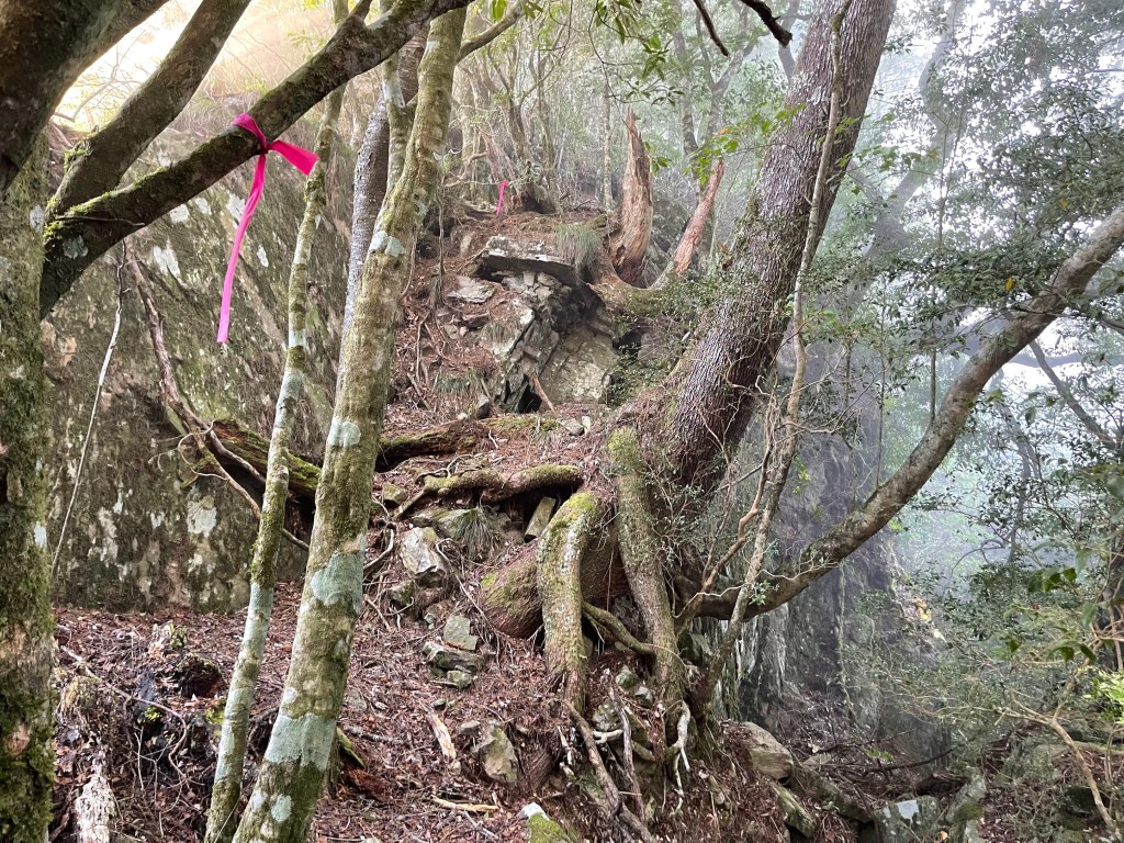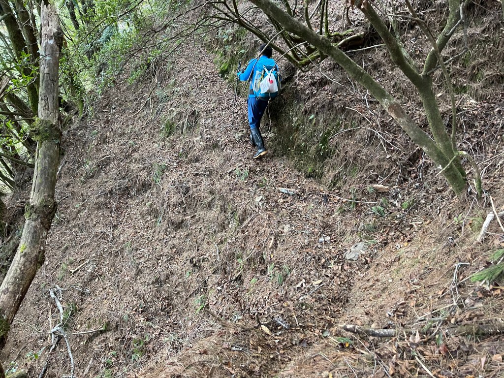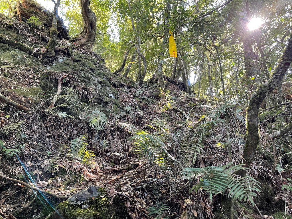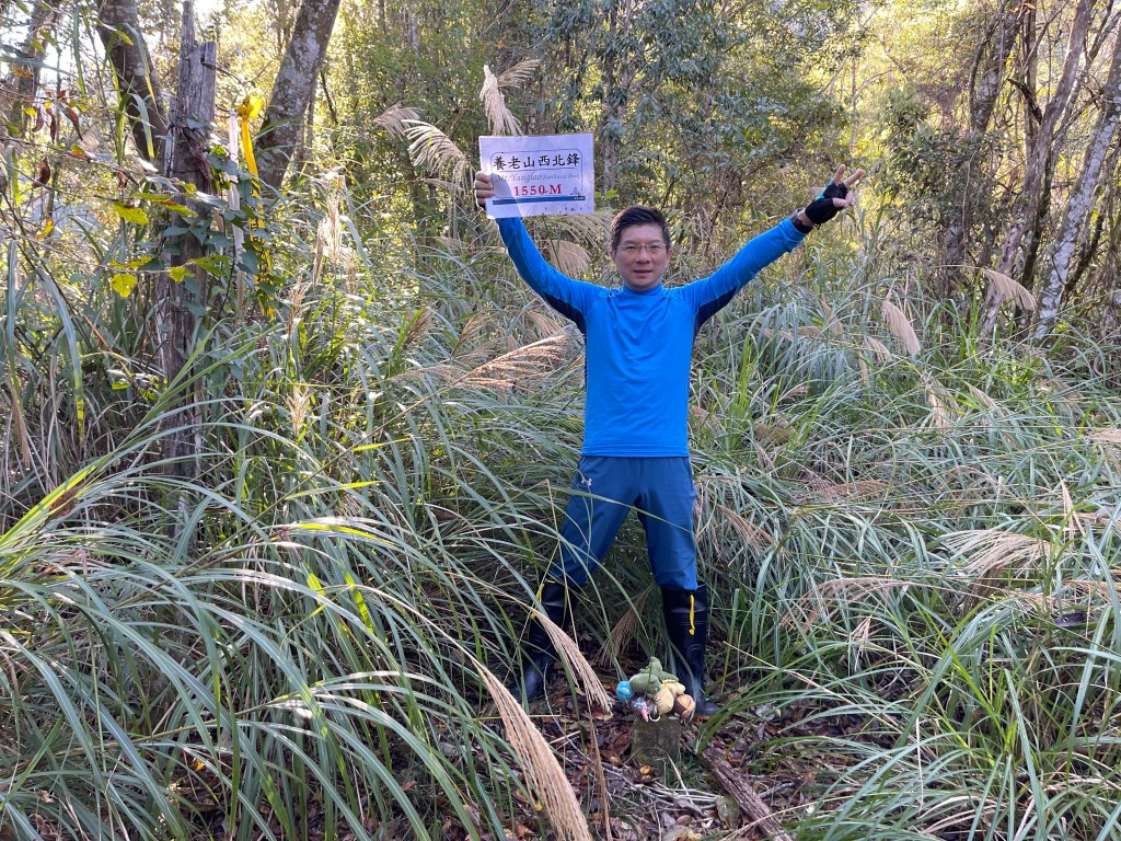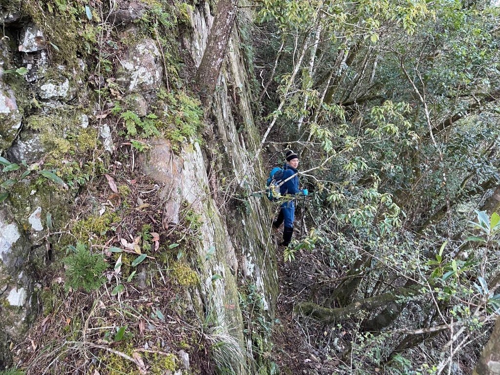 由霞喀羅古道養老端7.5K里程碑處,往左看著陡峭原始山壁,就是我們要起登養老山西北峰的入口,一陡上,就會發現路徑極其原始,雖然偶有登山布條,但就不像是路徑的路徑,極滑且無踏點,手腳併用就對!陡上一段後,布條變得較少,所以,就沿著稜線而上就是,越靠近西北峰,路徑與布條轉為清楚,快到了養老山西北峰前,就已經聽到正在追我們的Leo的么喝聲。由此,在養老山西北峰開始三人一起同行,繼續往前200m,就接上菜園產業道路,3.3K後抵產業道路盡頭,就是養老山的登山口。