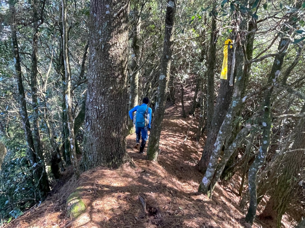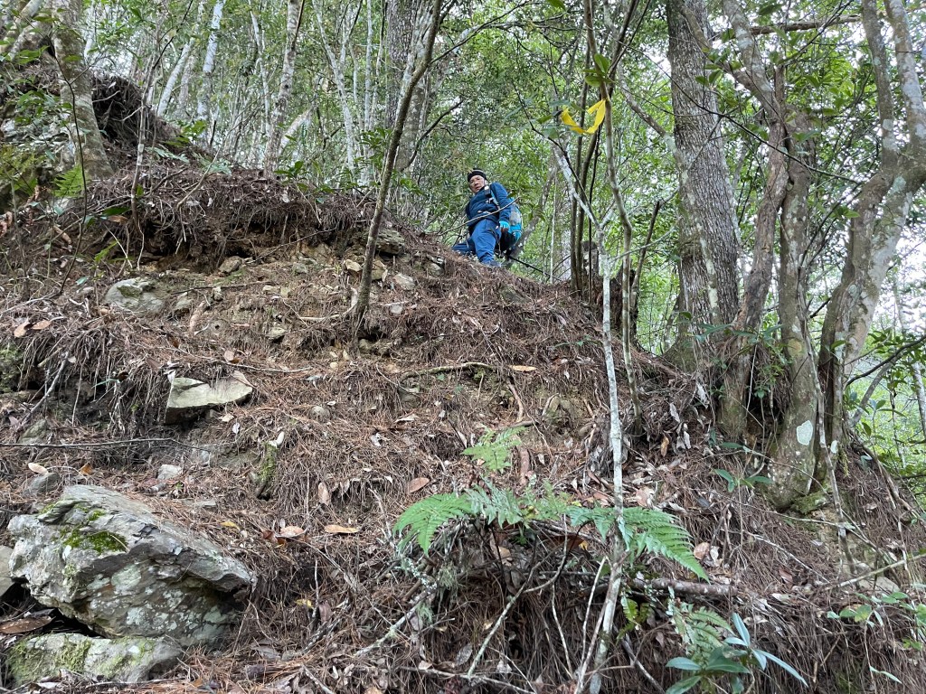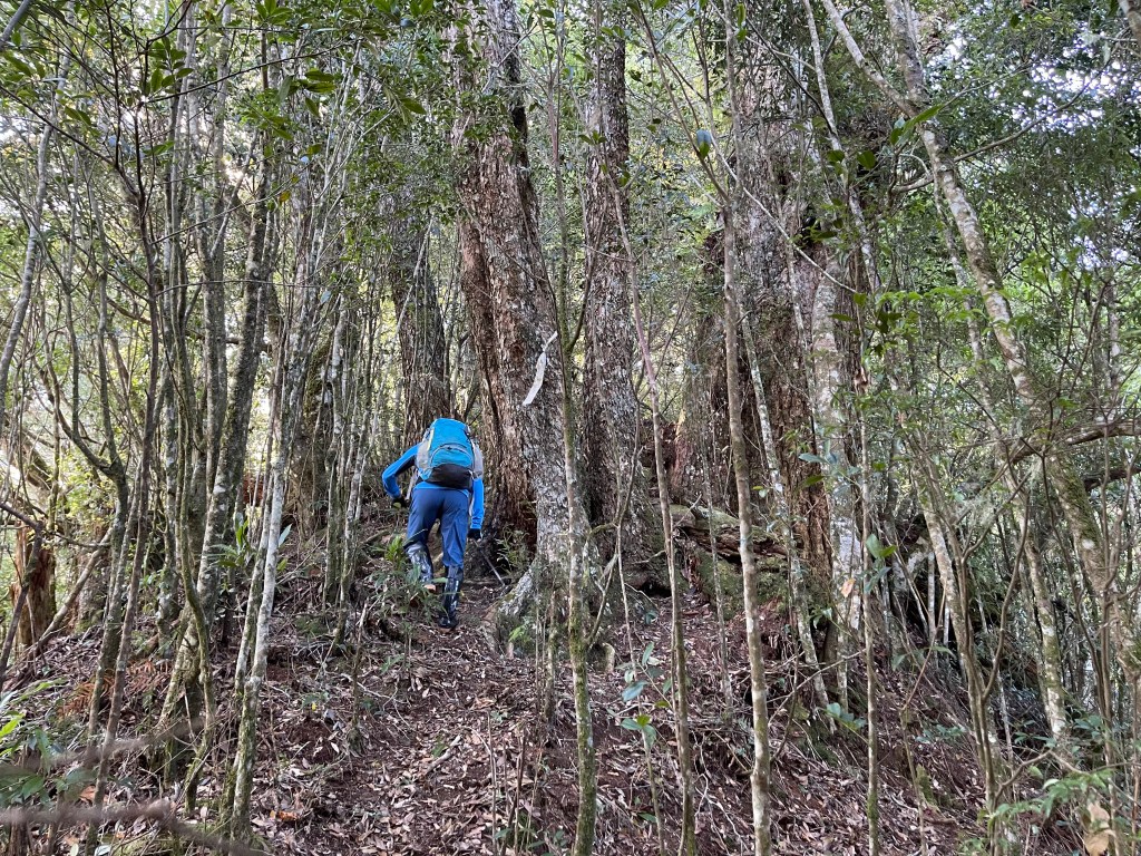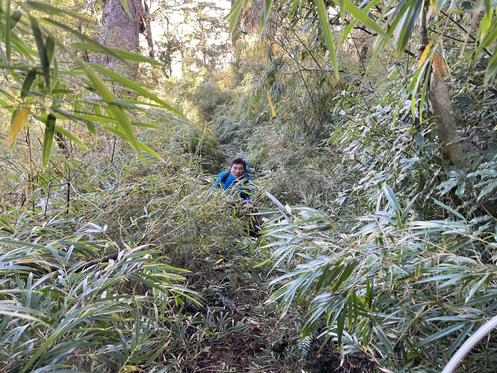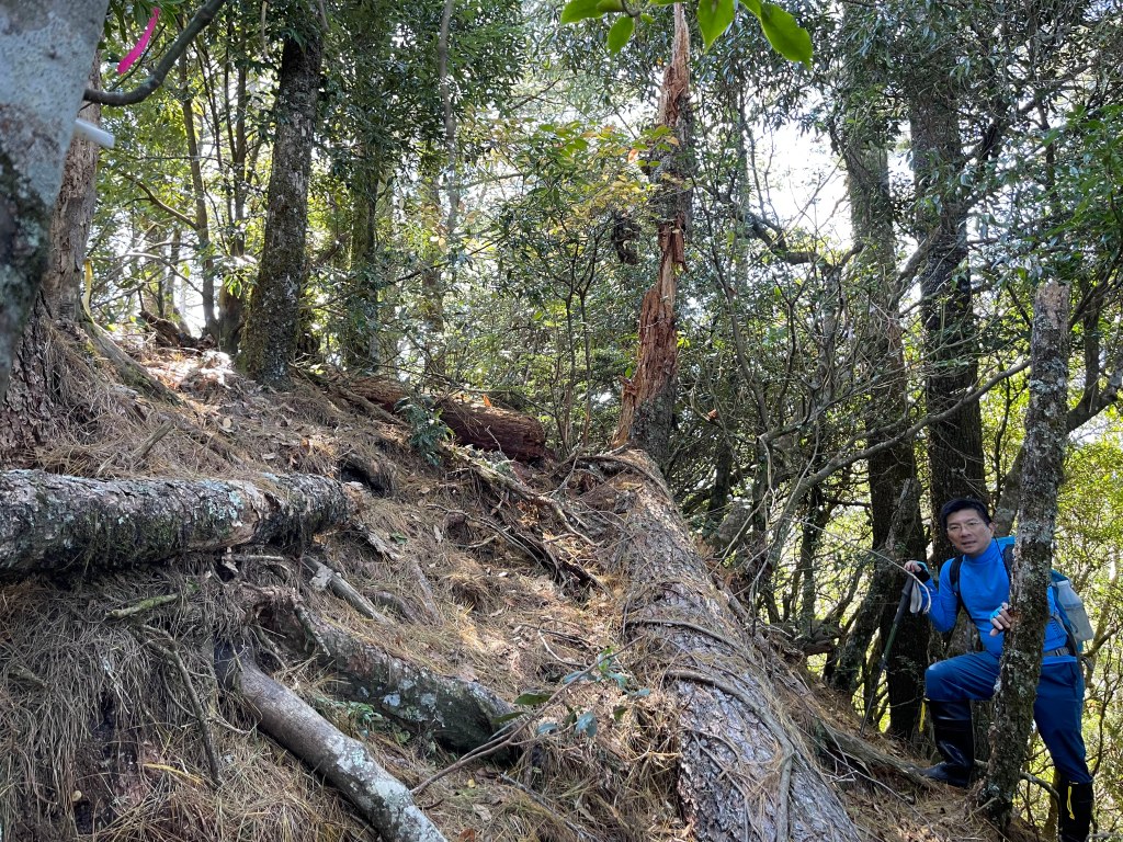 繼續往基那吉山前進,需要2.6K的距離。一開始就是一路的陡下約海拔80m,接上平緩的松針路徑,再來就是上瘦稜陡上至2240峰,這一段陡上的瘦稜有點危險,左側還偶有樹幹可扶,右側是極深的斷崖,一定要注意一下步伐!過了2240峰,瘦稜路徑轉為寬大緩下到了鞍部,此時Leo又說:他要先到基那吉山幫我們煮水泡麵?我幫他翻譯:意思就是,你們太慢啦!就聽到Leo說,要採終極大絕招!!接著就脫掉上衣,赤膊背上背包,一溜煙的跑得不見人影!我們兩個看得目瞪口呆😳。再來,路徑轉為陡陡的上,一段後,來到十字路口,往左岔路可往鎮西堡,前走20m,往左接基那吉山,往右是可不經過基那吉山的腰繞路,我們往左繼續走,陡上游入箭竹林,當脫離箭竹林時,基那吉山就到了。