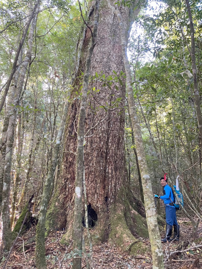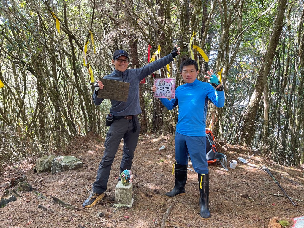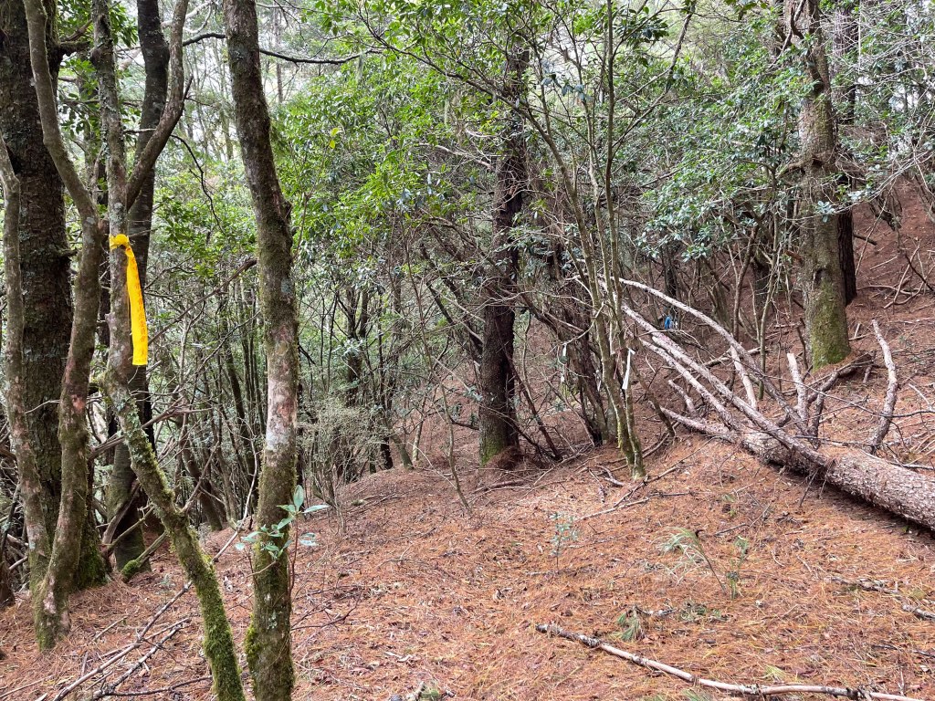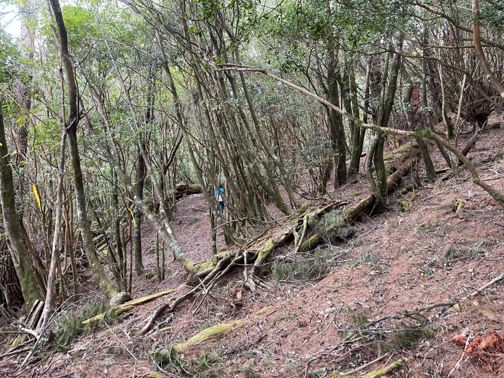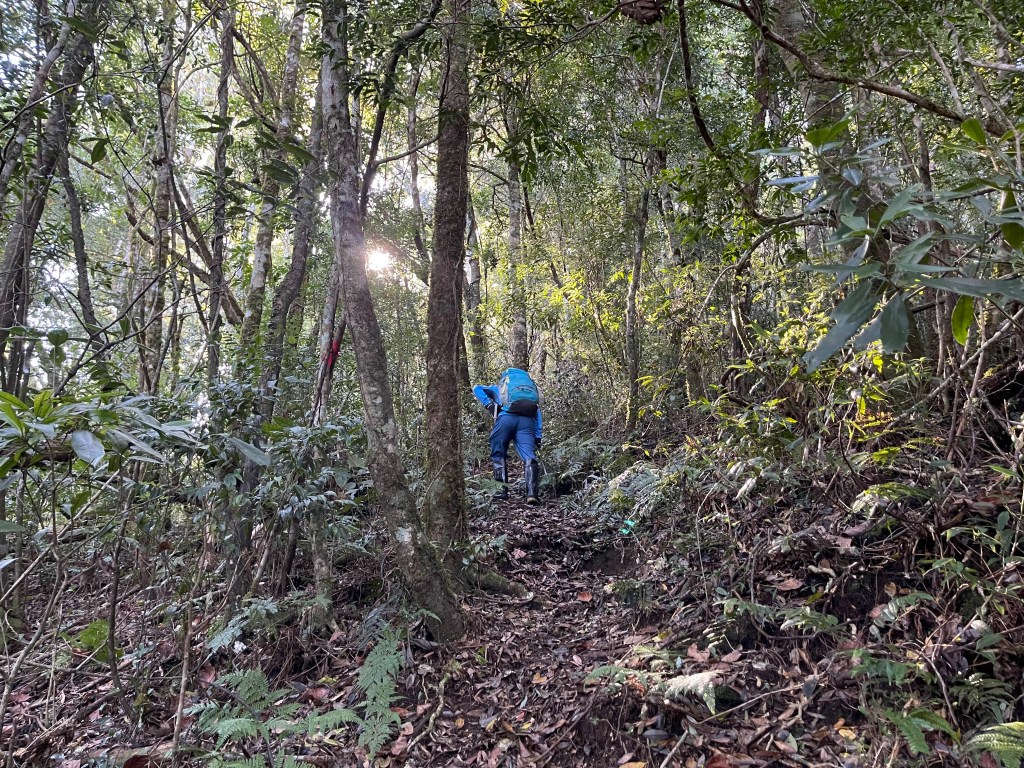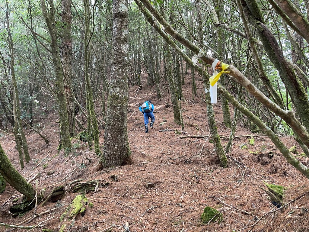 繼續往基那吉山前進,需要2.6K的距離。一開始就是一路的陡下約海拔80m,接上平緩的松針路徑,再來就是上瘦稜陡上至2240峰,這一段陡上的瘦稜有點危險,左側還偶有樹幹可扶,右側是極深的斷崖,一定要注意一下步伐!過了2240峰,瘦稜路徑轉為寬大緩下到了鞍部,此時Leo又說:他要先到基那吉山幫我們煮水泡麵?我幫他翻譯:意思就是,你們太慢啦!就聽到Leo說,要採終極大絕招!!接著就脫掉上衣,赤膊背上背包,一溜煙的跑得不見人影!我們兩個看得目瞪口呆😳。再來,路徑轉為陡陡的上,一段後,來到十字路口,往左岔路可往鎮西堡,前走20m,往左接基那吉山,往右是可不經過基那吉山的腰繞路,我們往左繼續走,陡上游入箭竹林,當脫離箭竹林時,基那吉山就到了。