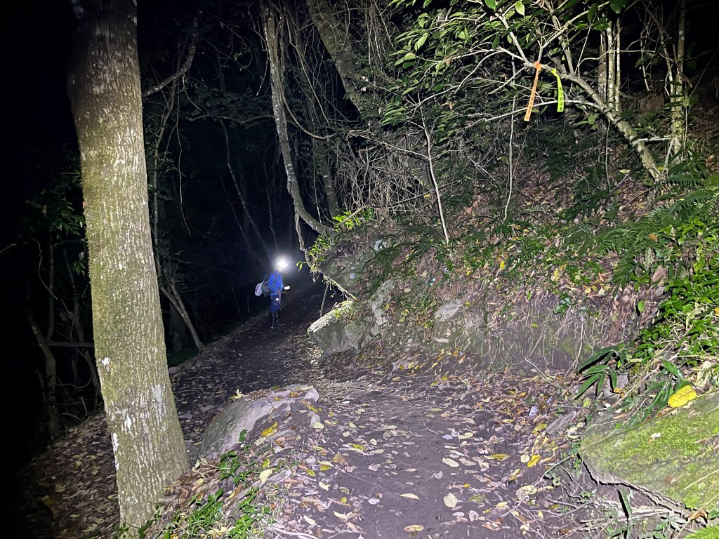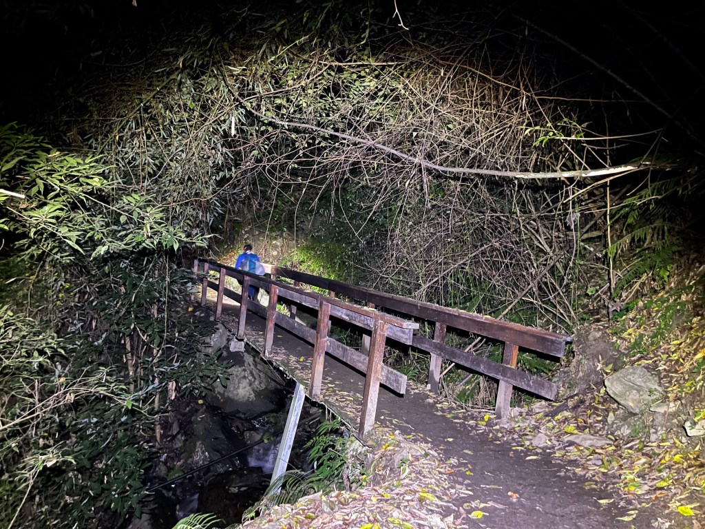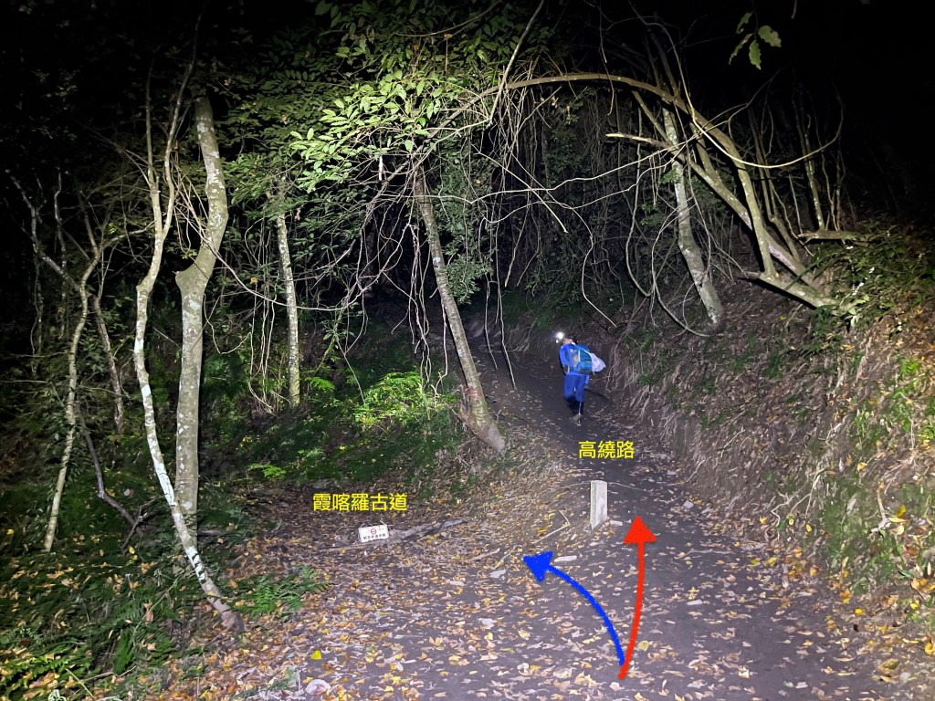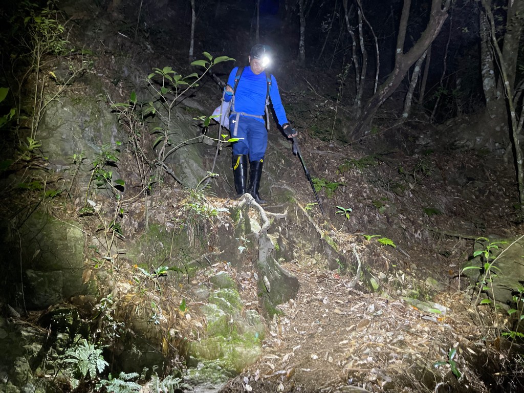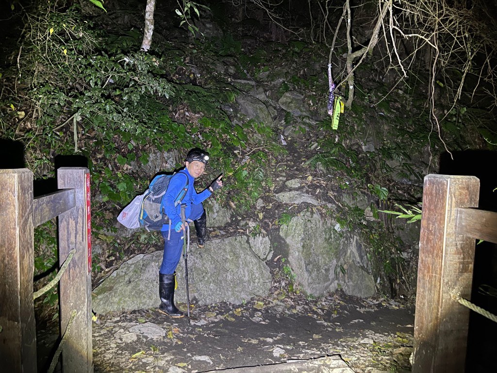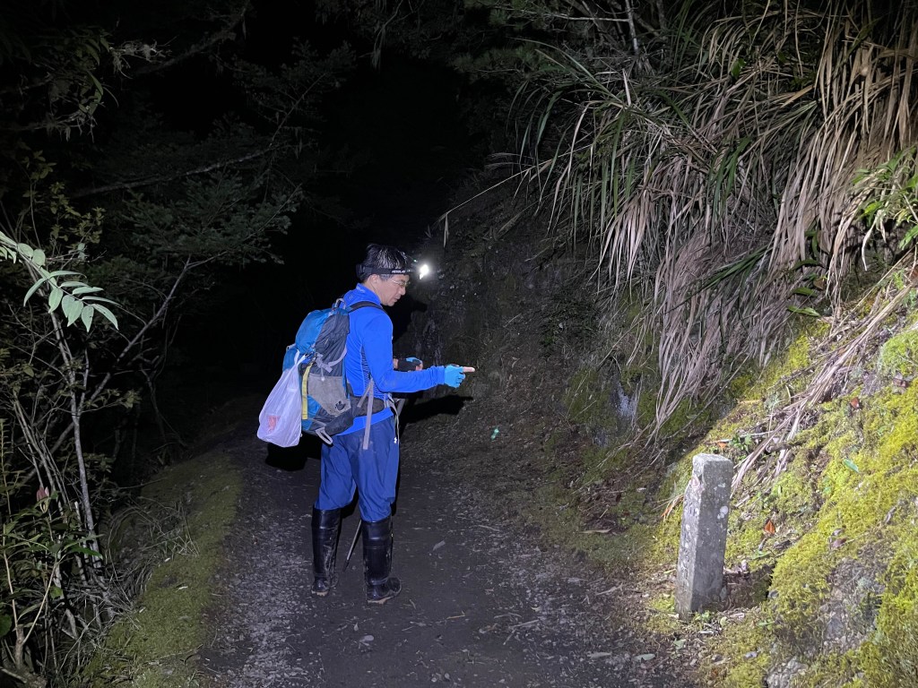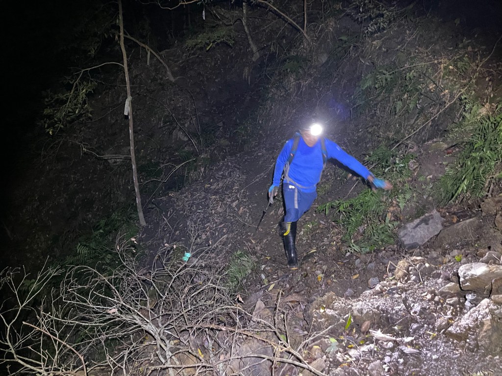Smile跟我都知道要摸黑,接下來到霞喀羅古道16K木棧橋處還有2K的距離,且一路陡下,我們兩人帶了一點小跑步的速度,走了1.2K後,天邊泛白但樹林內已經昏暗,拿出頭燈,開始放慢速度,走這溼滑的0.8K,陡下至過溪後100m,就接上霞喀羅古道16K的木棧橋,此時已接近晚上六點,冬天的晚間六點已然全黑。