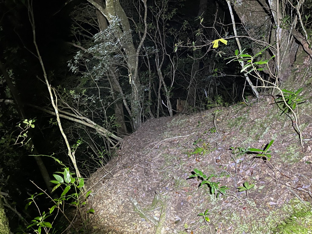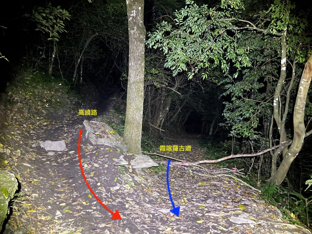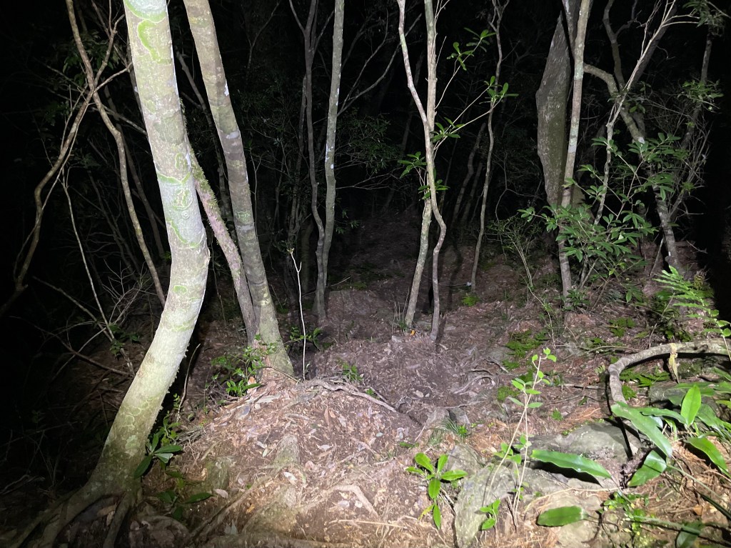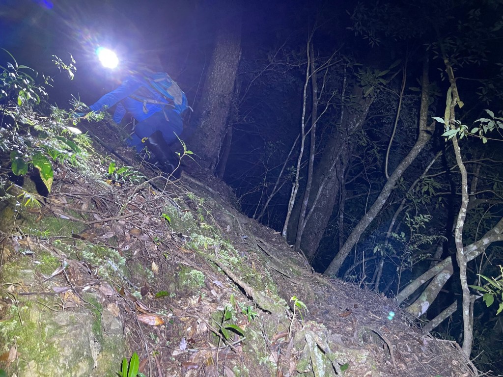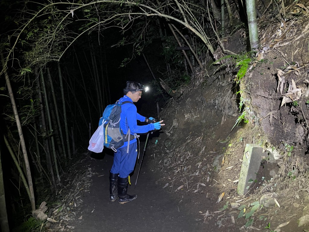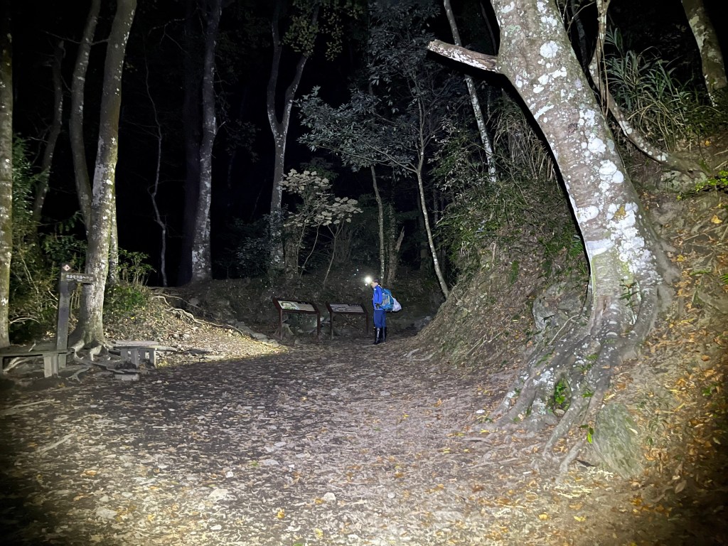 Smile跟我都知道要摸黑,接下來到霞喀羅古道16K木棧橋處還有2K的距離,且一路陡下,我們兩人帶了一點小跑步的速度,走了1.2K後,天邊泛白但樹林內已經昏暗,拿出頭燈,開始放慢速度,走這溼滑的0.8K,陡下至過溪後100m,就接上霞喀羅古道16K的木棧橋,此時已接近晚上六點,冬天的晚間六點已然全黑。